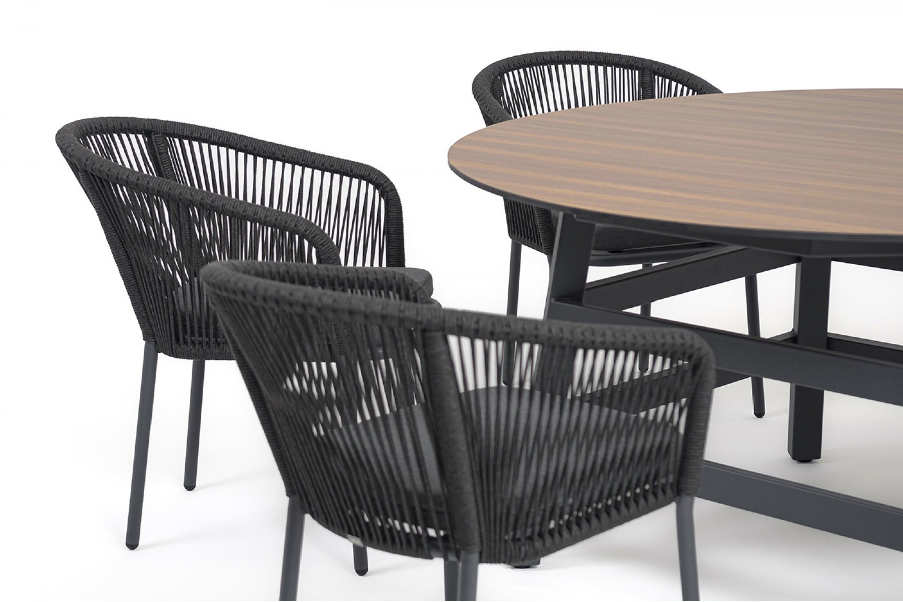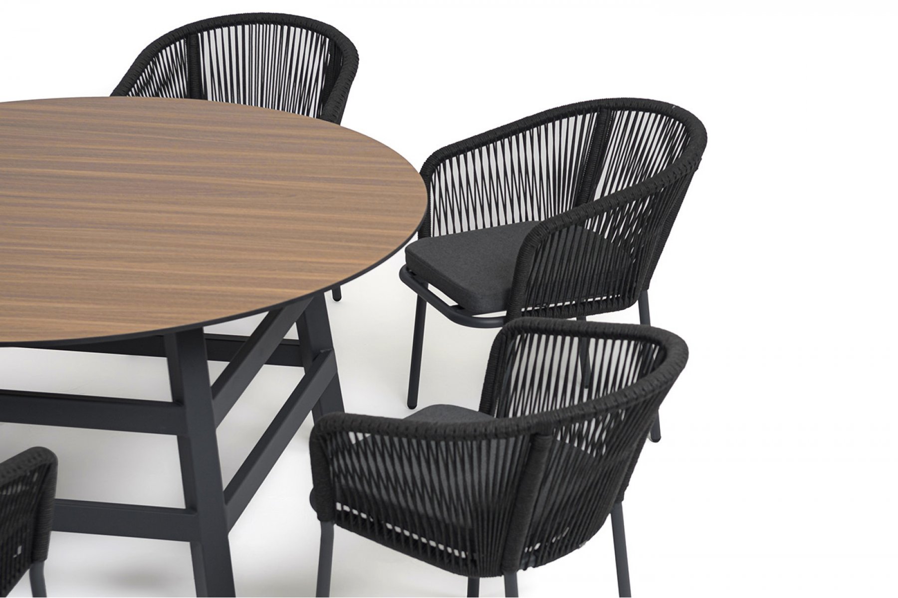 - 6 плетеных стульев «Марсель» из роупа, размером - 570×620×775 мм, цвет роупа - темно-серый, каркас из алюминия, окрашен порошковой краской в темно-серый оттенок. "Рио" стол из HPL круглый Ø160см, H75, цвет столешницы "дуб" 1шт. 1 600Х1 600Х750, "Марсель" стул плетеный из роупа, каркас алюминий темно-серый (RAL7024) муар, роуп темно-серый круглый, ткань темно-серая 027 6шт. 570Х620Х775,