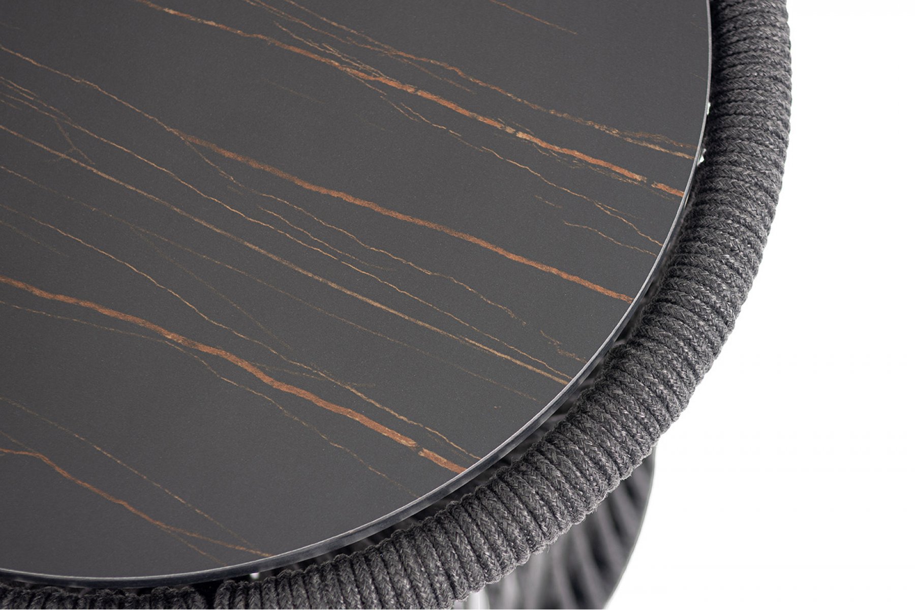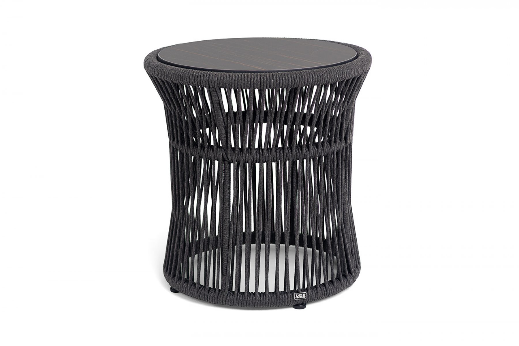 "Романо" журнальный стол из HPL круглый Ø45 H47, каркас из алюминия черный муар, цвет "черный мрамор", роуп темно серый круглый