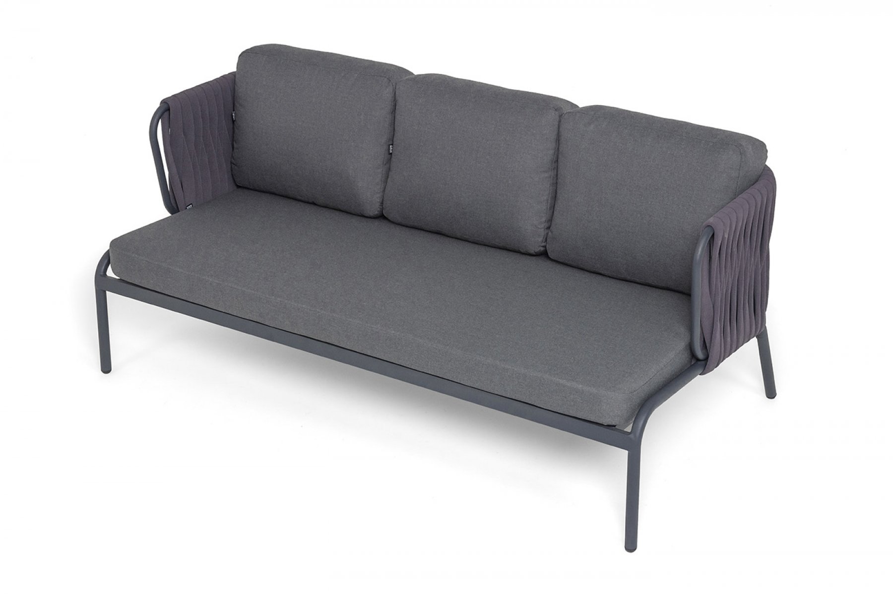 "Ронда" диван 3-местный плетеный из роупа, каркас алюминий темно-серый (RAL7024) муар, роуп серый 40 мм tex, ткань темно-серая 027