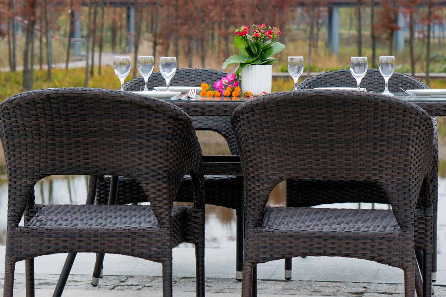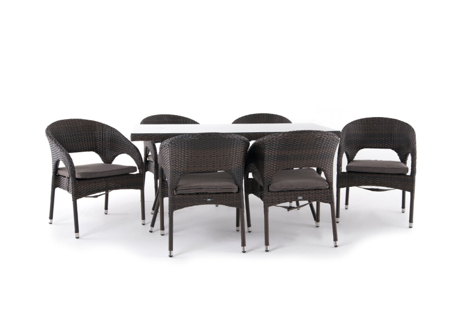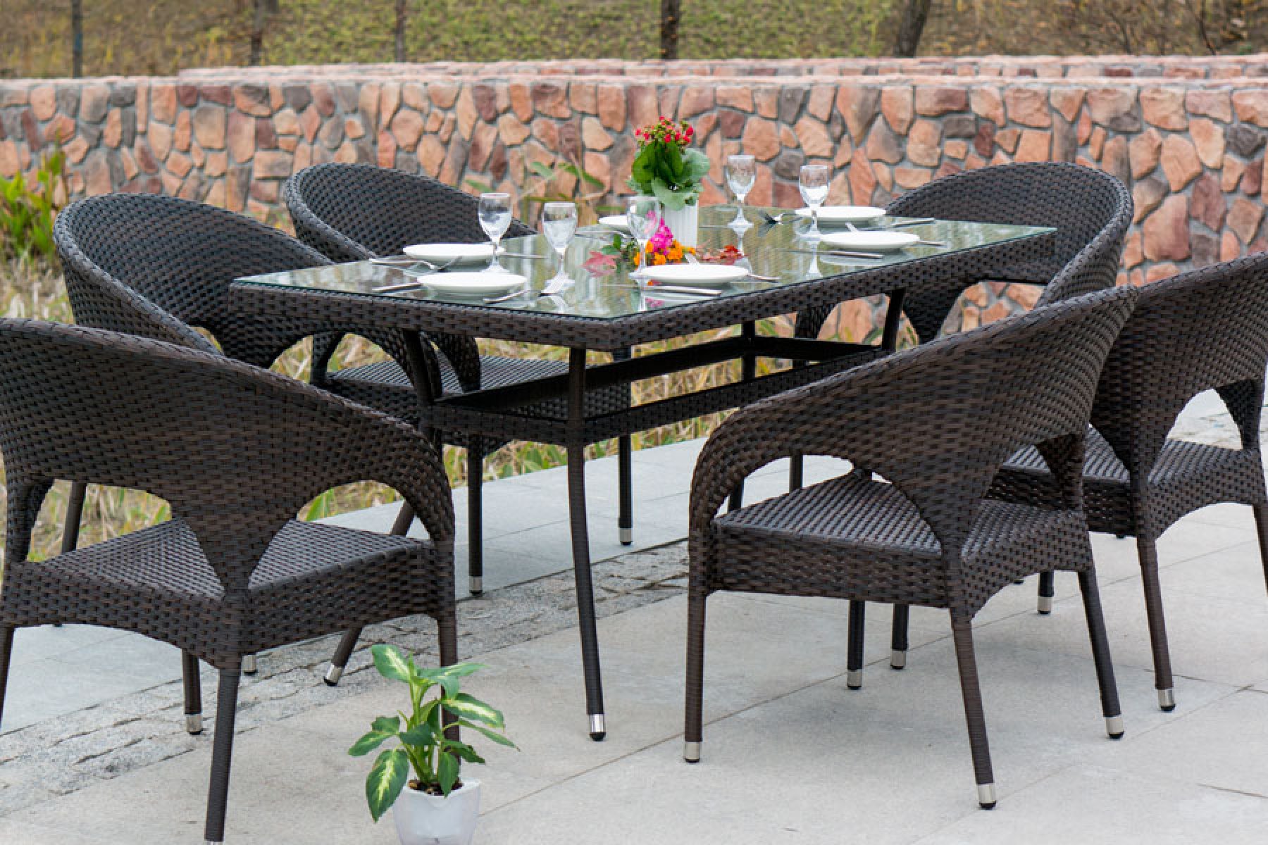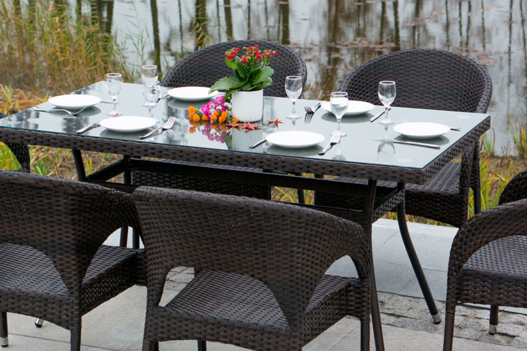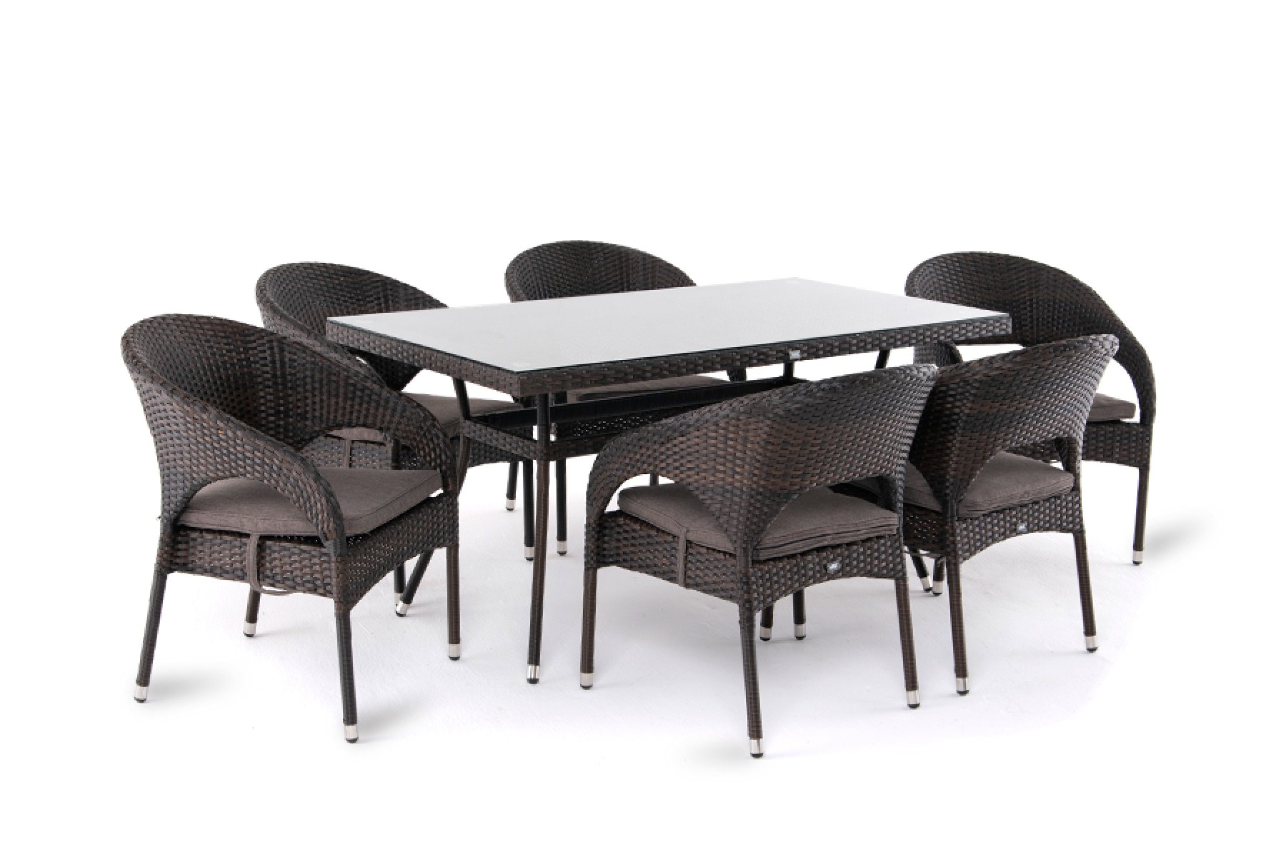 Обеденная группа Торре из искусственного ротанга: 6 кресел, обеденный стол со стеклянной столешницей. Алюминиевый каркас, круглый искусственный ротанг, ручное плетение. "Торре" стол коричневый, 1500*800*750 1шт. 1 500Х800Х750, "Корретто" Стул с подушкой, плоский искусственный ротанг, коричневый 6шт. 580Х630Х790,