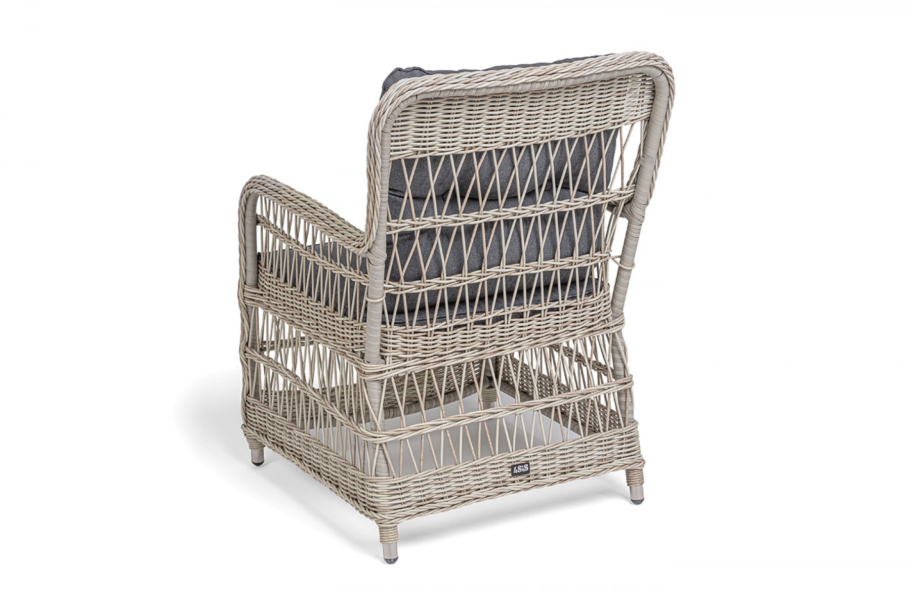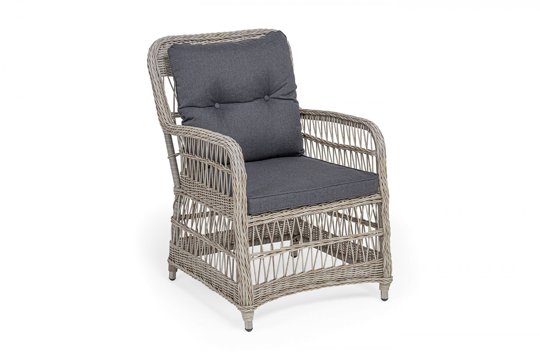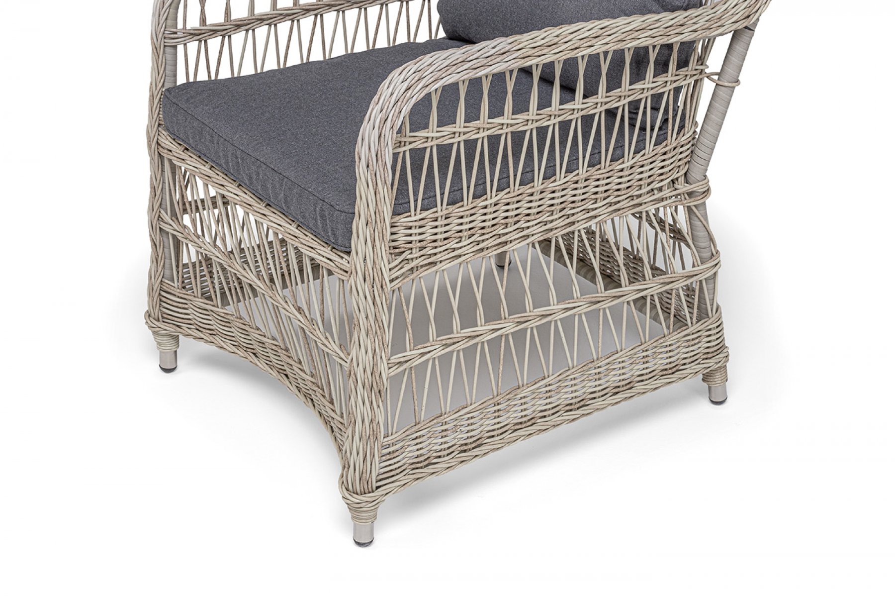 Алюминиевый каркас находится в основе мебели. Он характеризуется устойчивостью и высокой прочностью. Задекорирован ручной круглой оплеткой, которая сделана из искусственного ротанга. Представлена в бежевом оттенке.