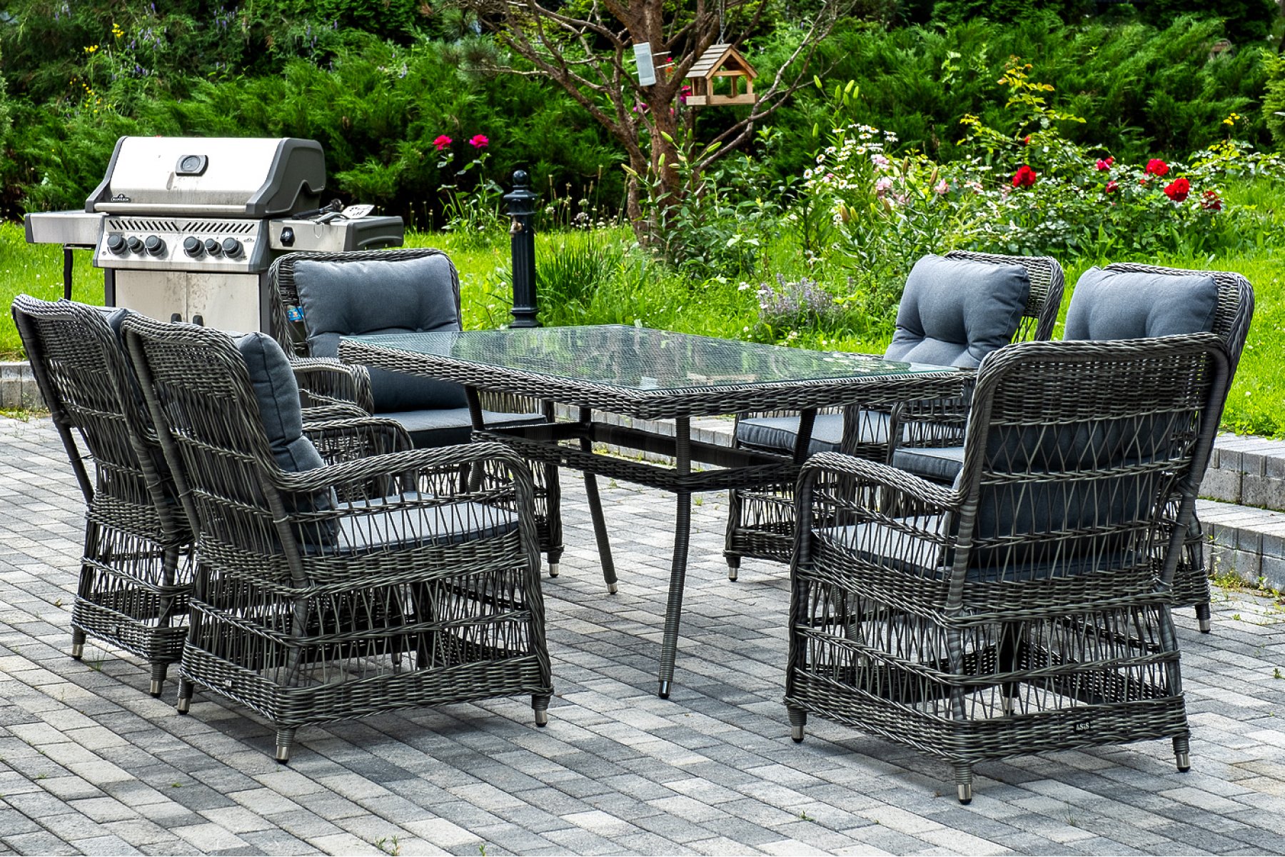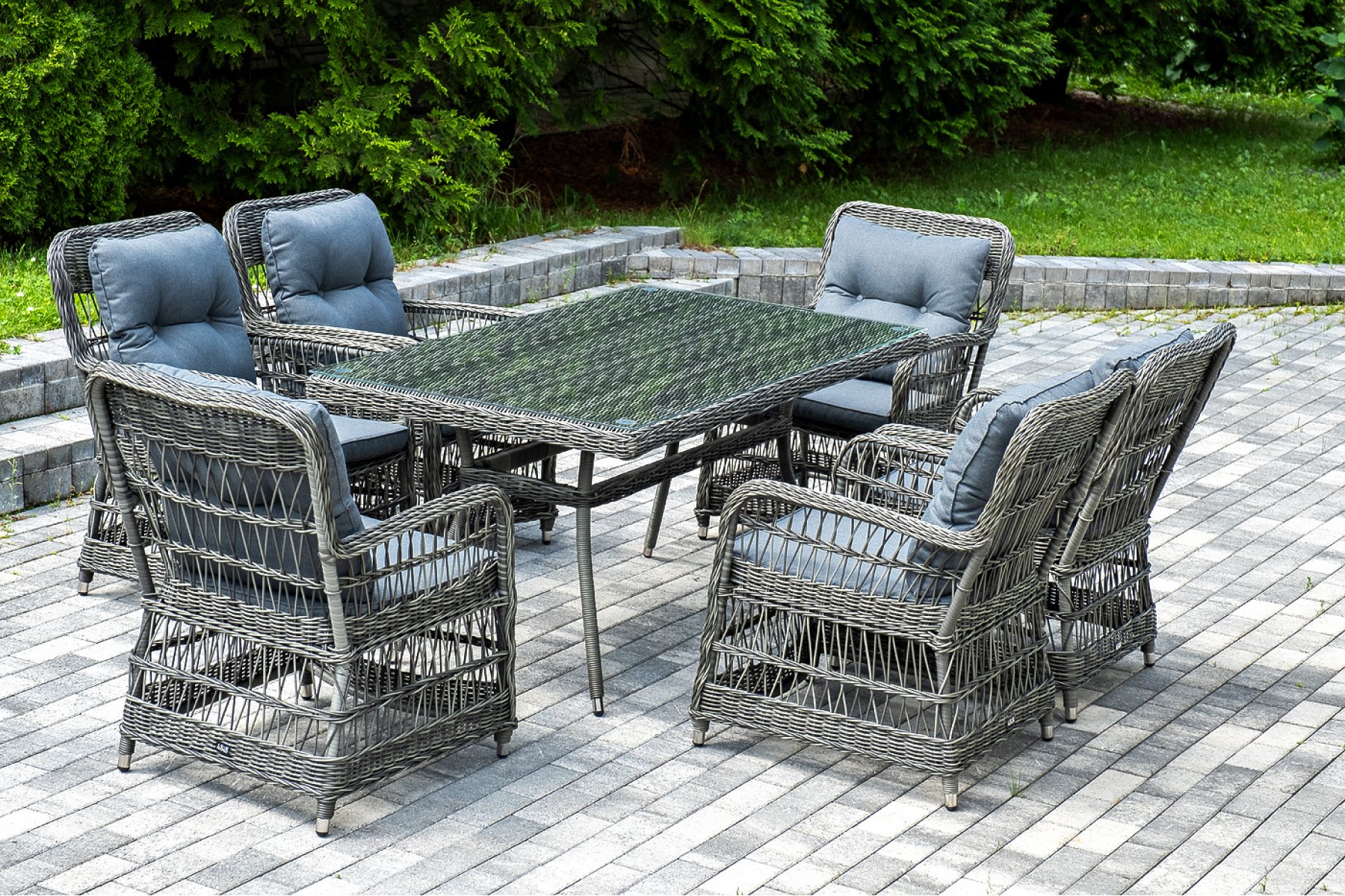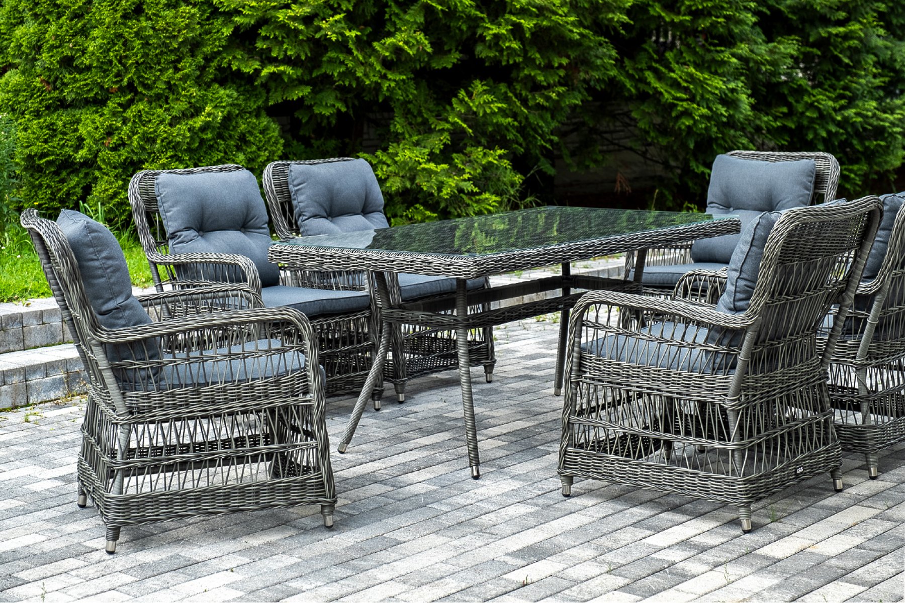 Садовая обеденная группа на 6 персон «Цесена» из ротанга. В комплекте: большой прямоугольный обеденный стол (1600×900×750 мм) и 6 кресел (600×800×910 мм).