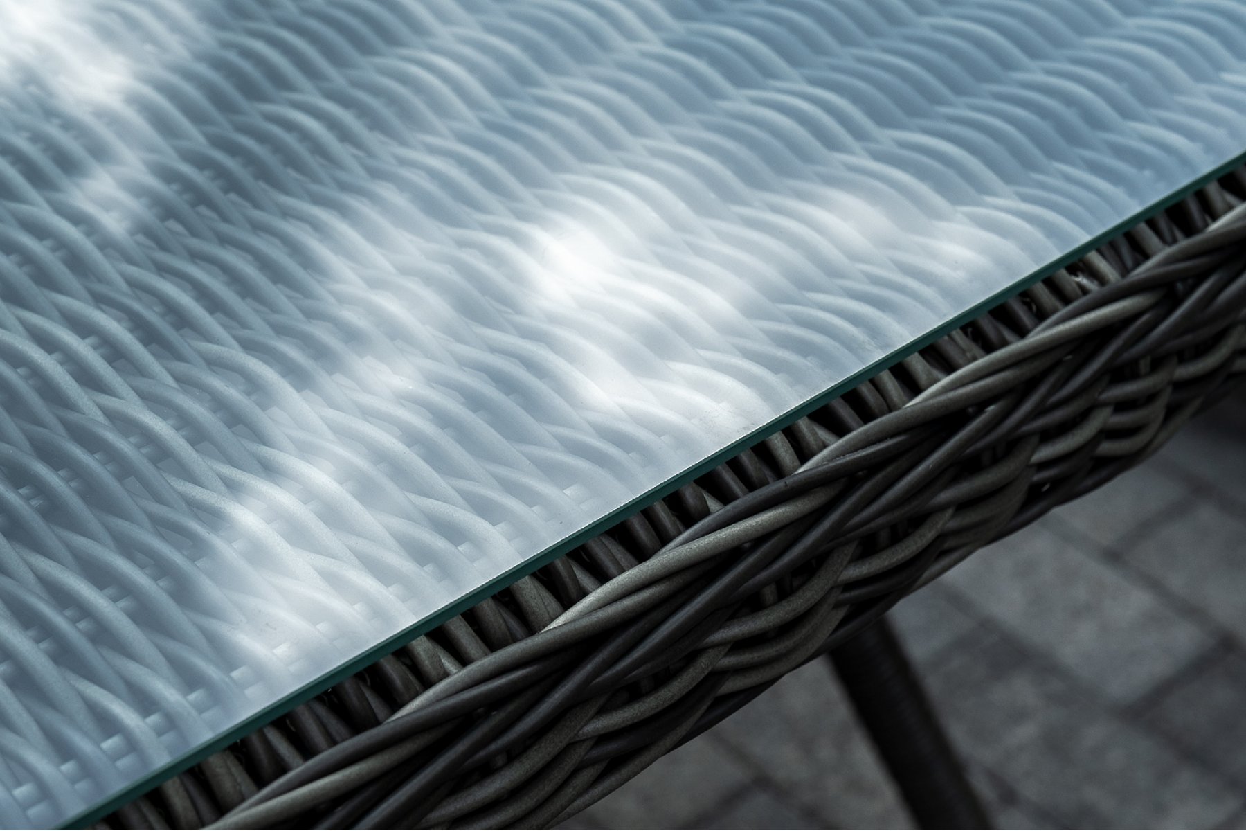 Вся мебель изготовлена из алюминия, вручную оплетенного круглым искусственным ротангом графитового оттенка. Столешница укомплектована ударопрочным стеклом, толщиной 5 мм. Данное стекло крепится к столу при помощи четырех вакуумных силиконовых присосок и поставляется в собранном виде.
