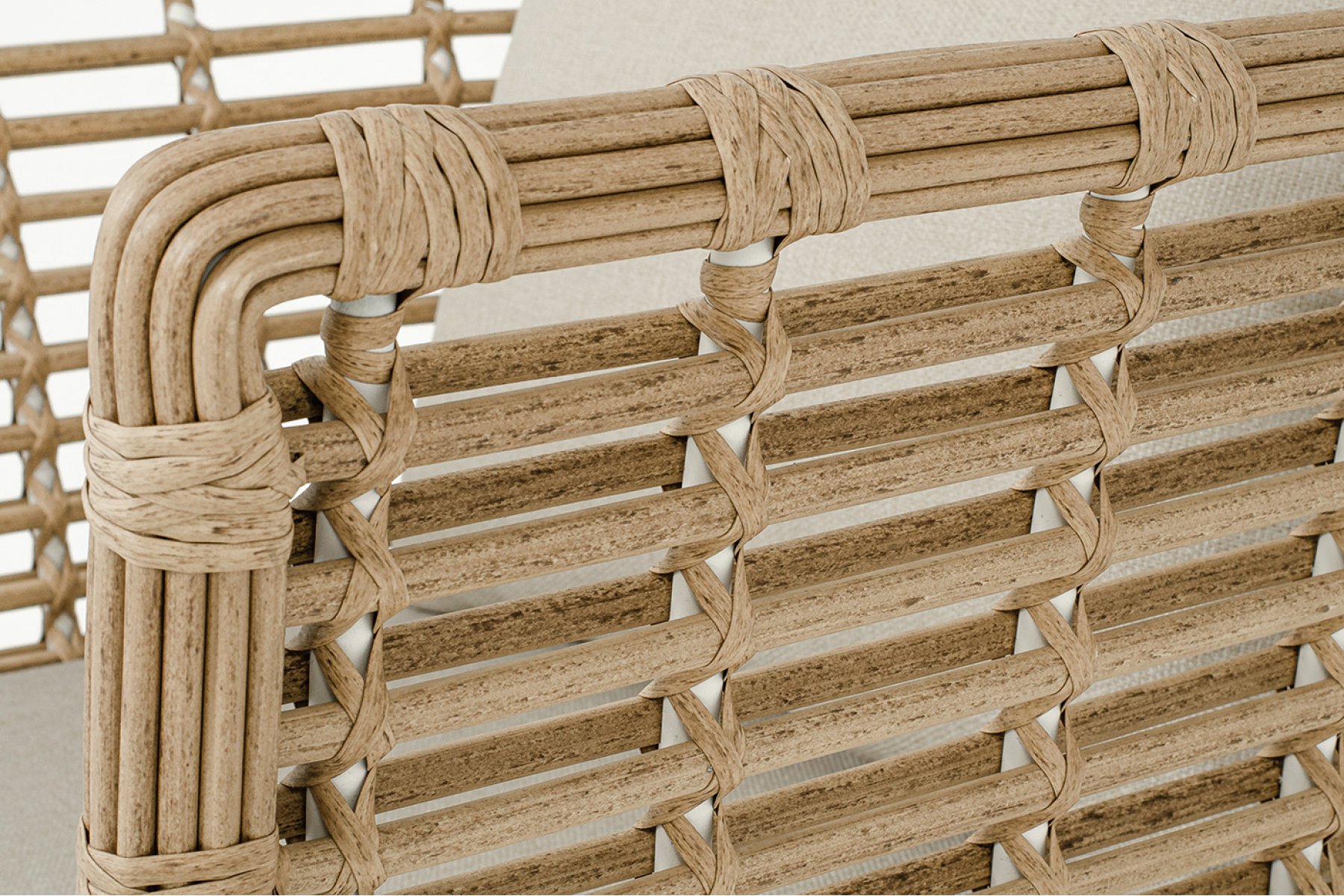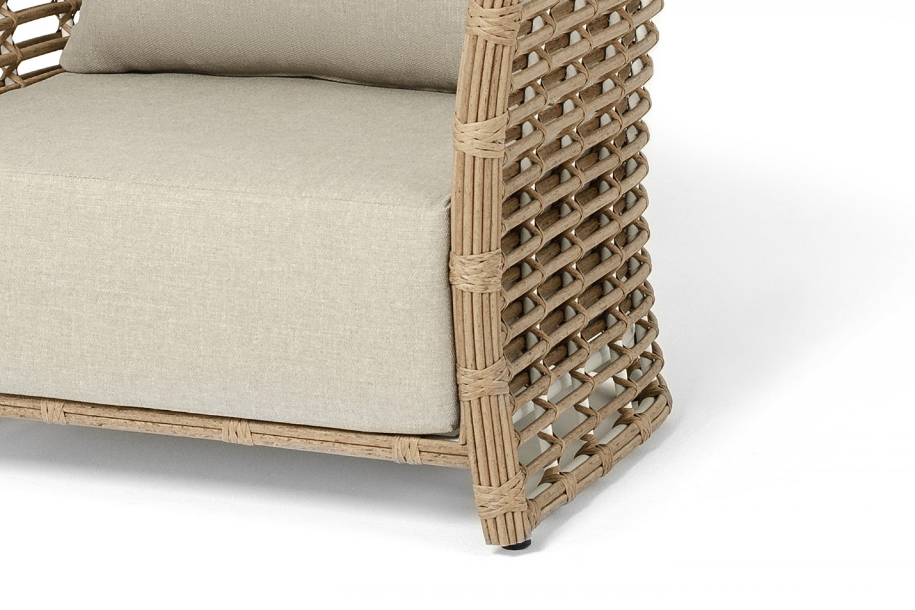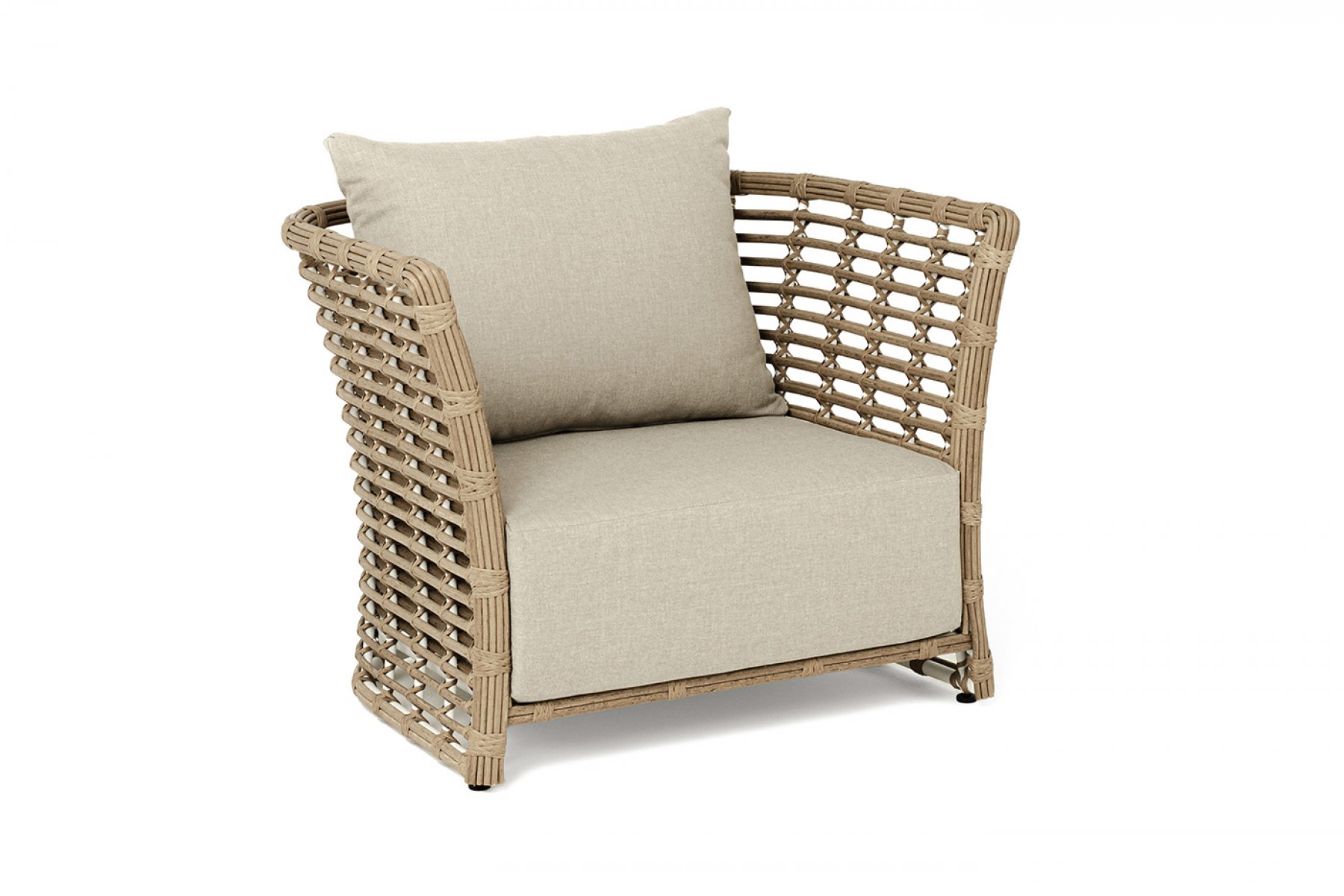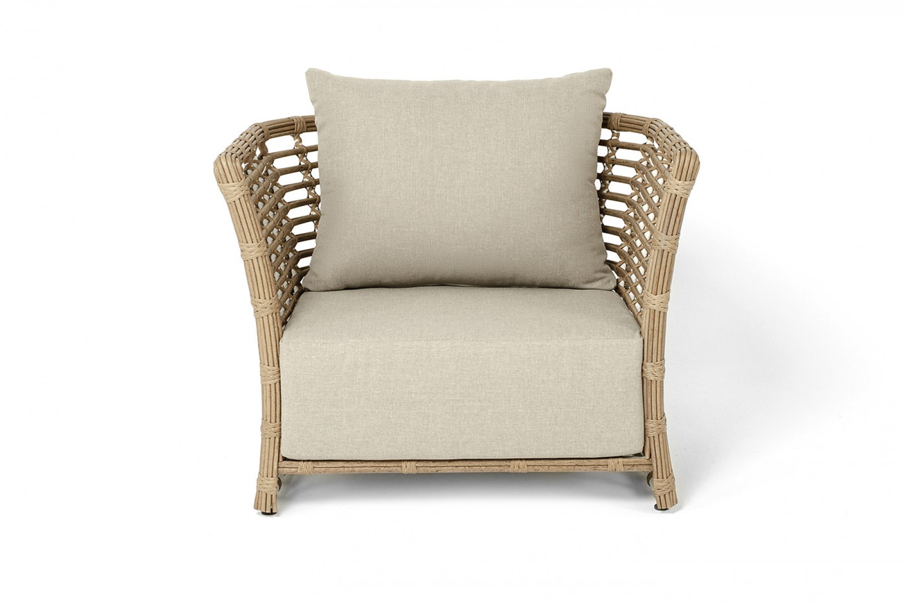 Кресло оснащено каркасом из прочного алюминия, ручное круглое плетение является основным декоративным элементом мебели. Оно выполнено из искусственного ротанга в соломенном цвете.