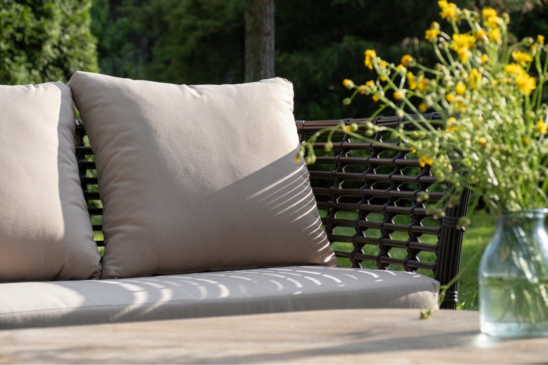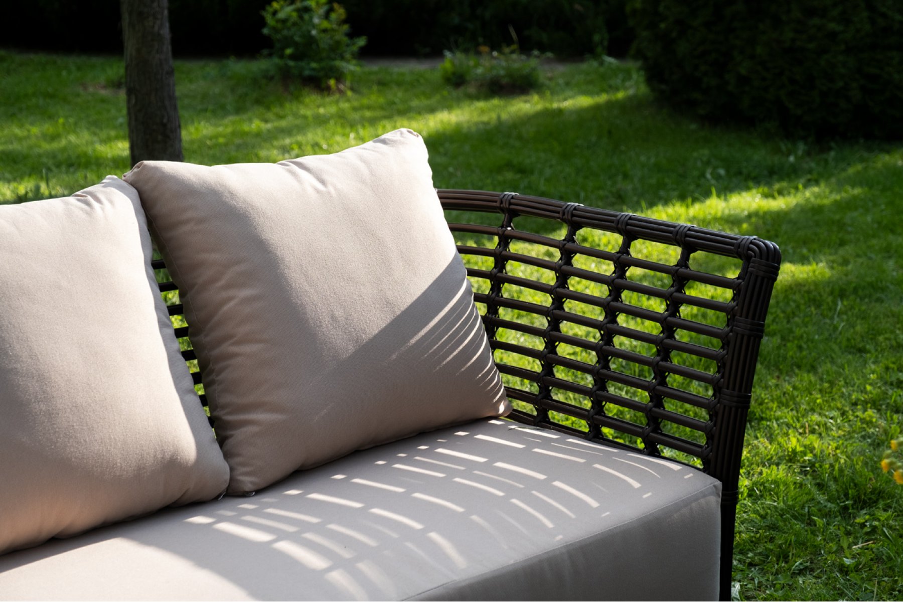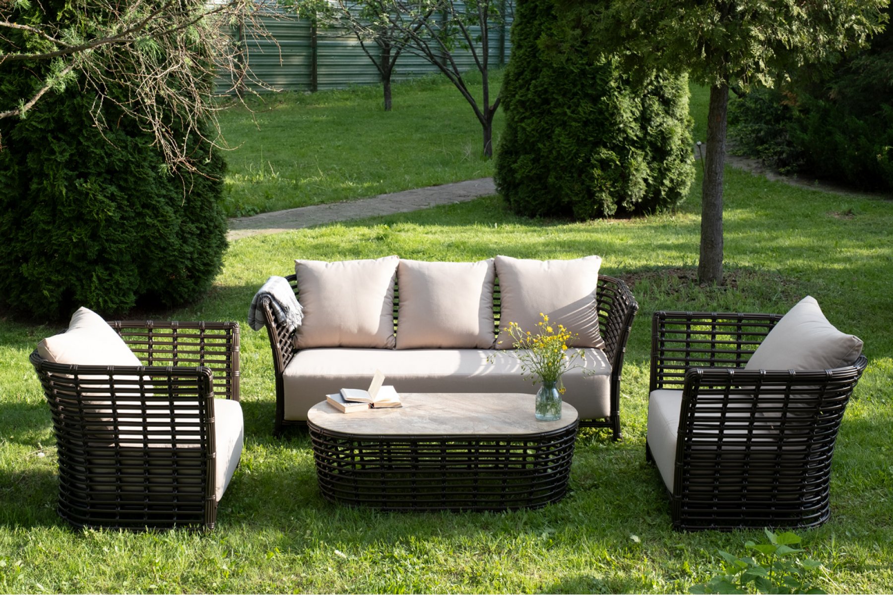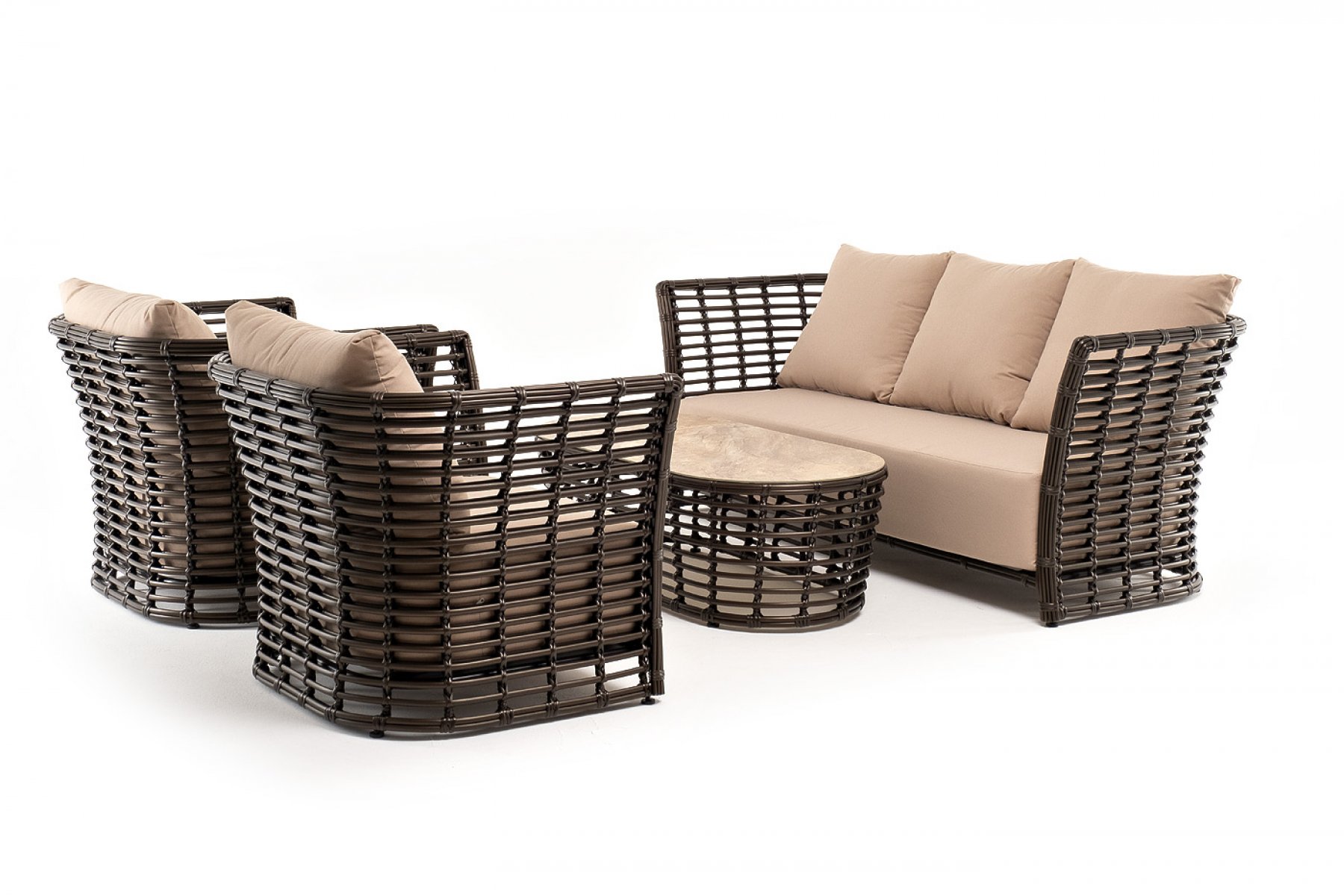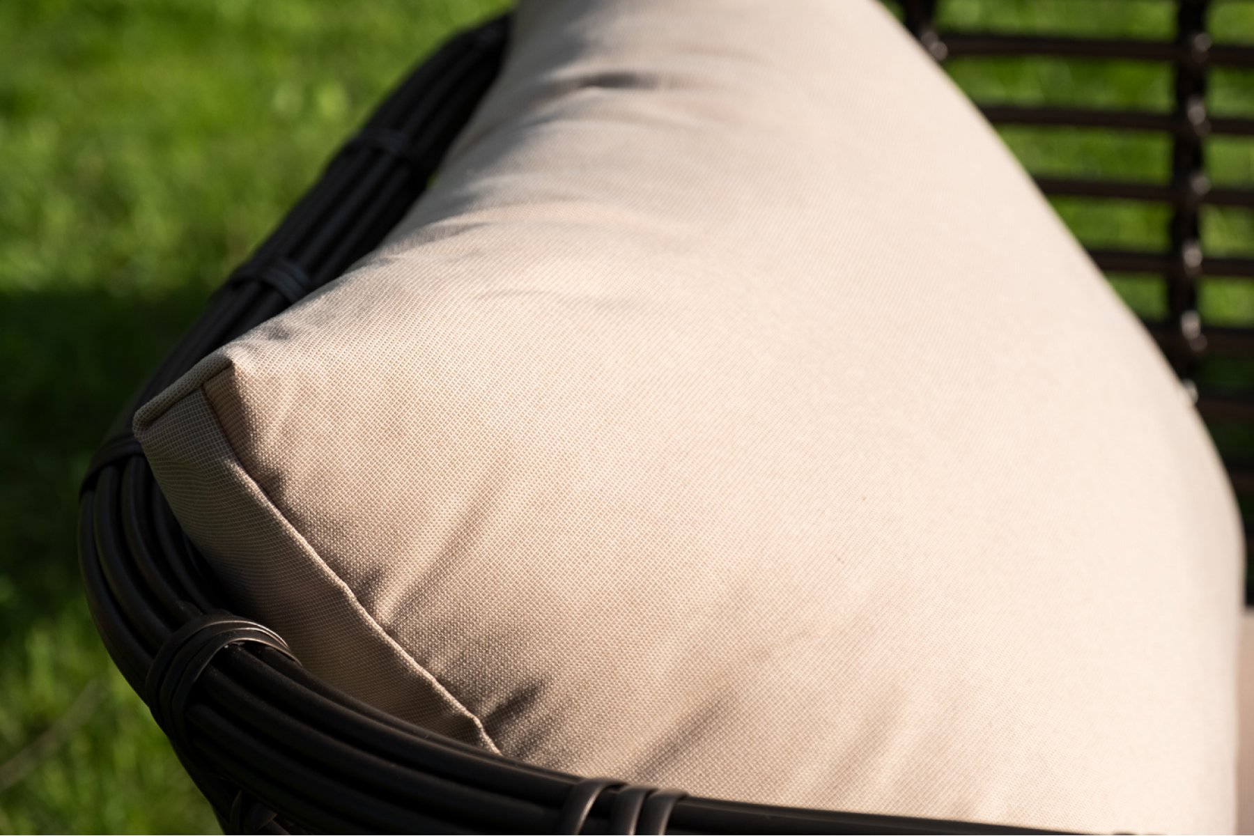 Плетеная мебель дополнена удобными подушками в бежевых чехлах. При их изготовлении используют полиэстер, плотность – 300гр/м2. Он обрабатывается влагоотталкивающей пропиткой для повышения защитных свойств материала.