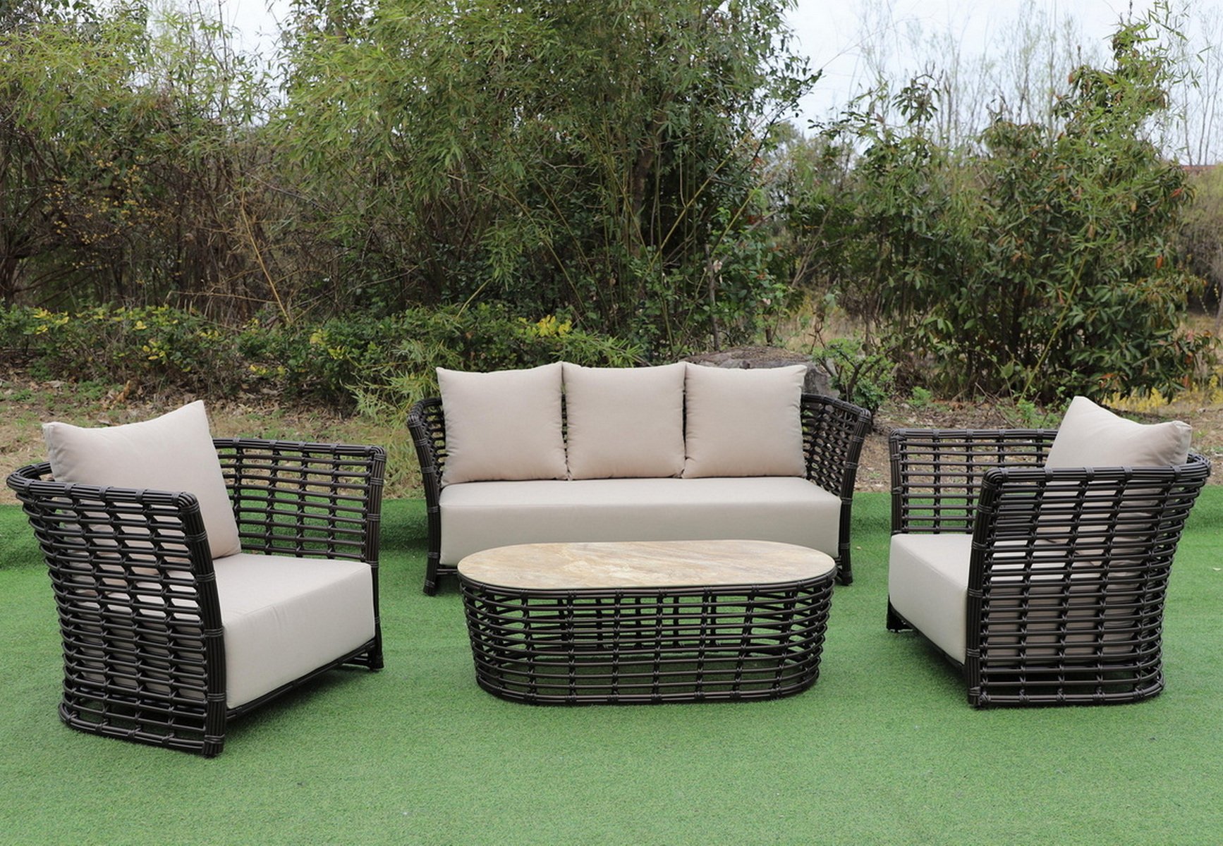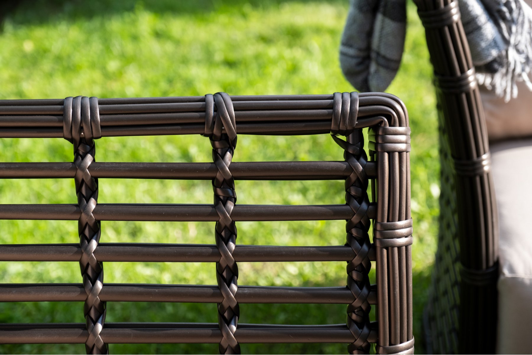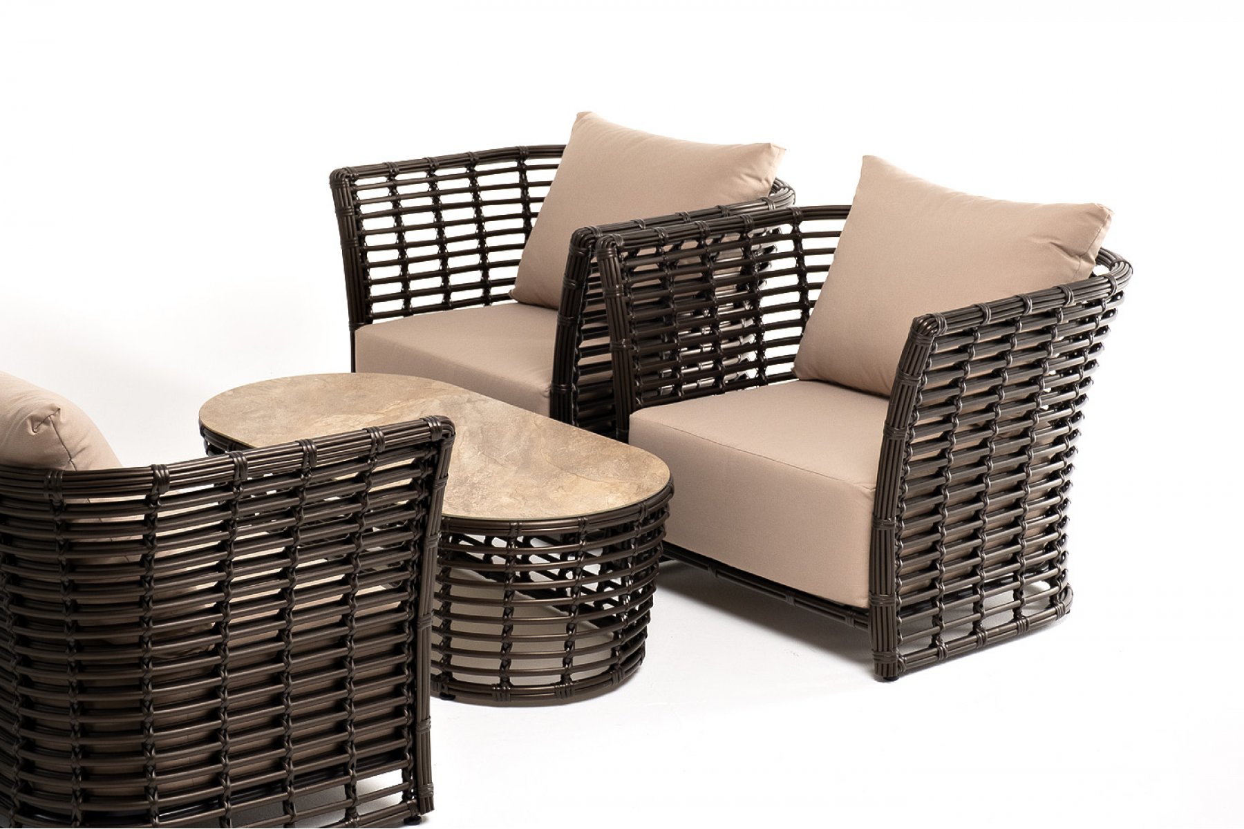 Модели имеют алюминиевый каркас, который оплетен вручную искусственным ротангом бронзового цвета.