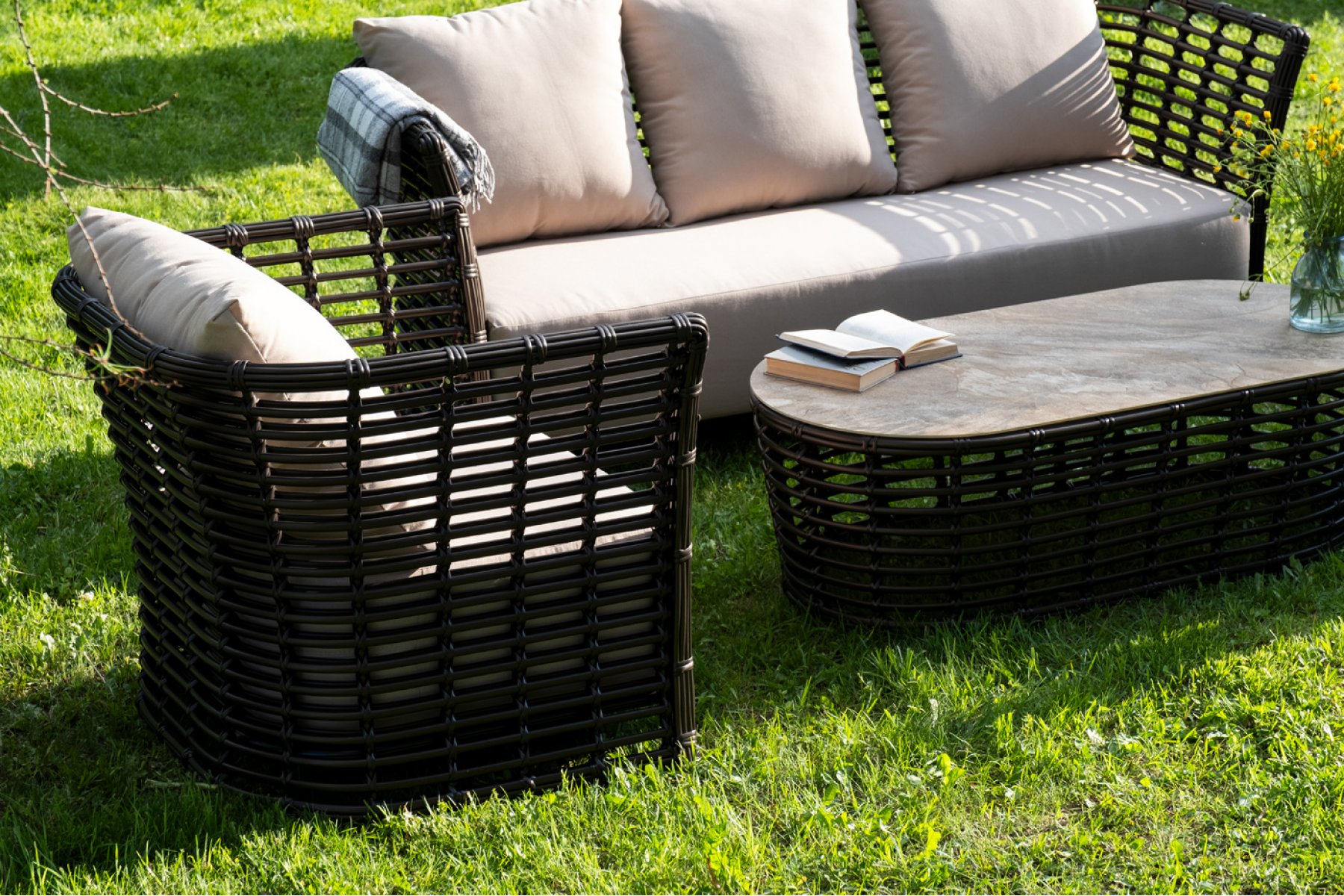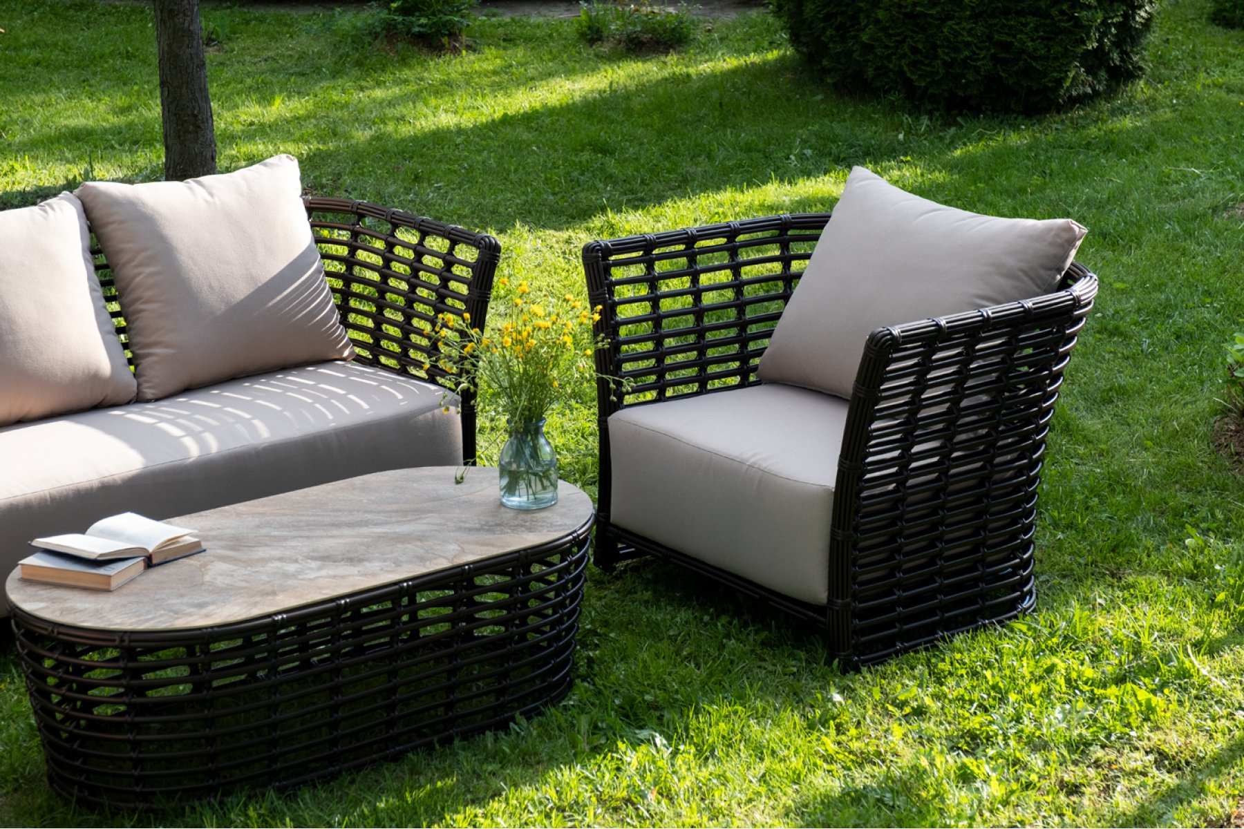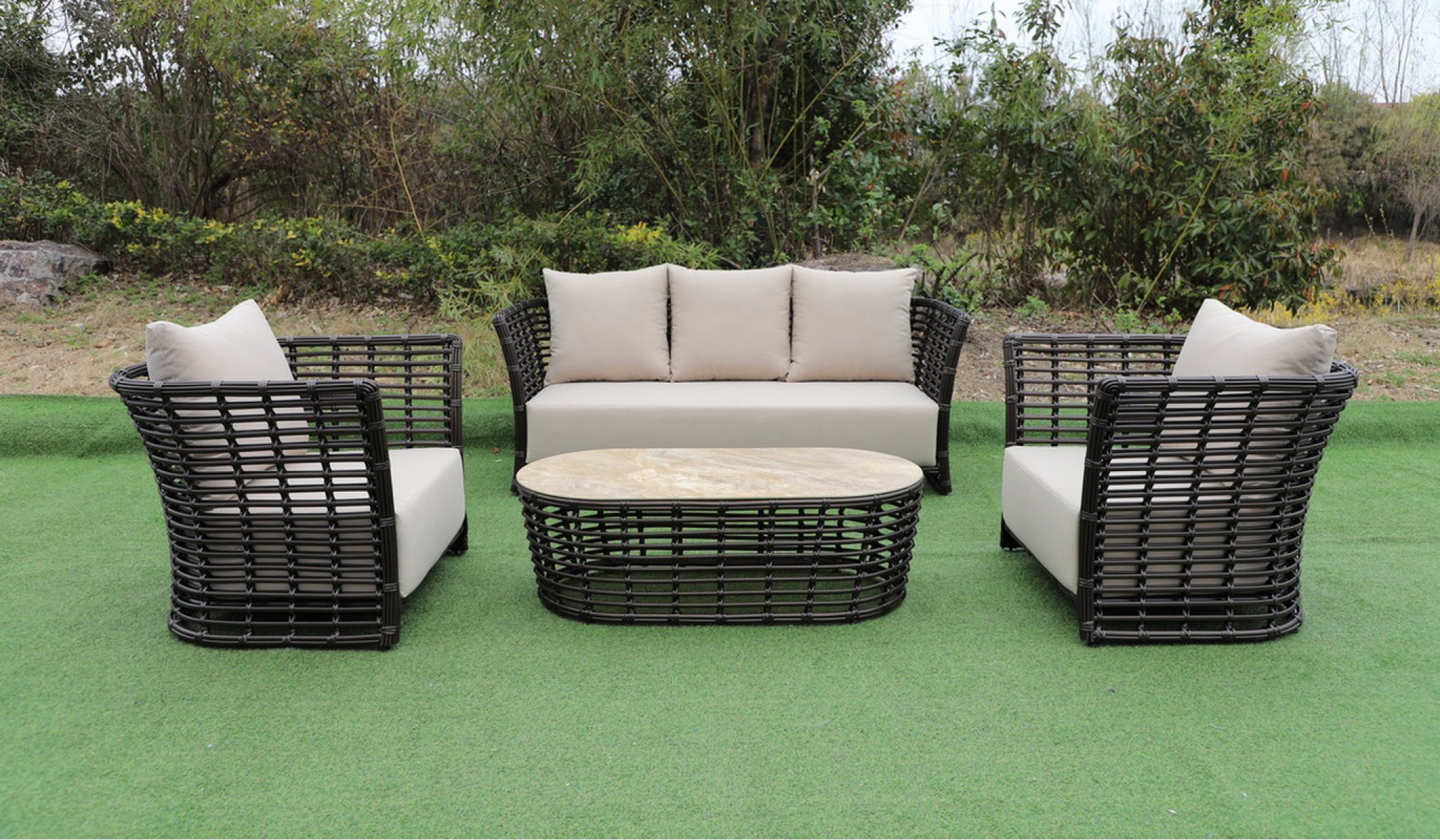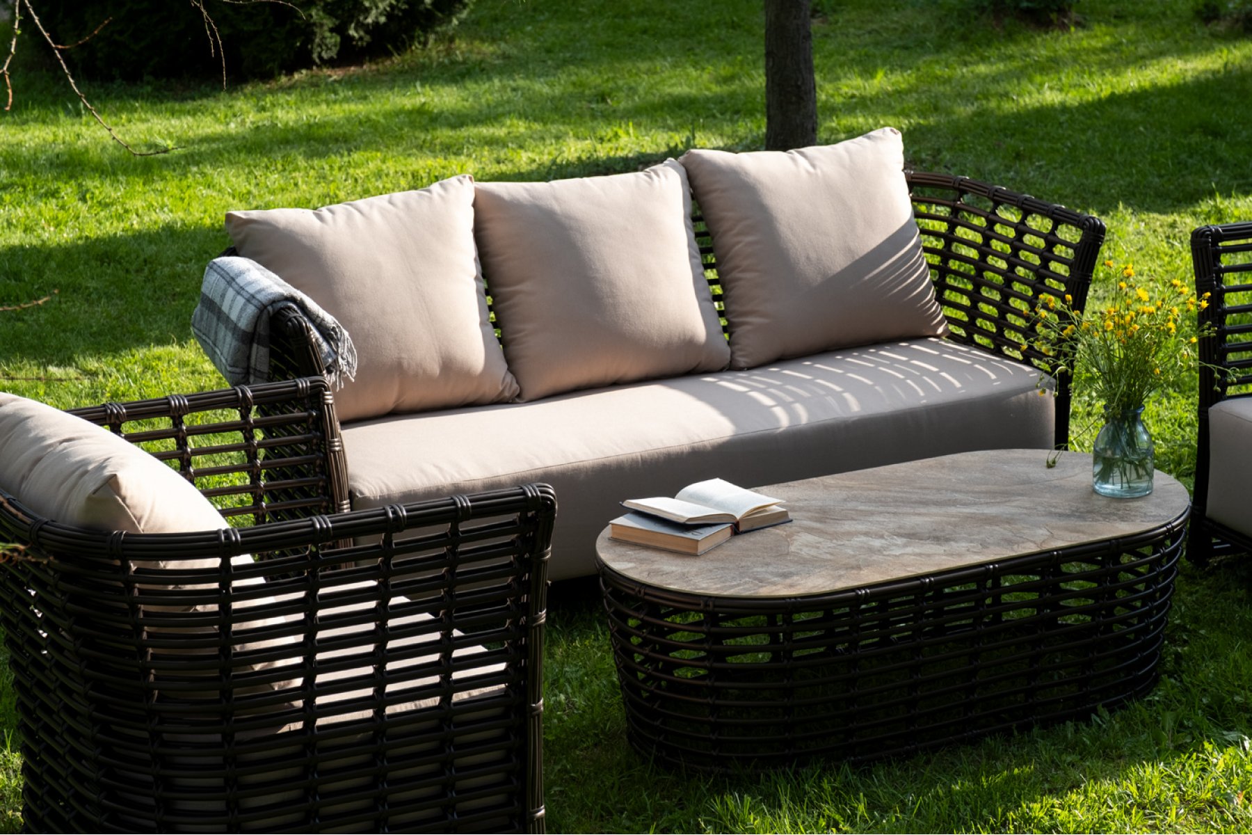 Модели имеют алюминиевый каркас, который оплетен вручную искусственным ротангом бронзового цвета.