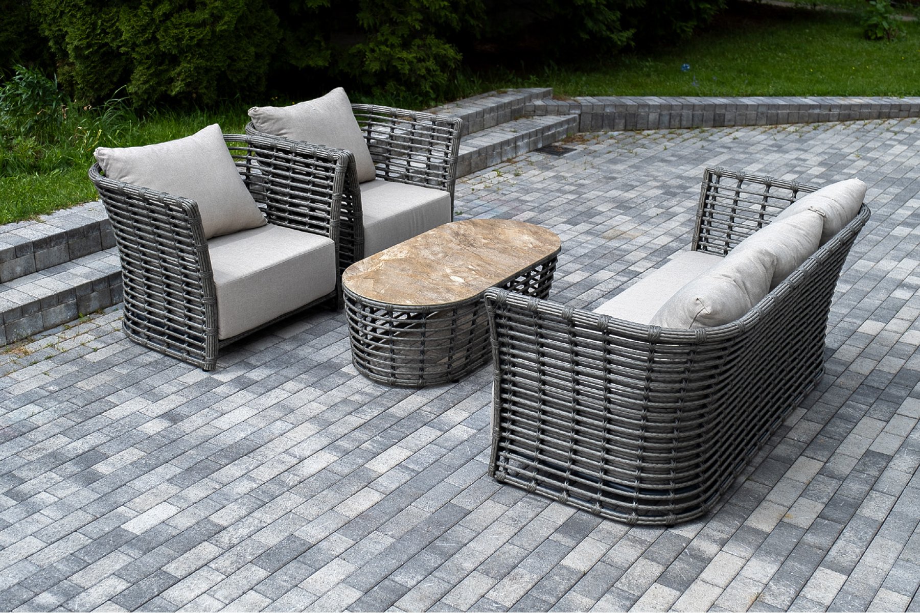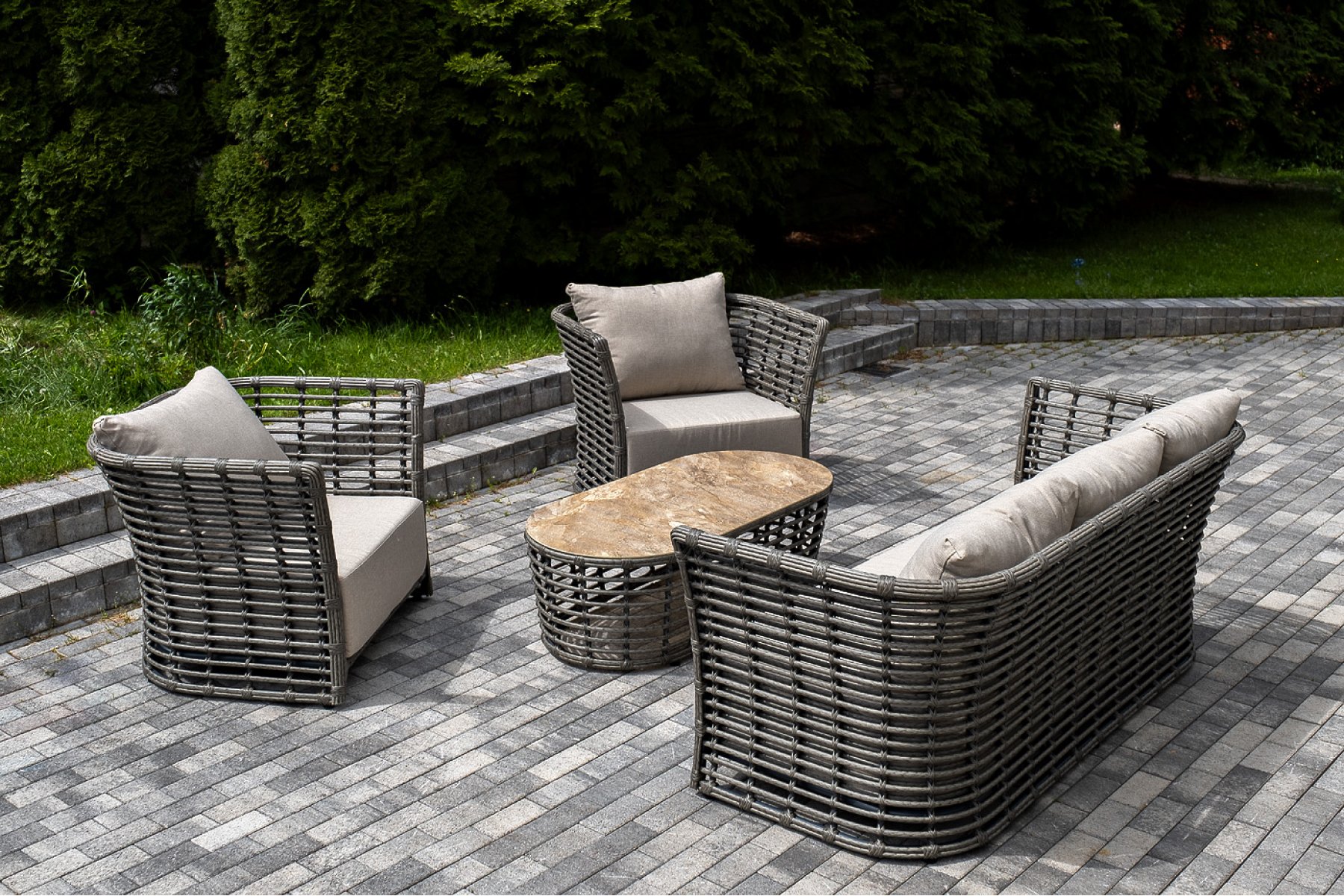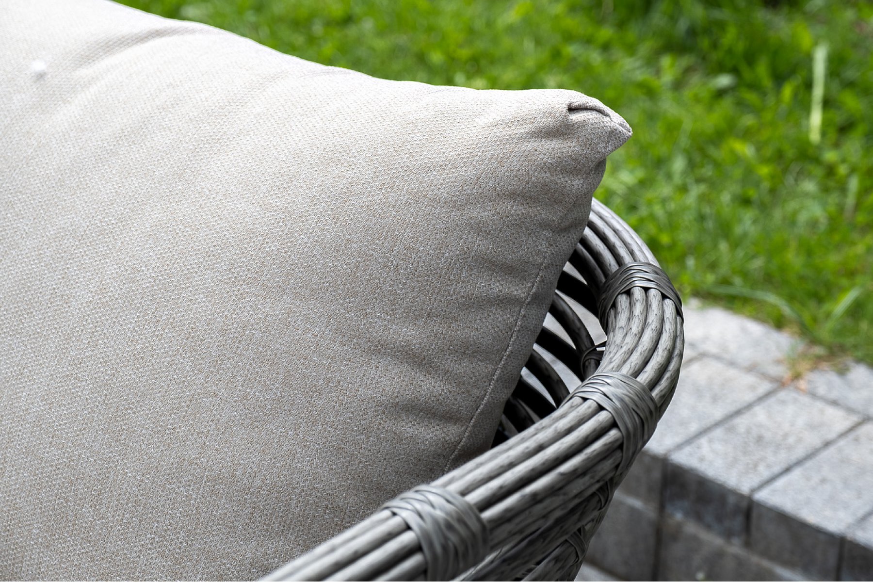 Плетеная мебель дополнена удобными подушками в бежевых чехлах. При их изготовлении используют полиэстер, плотность – 300гр/м2. Он обрабатывается влагоотталкивающей пропиткой для повышения защитных свойств материала.