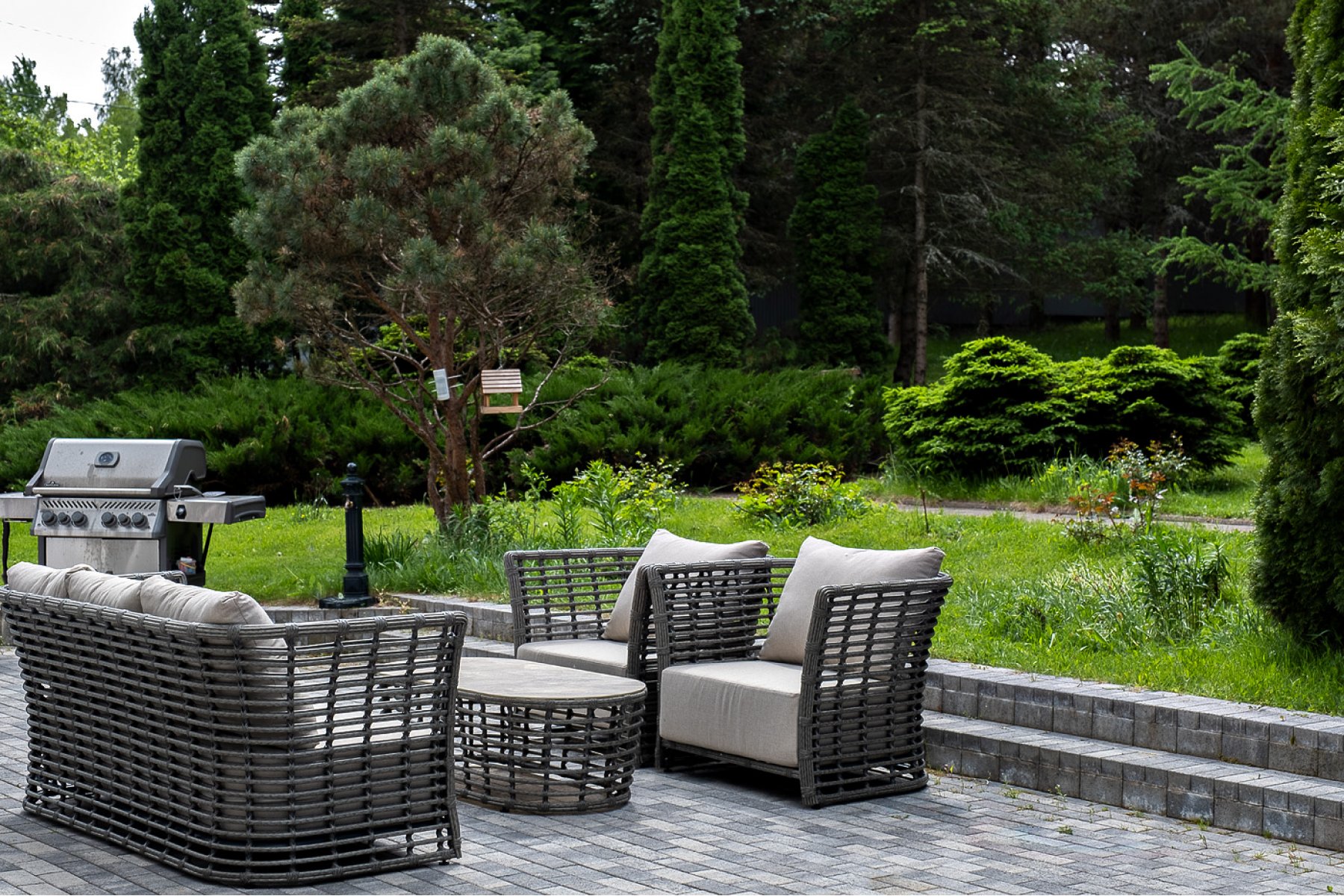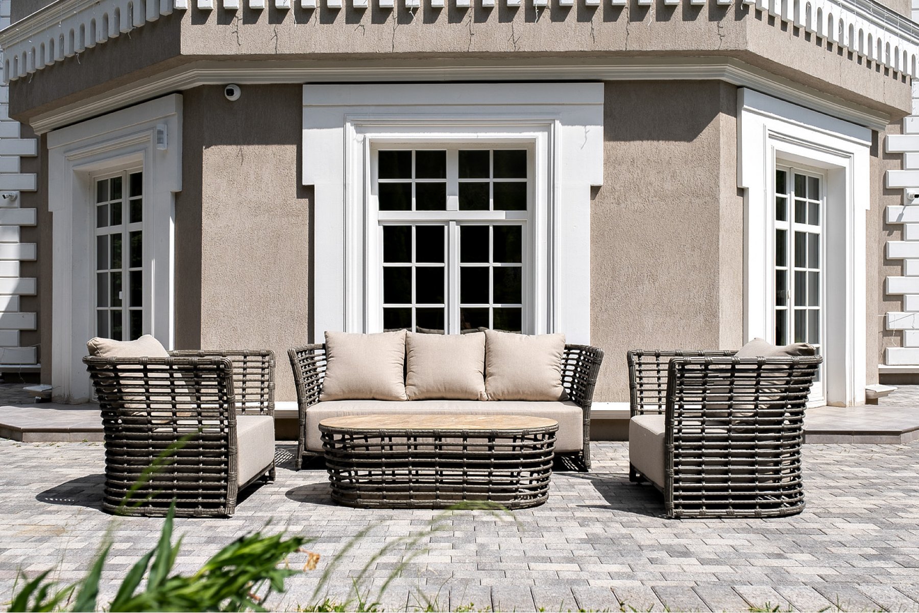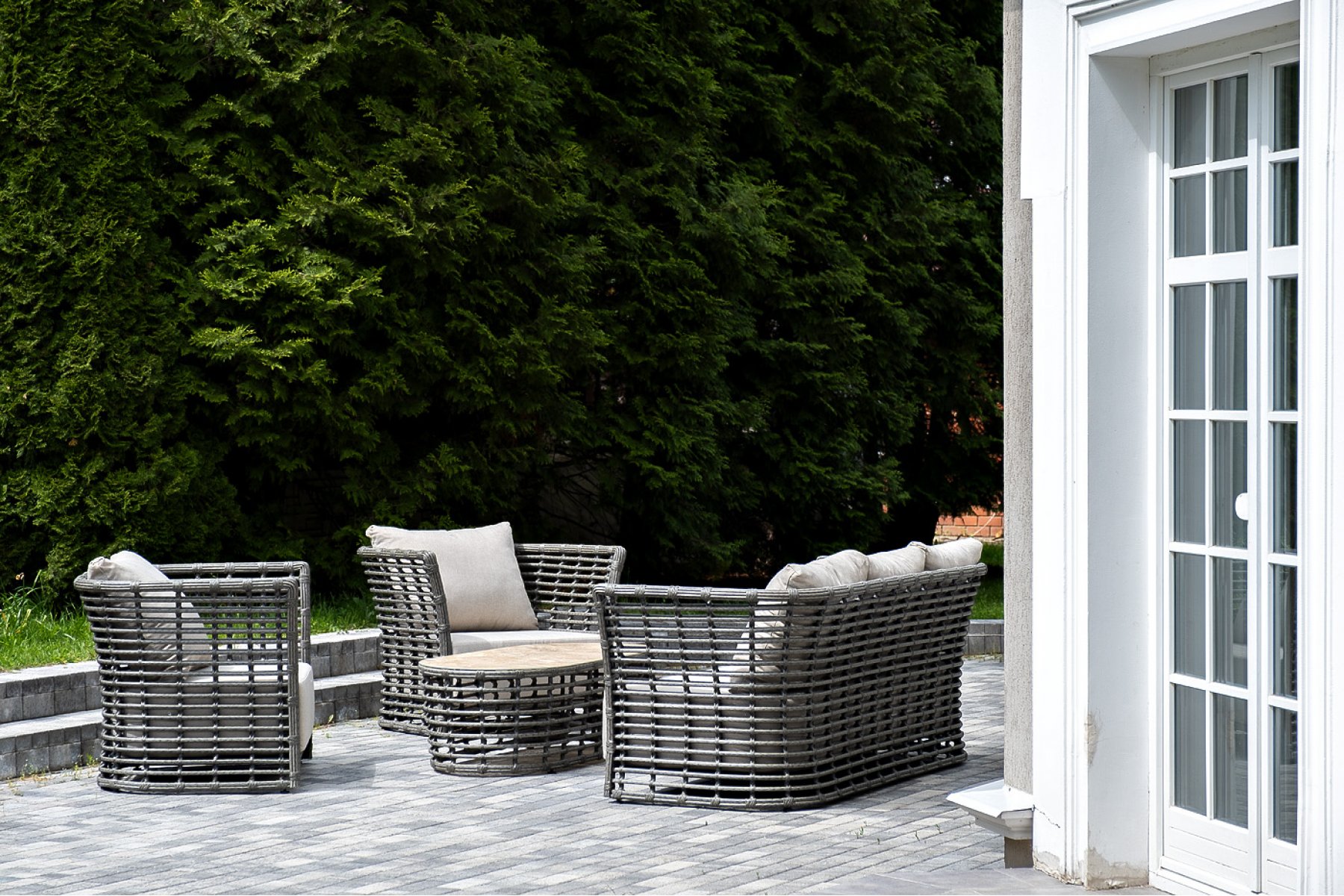 Плетеная мебель дополнена удобными подушками в бежевых чехлах. При их изготовлении используют полиэстер, плотность – 300гр/м2. Он обрабатывается влагоотталкивающей пропиткой для повышения защитных свойств материала.
