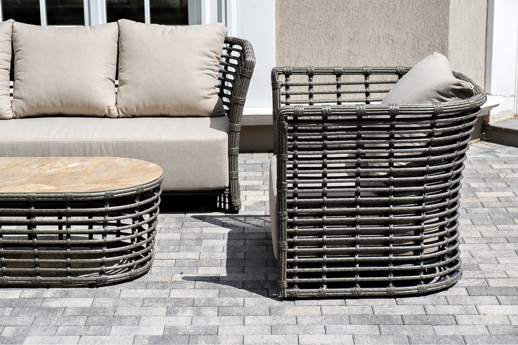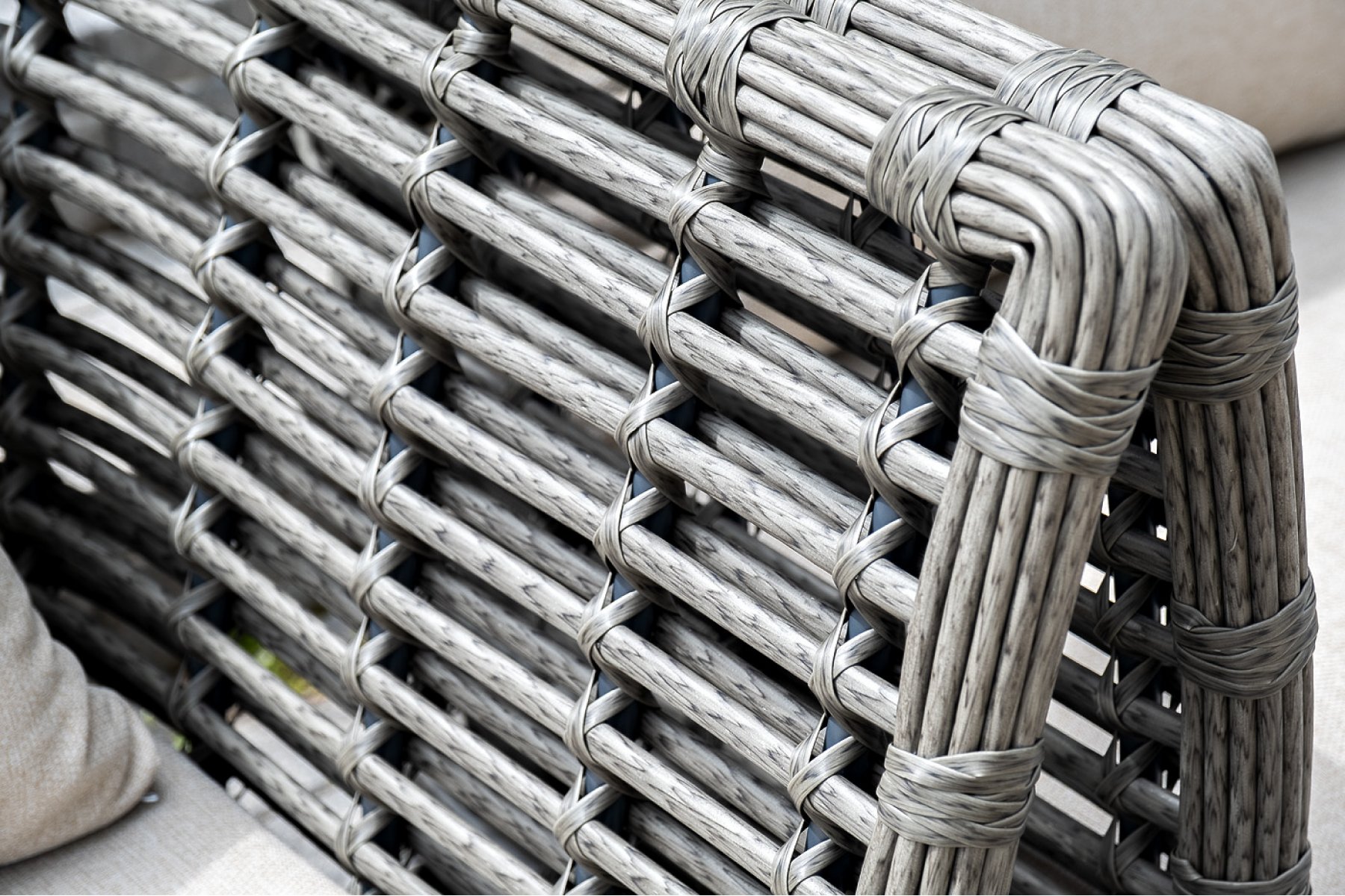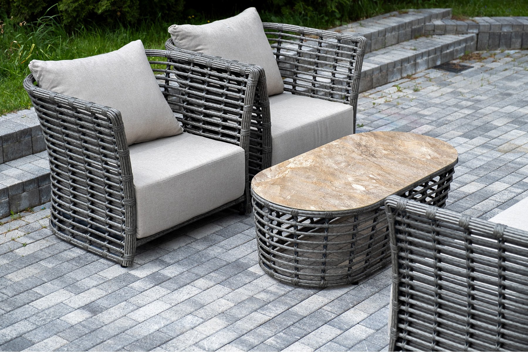 Модели имеют алюминиевый каркас, который оплетен вручную искусственным ротангом серого цвета.