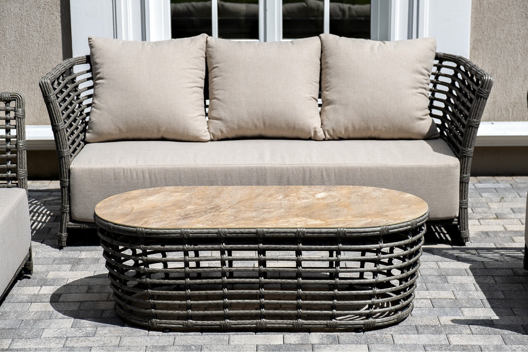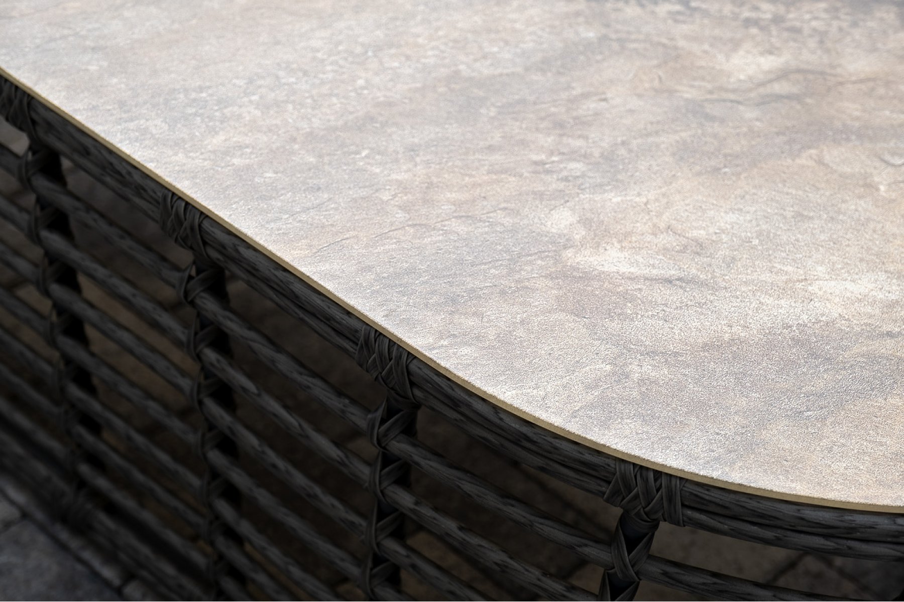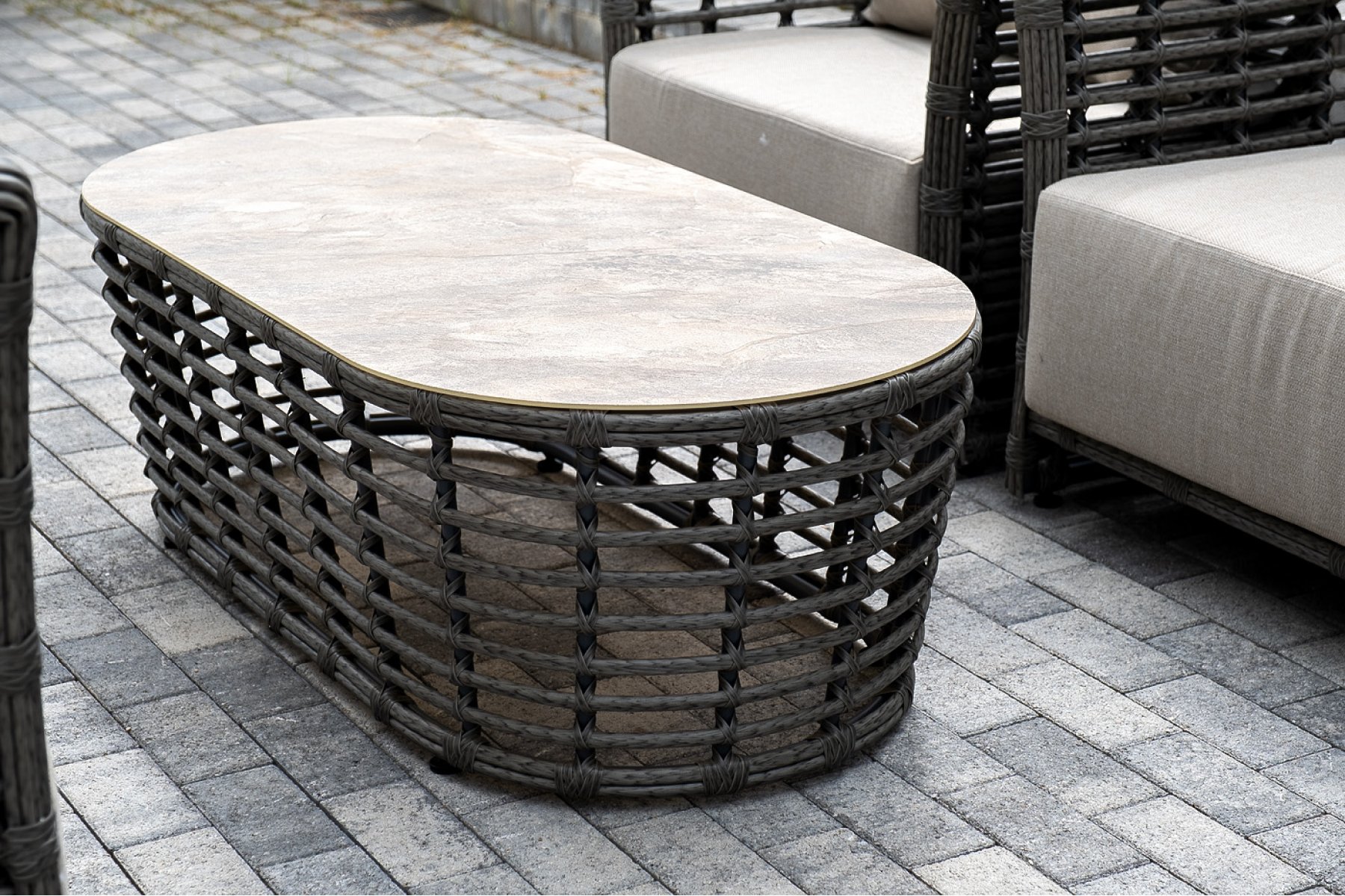 Модели имеют алюминиевый каркас, который оплетен вручную искусственным ротангом серого цвета.