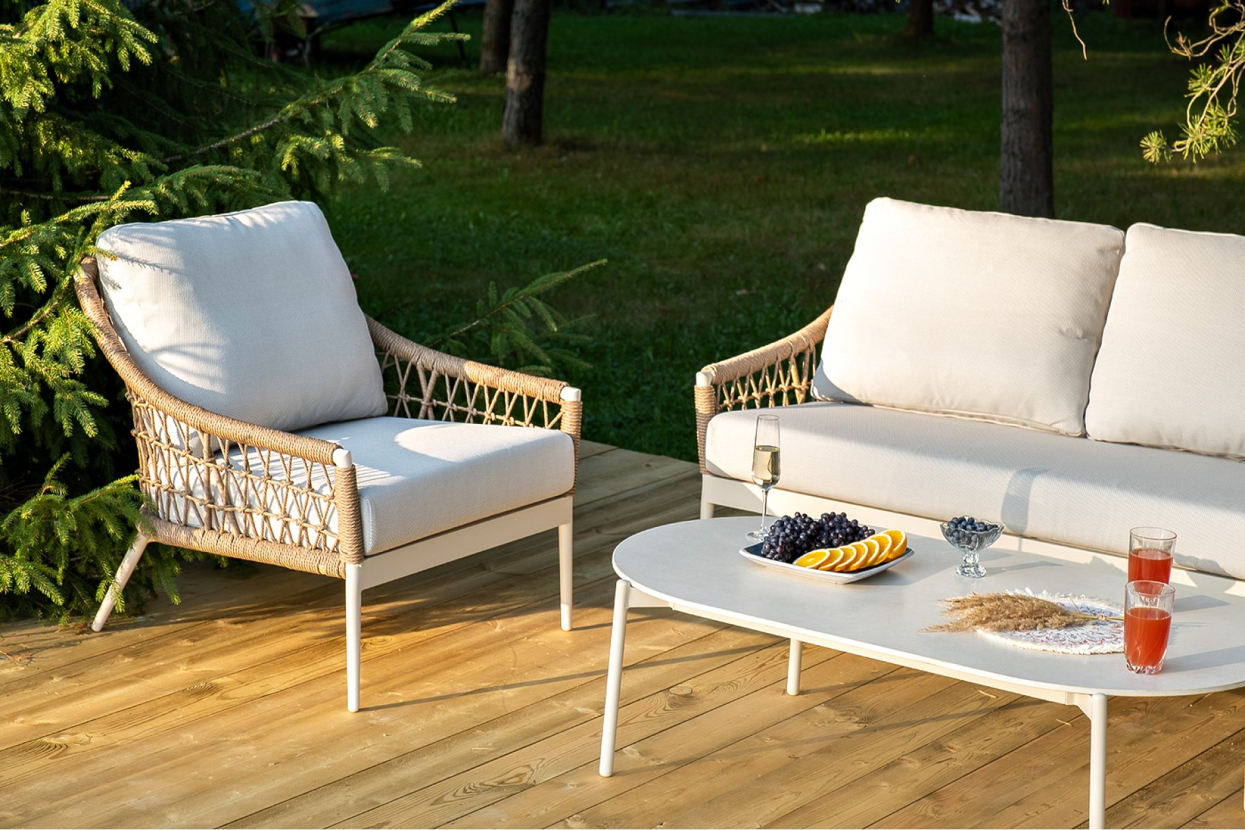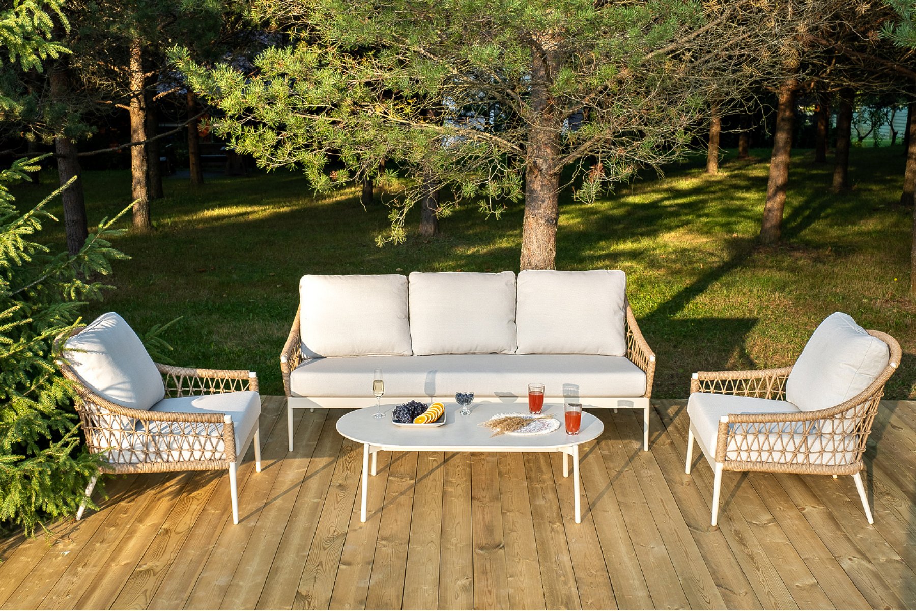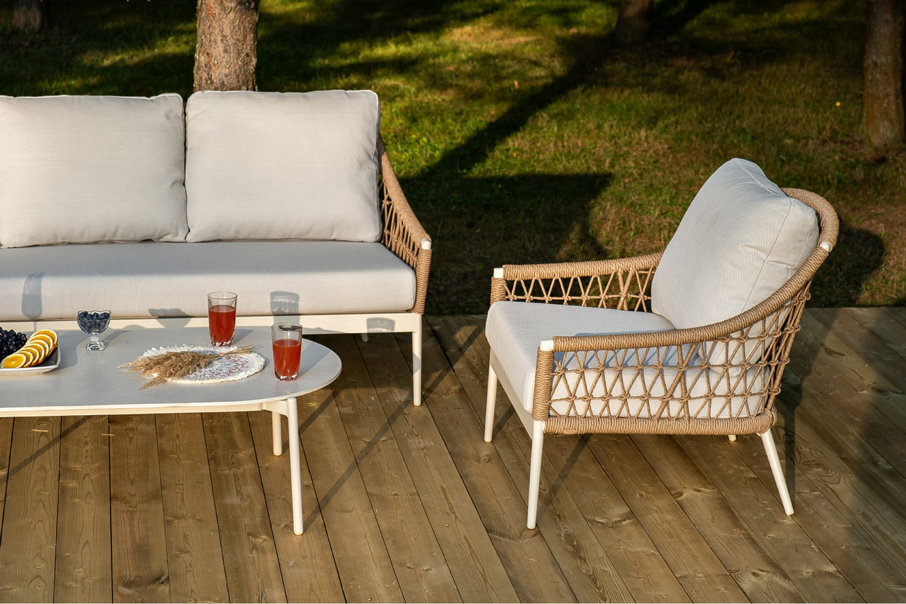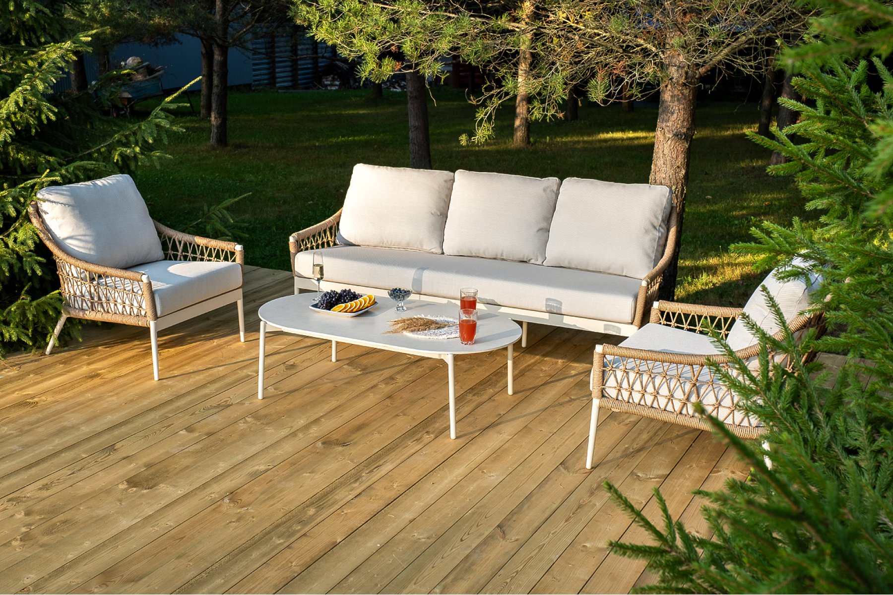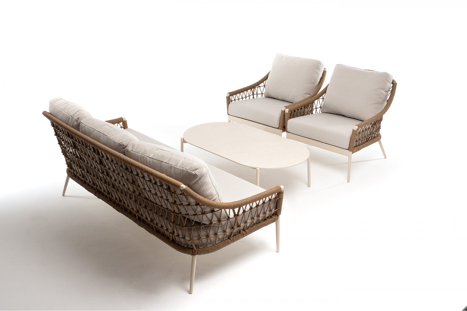 "Венеция" диван из искусственного ротанга трехместный, цвет соломенный 1шт. 2 040Х815Х830, "Венеция" кресло из искусственного ротанга, цвет соломенный 2шт. 800Х800Х855, "Венеция" журнальный стол из искусственного камня овальный, 130х70см, Н38, цвет белый 1шт. 1 300Х700Х380,