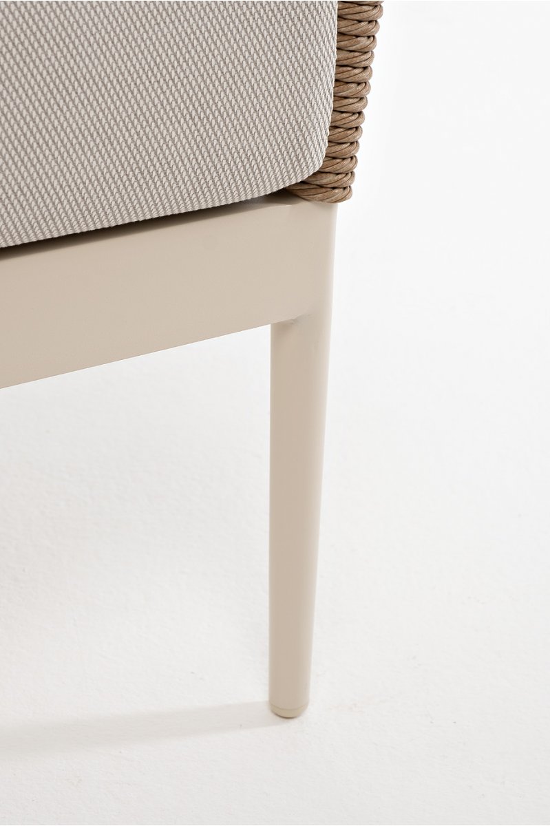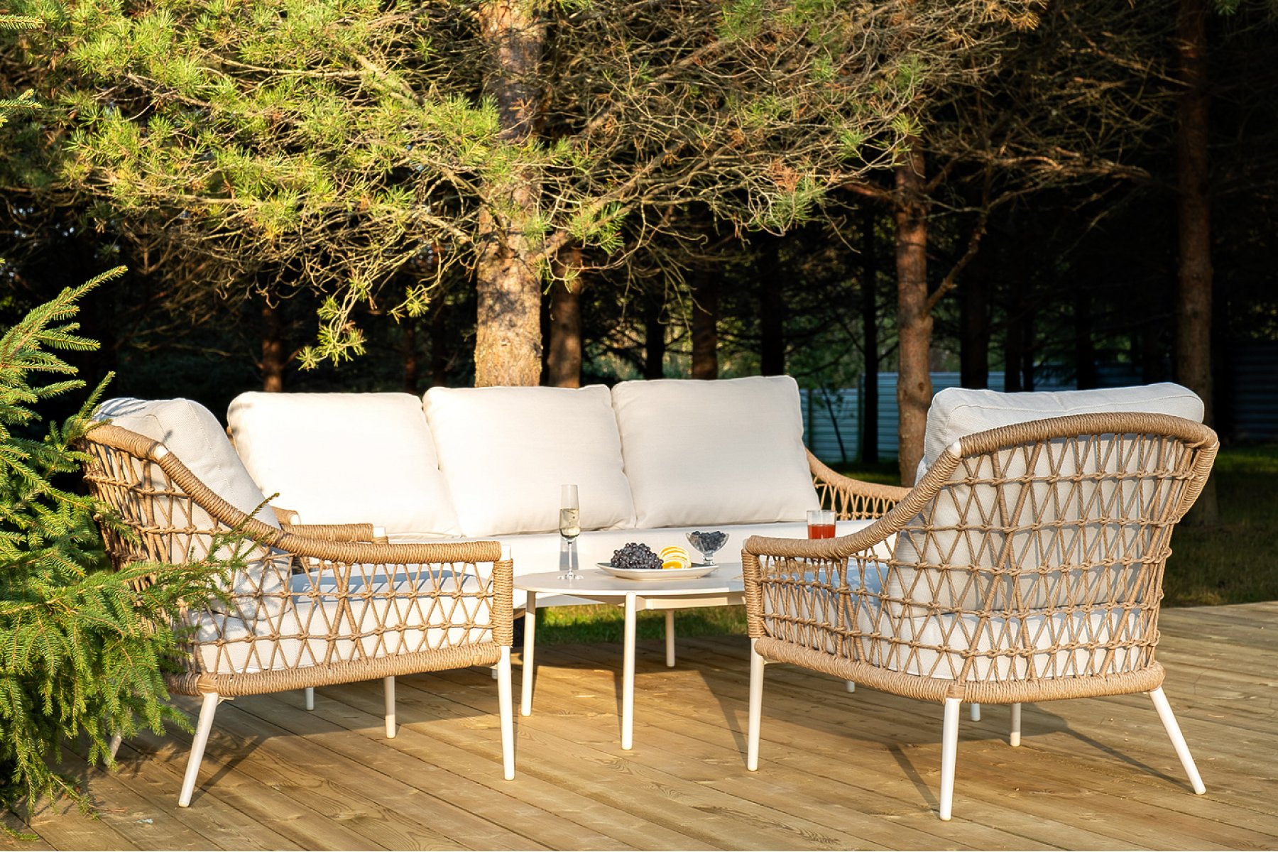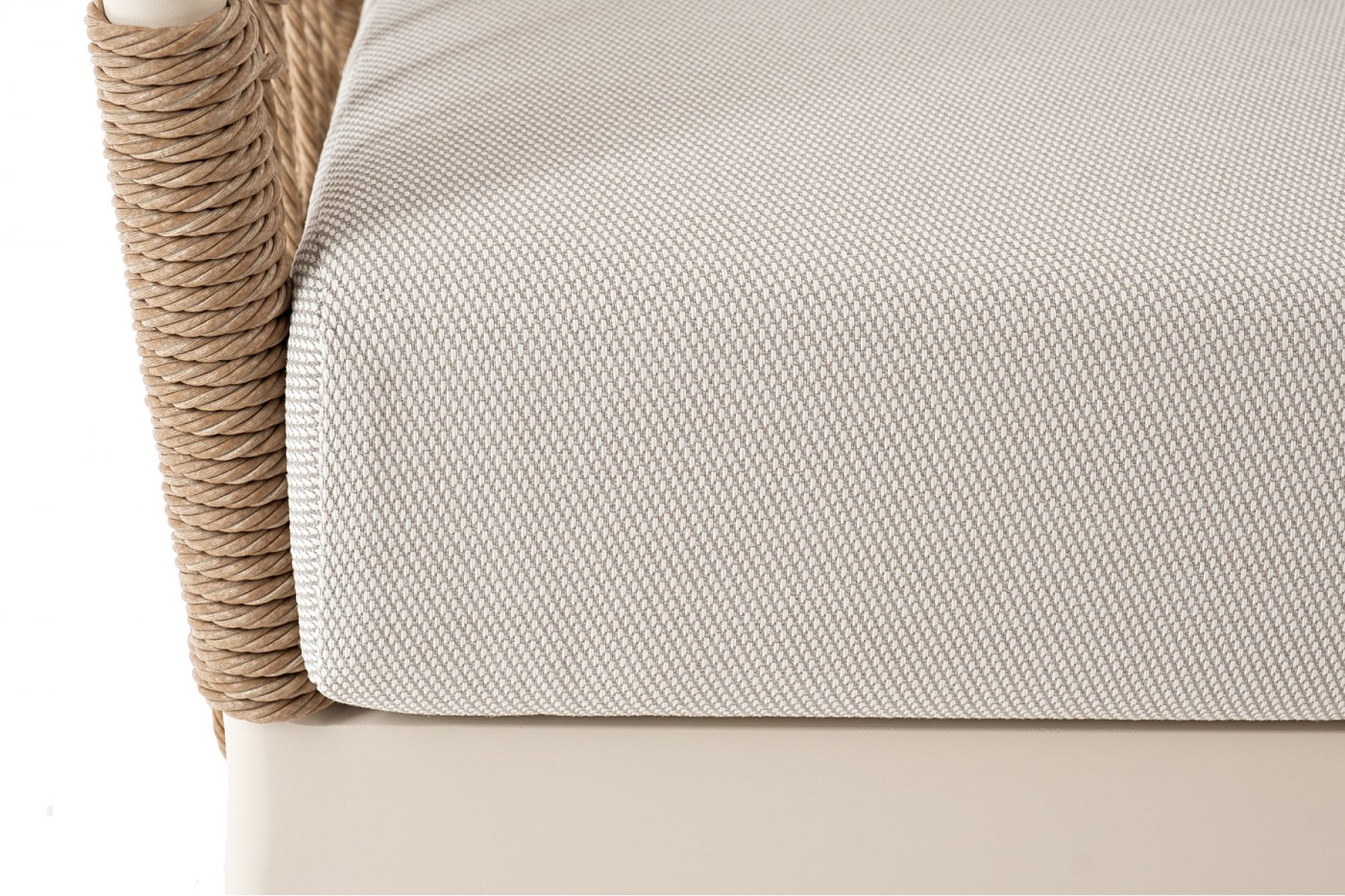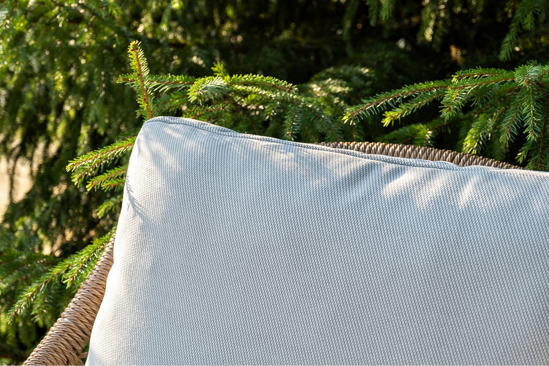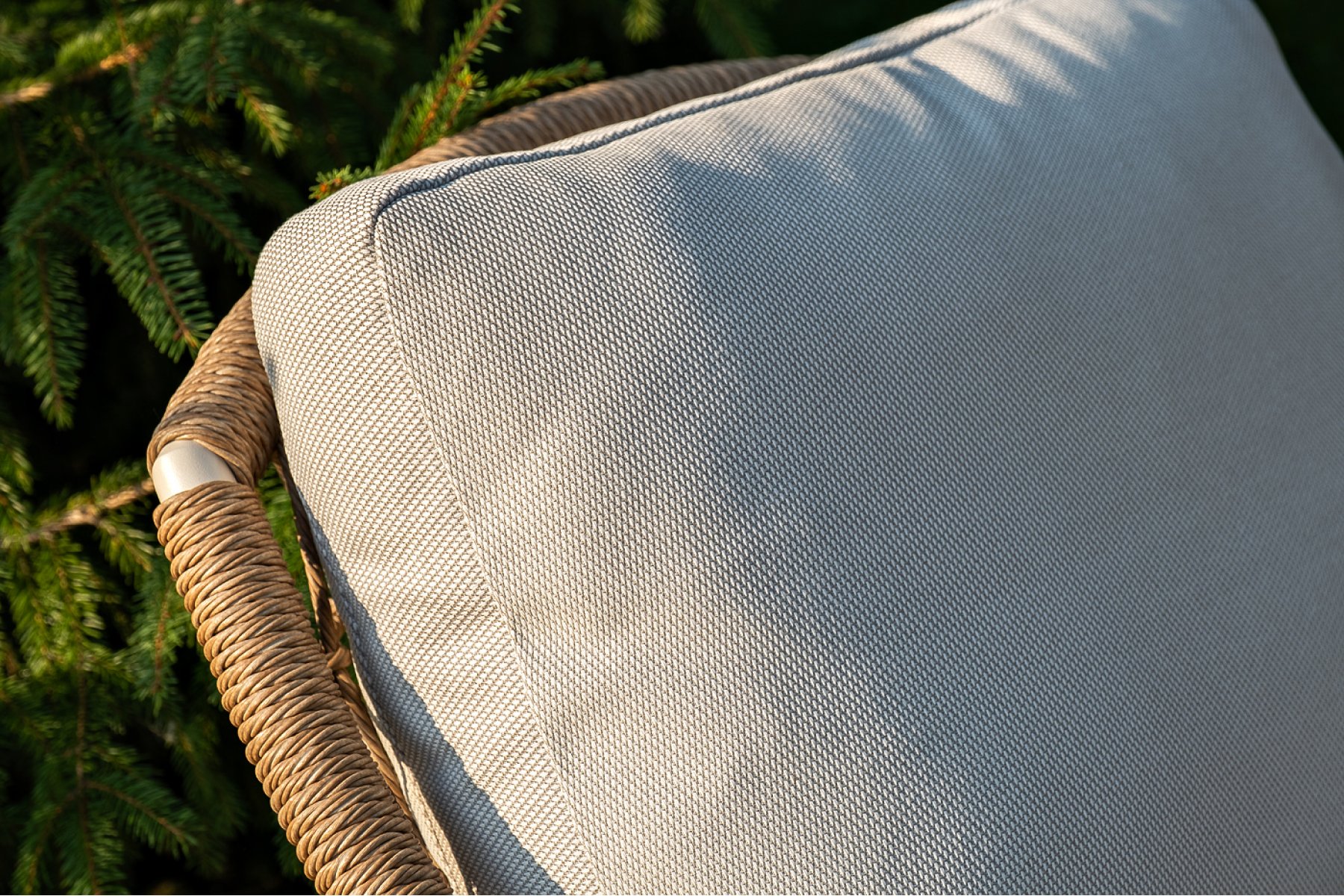 Плетеная мебель дополнена удобными подушками в бежевых чехлах. При их изготовлении используют полиэстер, плотность – 300гр/м2. Он обрабатывается влагоотталкивающей пропиткой для повышения защитных свойств материала.