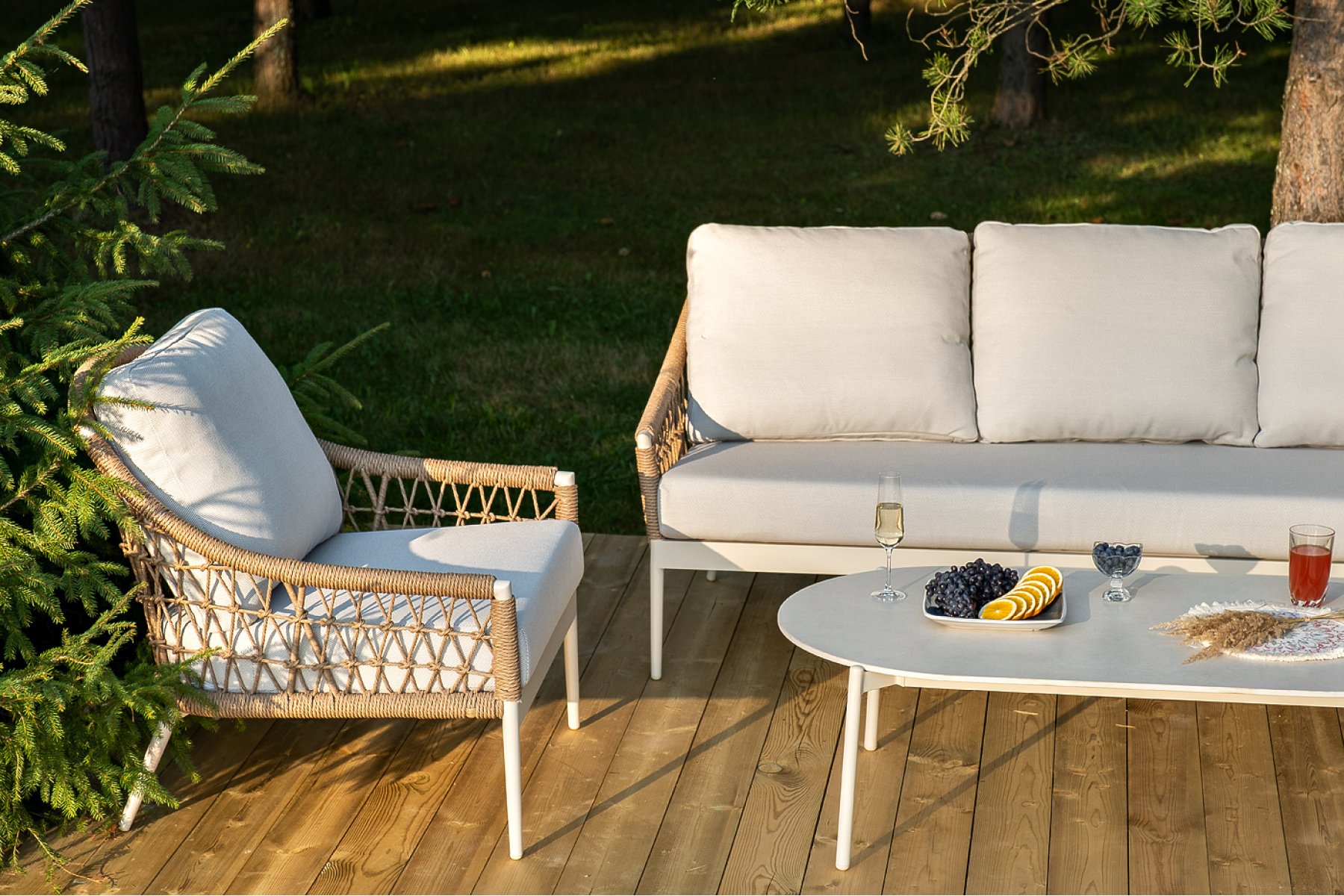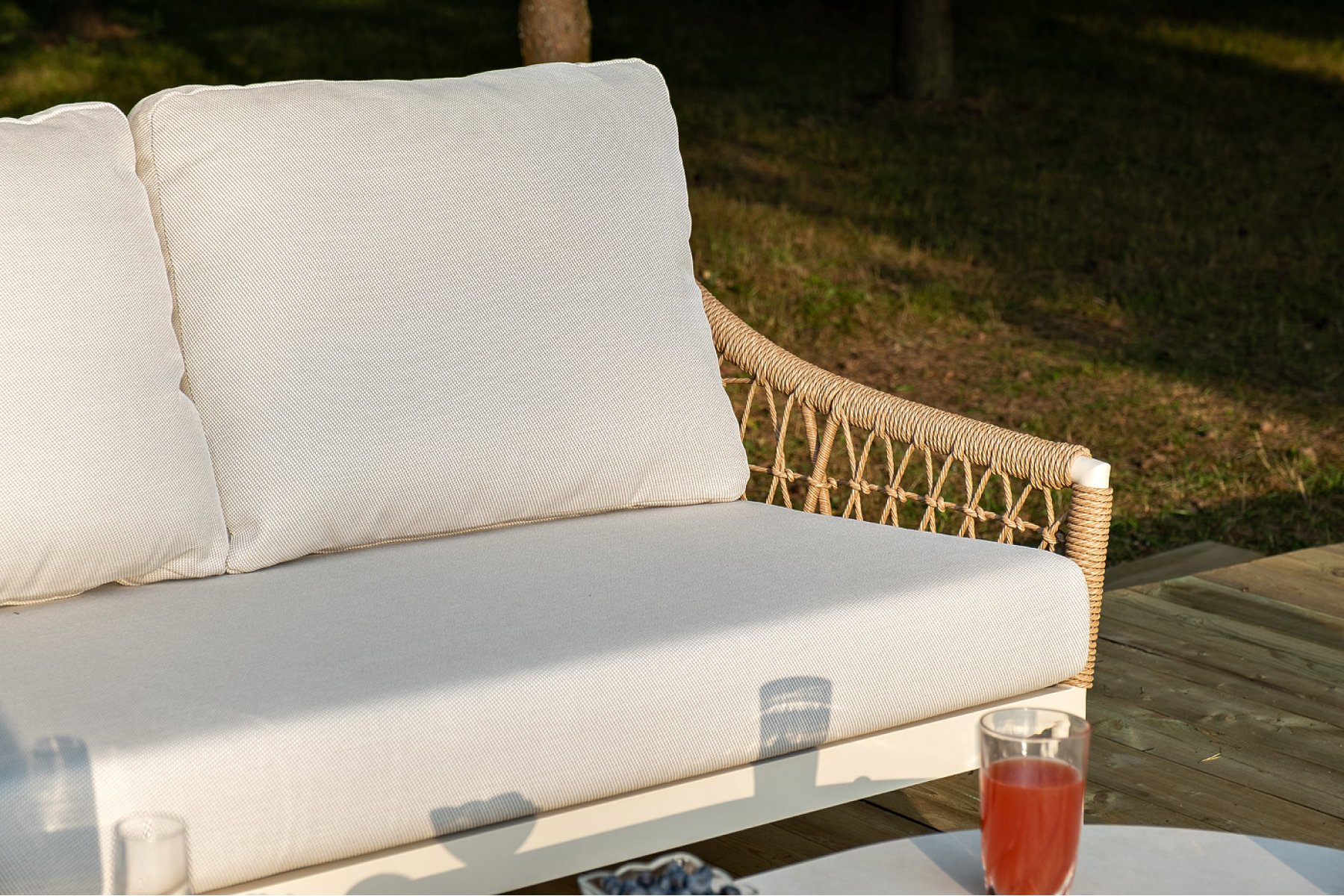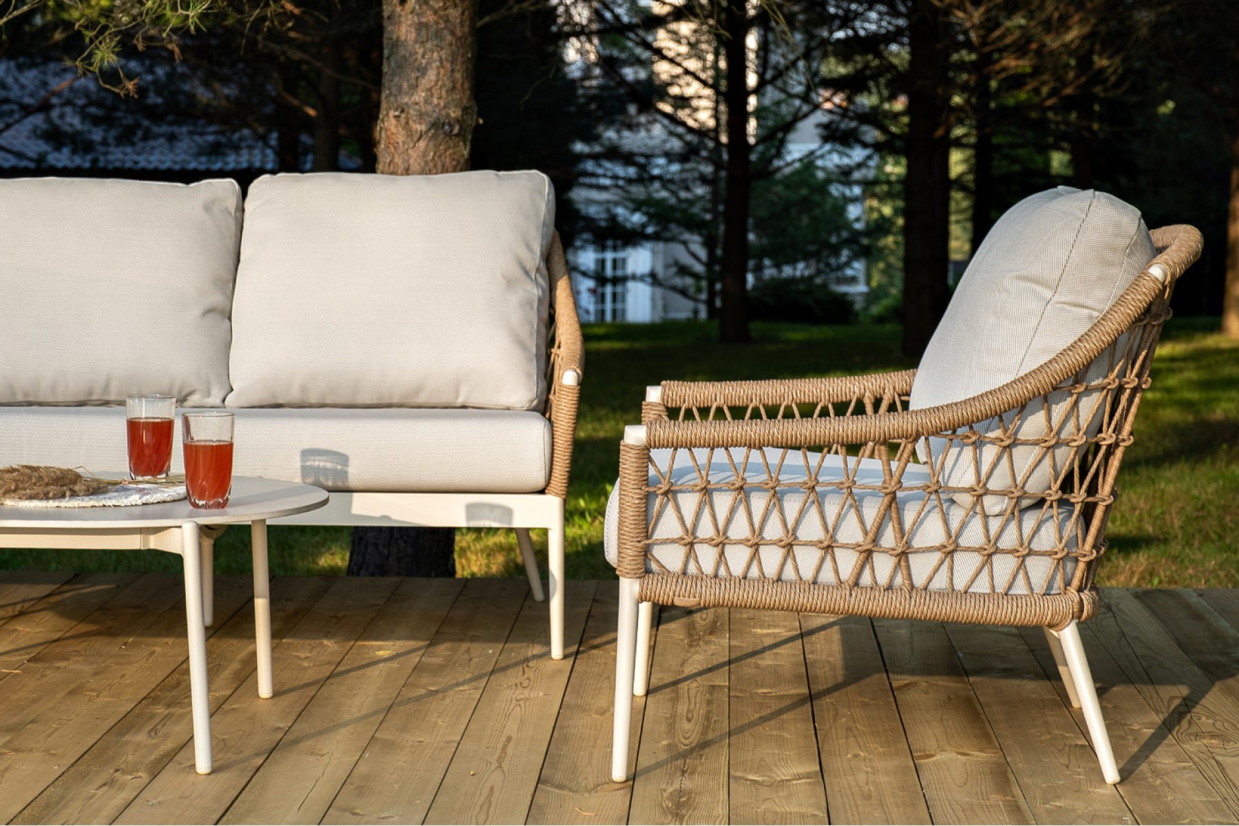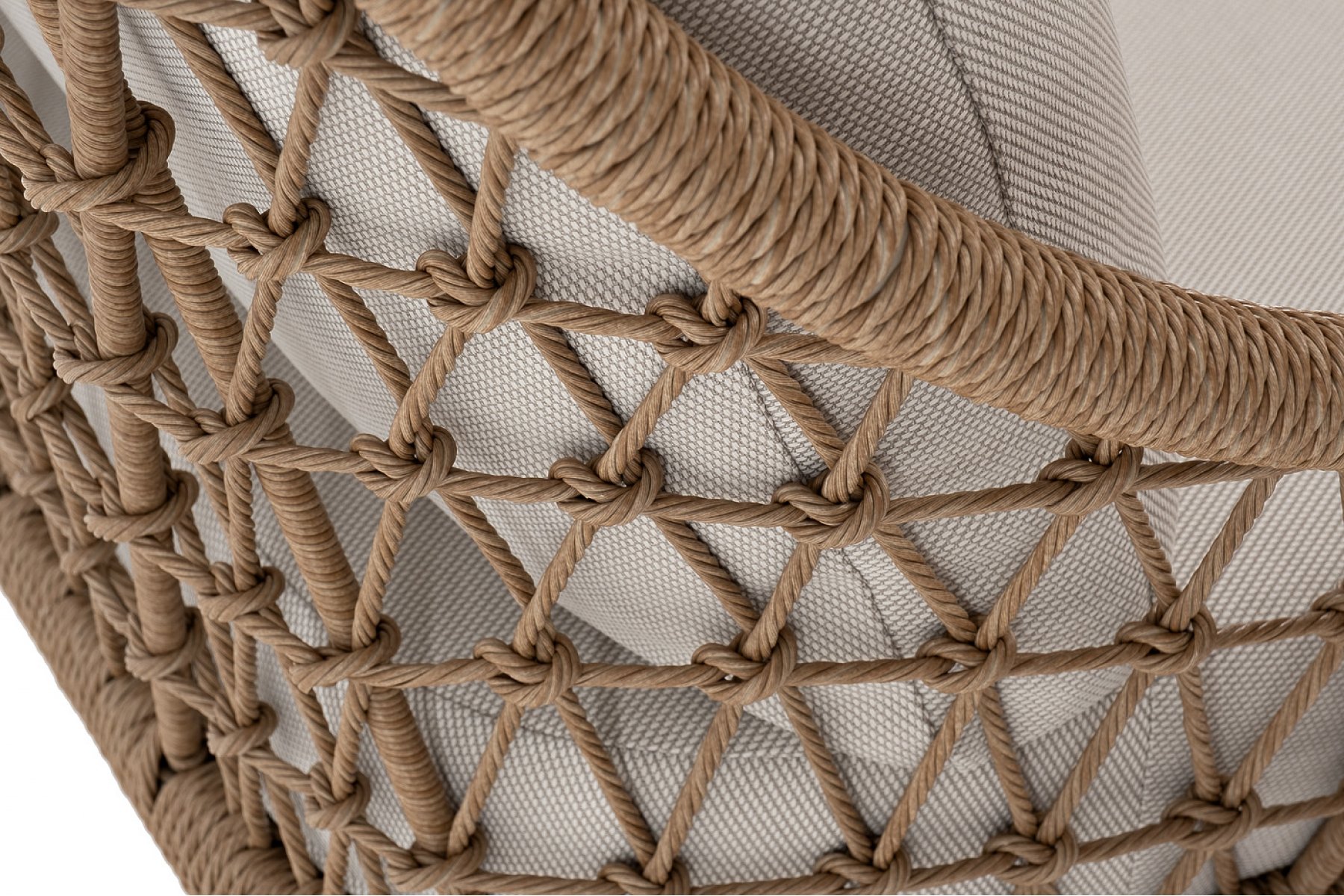 Плетеная мебель дополнена удобными подушками в бежевых чехлах. При их изготовлении используют полиэстер, плотность – 300гр/м2. Он обрабатывается влагоотталкивающей пропиткой для повышения защитных свойств материала.