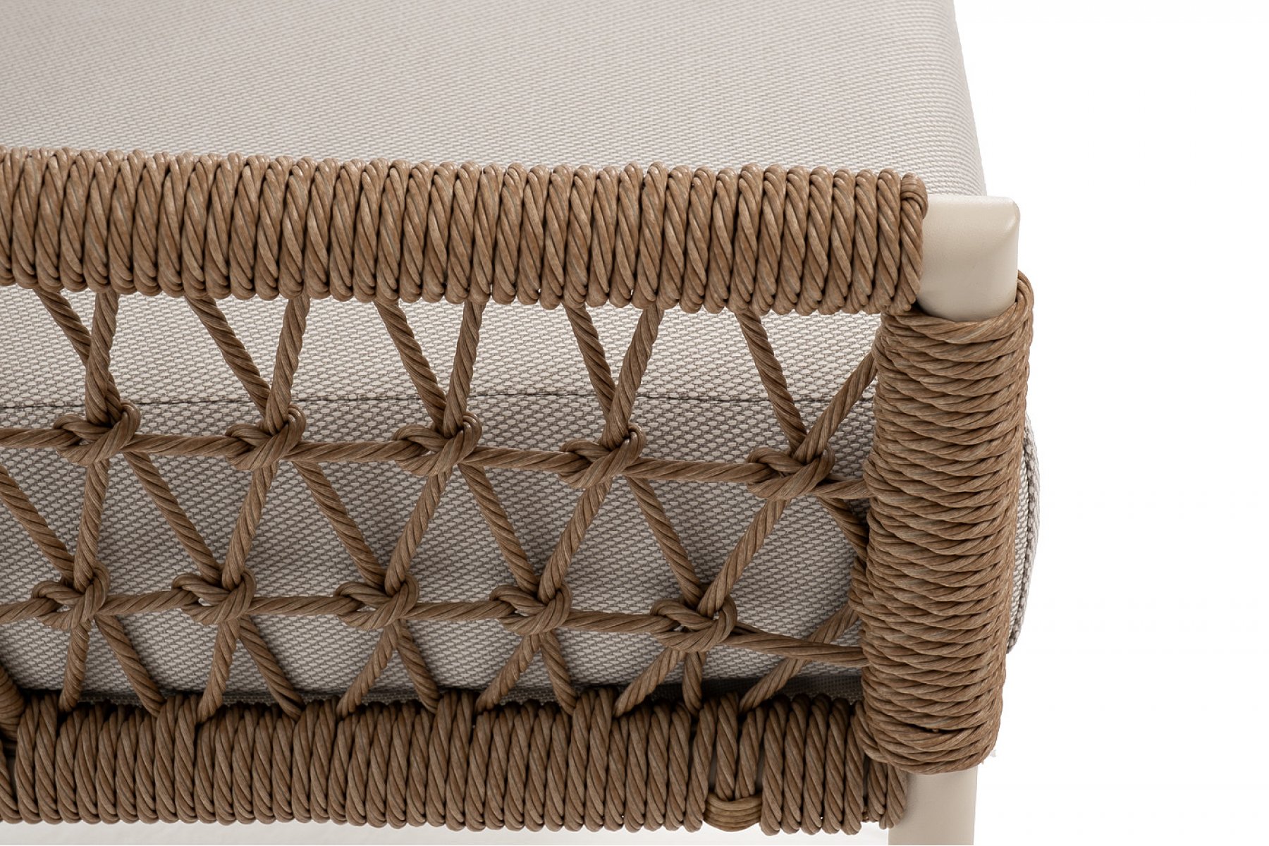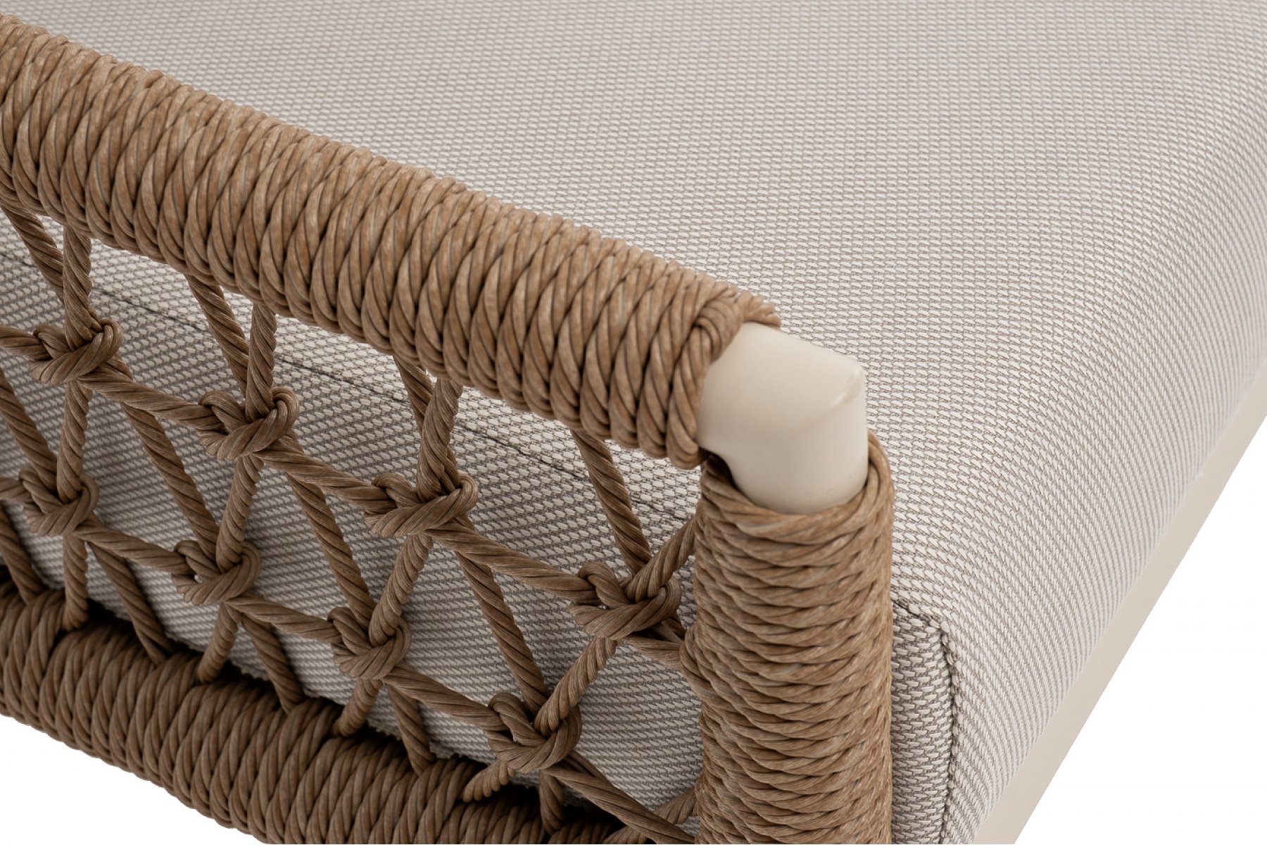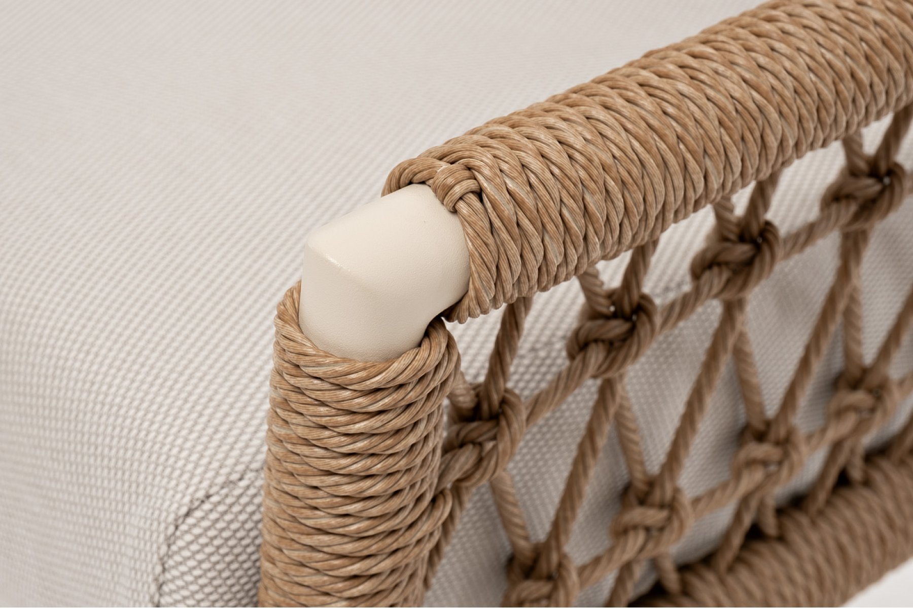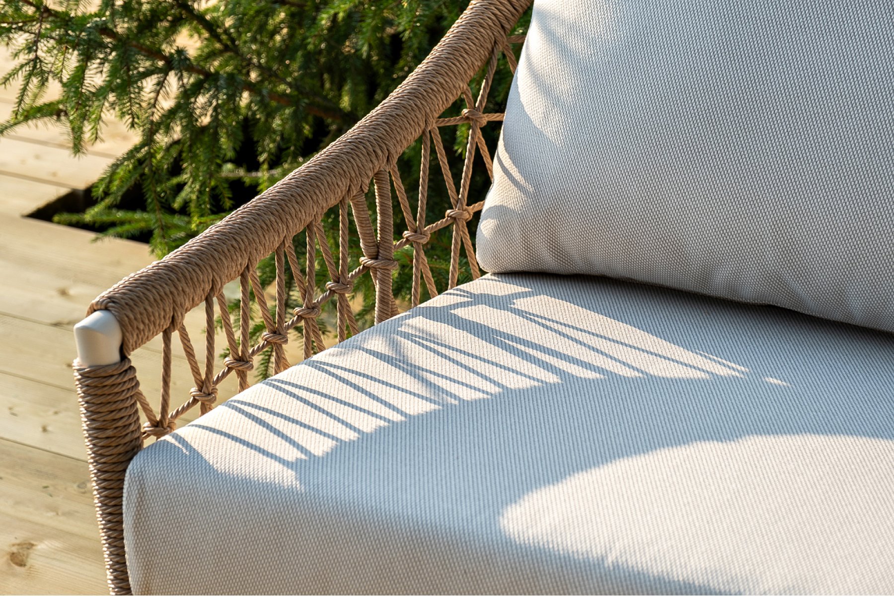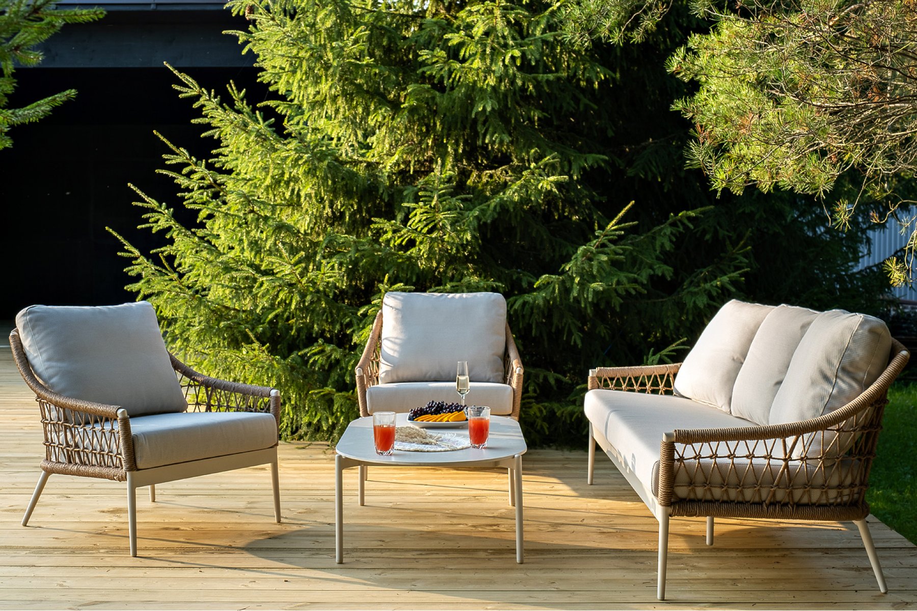 Плетеная мебель дополнена удобными подушками в бежевых чехлах. При их изготовлении используют полиэстер, плотность – 300гр/м2. Он обрабатывается влагоотталкивающей пропиткой для повышения защитных свойств материала.