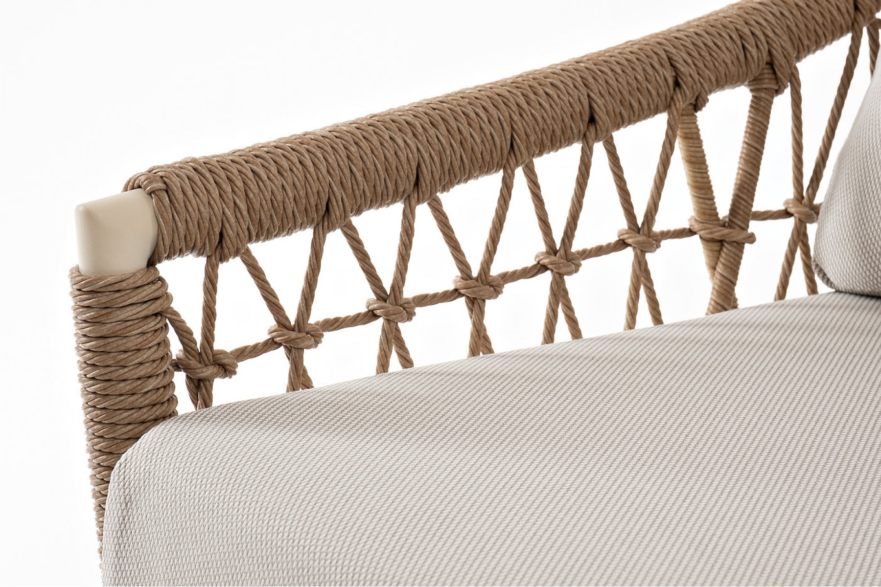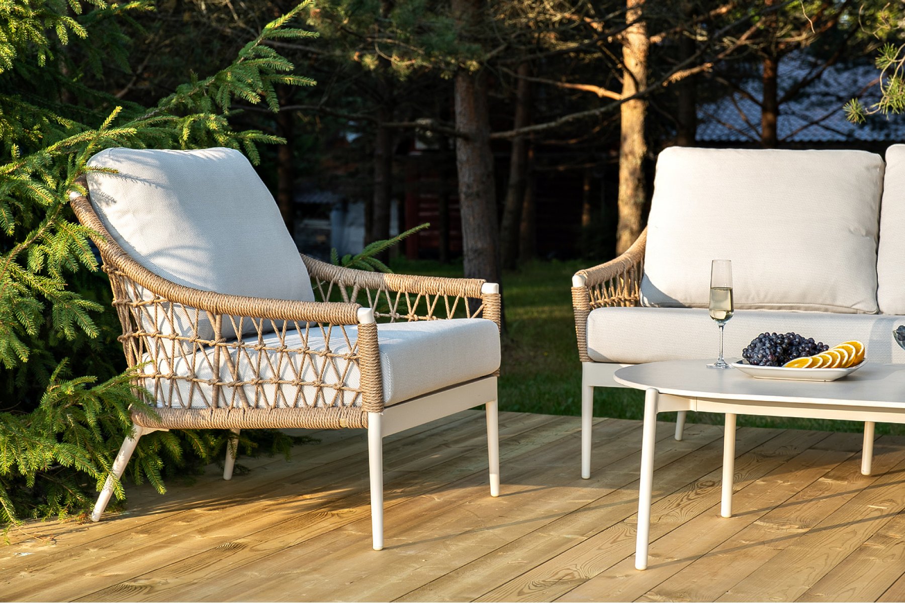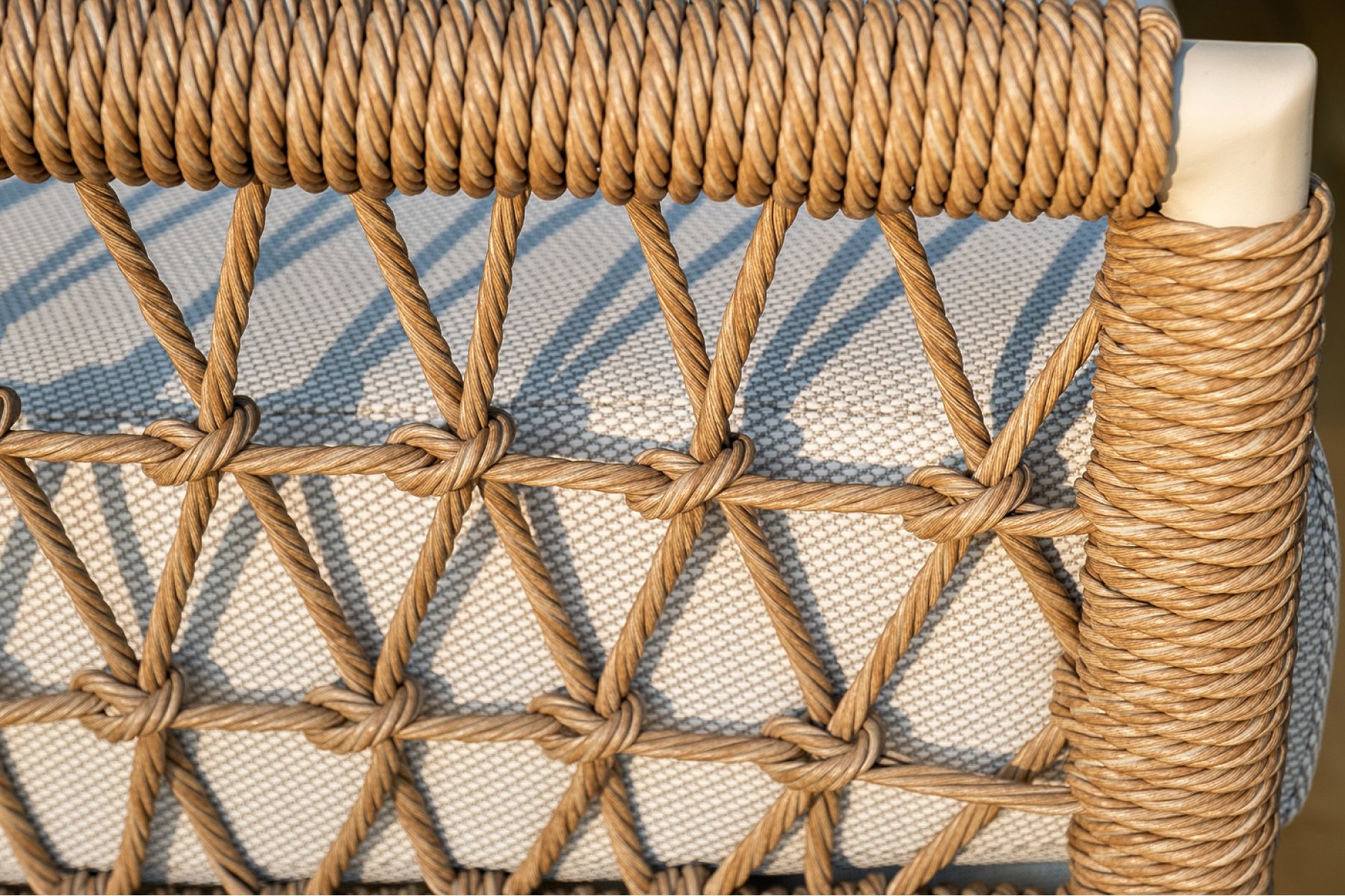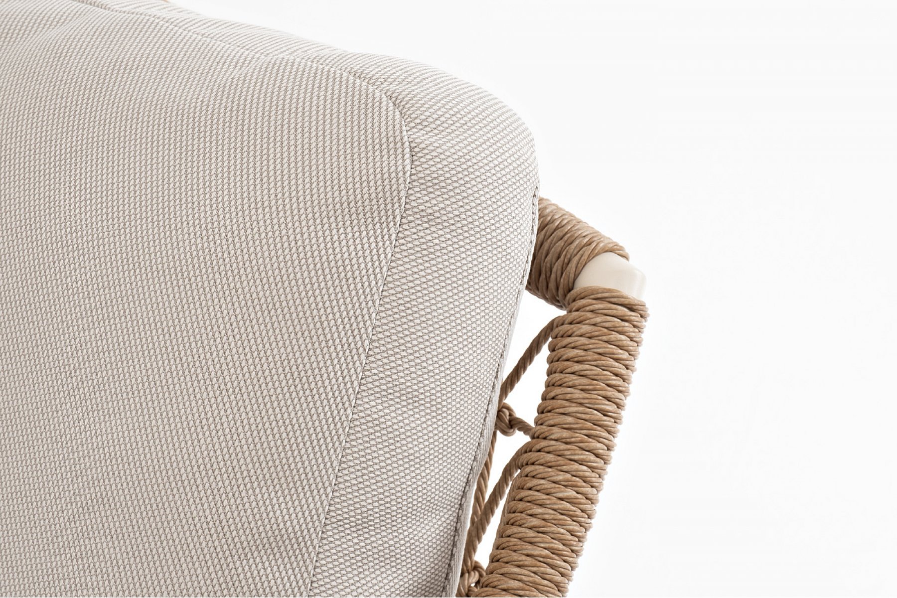 Плетеная мебель дополнена удобными подушками в бежевых чехлах. При их изготовлении используют полиэстер, плотность – 300гр/м2. Он обрабатывается влагоотталкивающей пропиткой для повышения защитных свойств материала.
