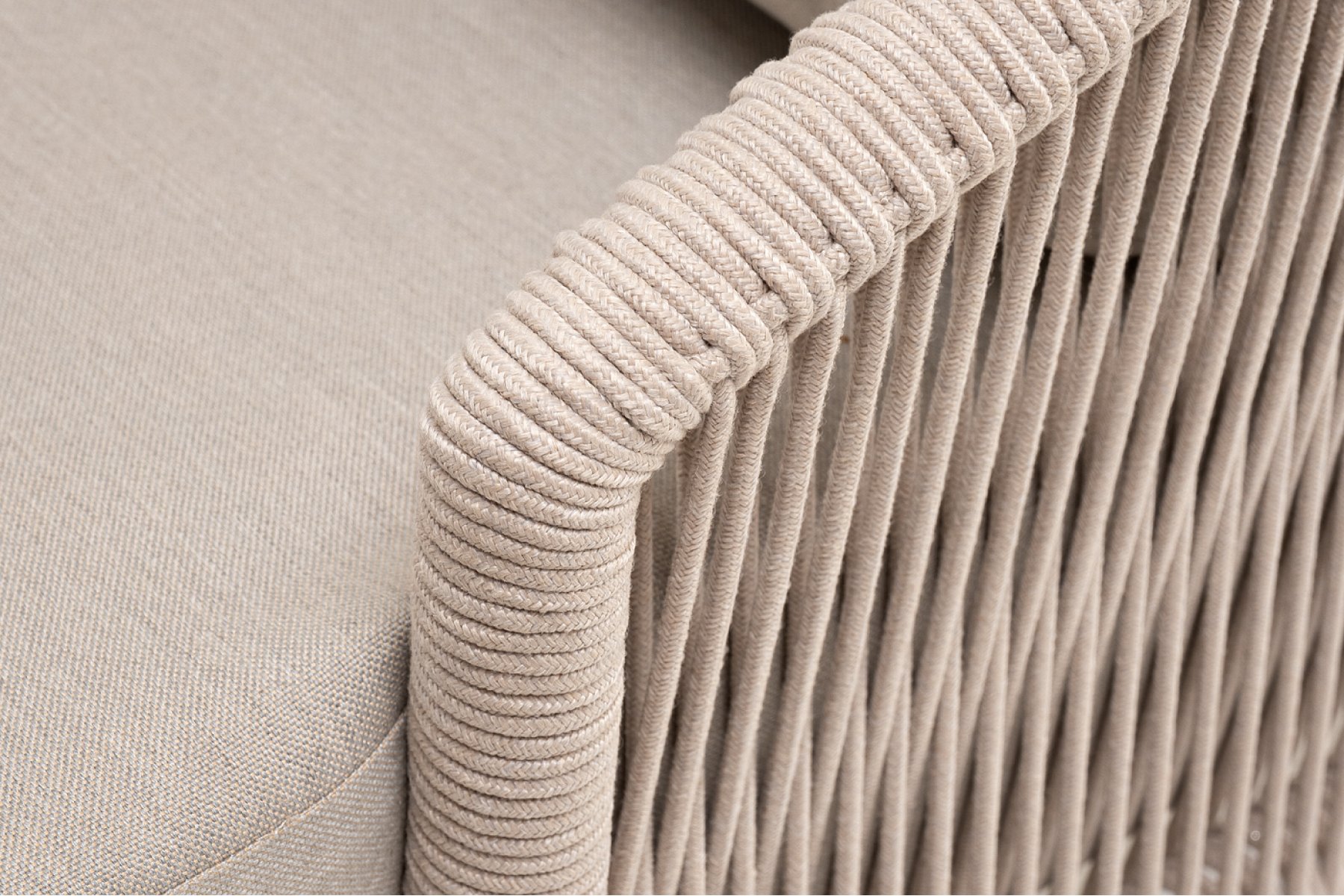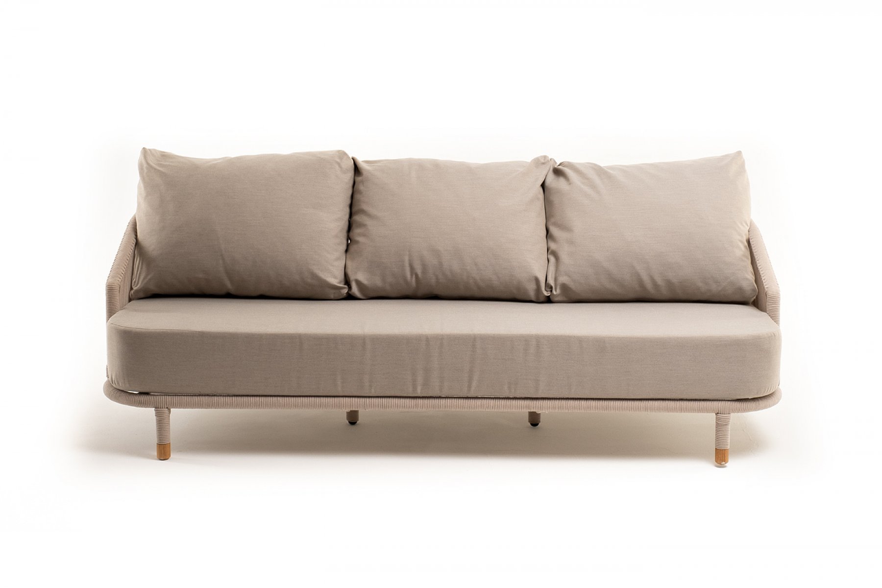 Диван имеет алюминиевый каркас, окрашенный порошковой краской в белый цвет. Боковины каркаса и спинка вручную оплетены роупом - эластичными синтетическими лентами, изготовленными из высокопрочных полиэфирных волокон. Цвет оплетки в тон каркасу - бежевый. На ножках дивана идут дубовые наконечники (заглушки).