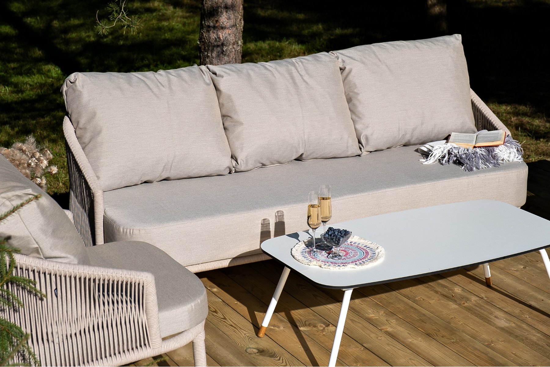 "Верона" диван 3-местный плетеный из роупа, каркас алюминий белый муар, роуп бежевый круглый, ткань бежевая 15052