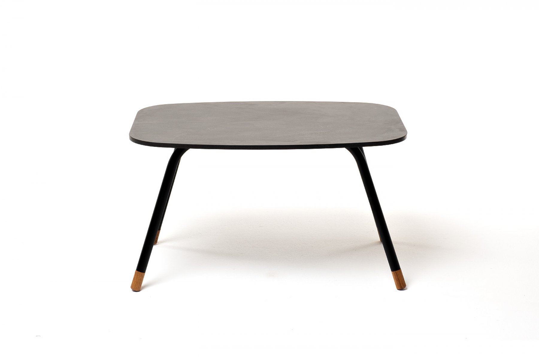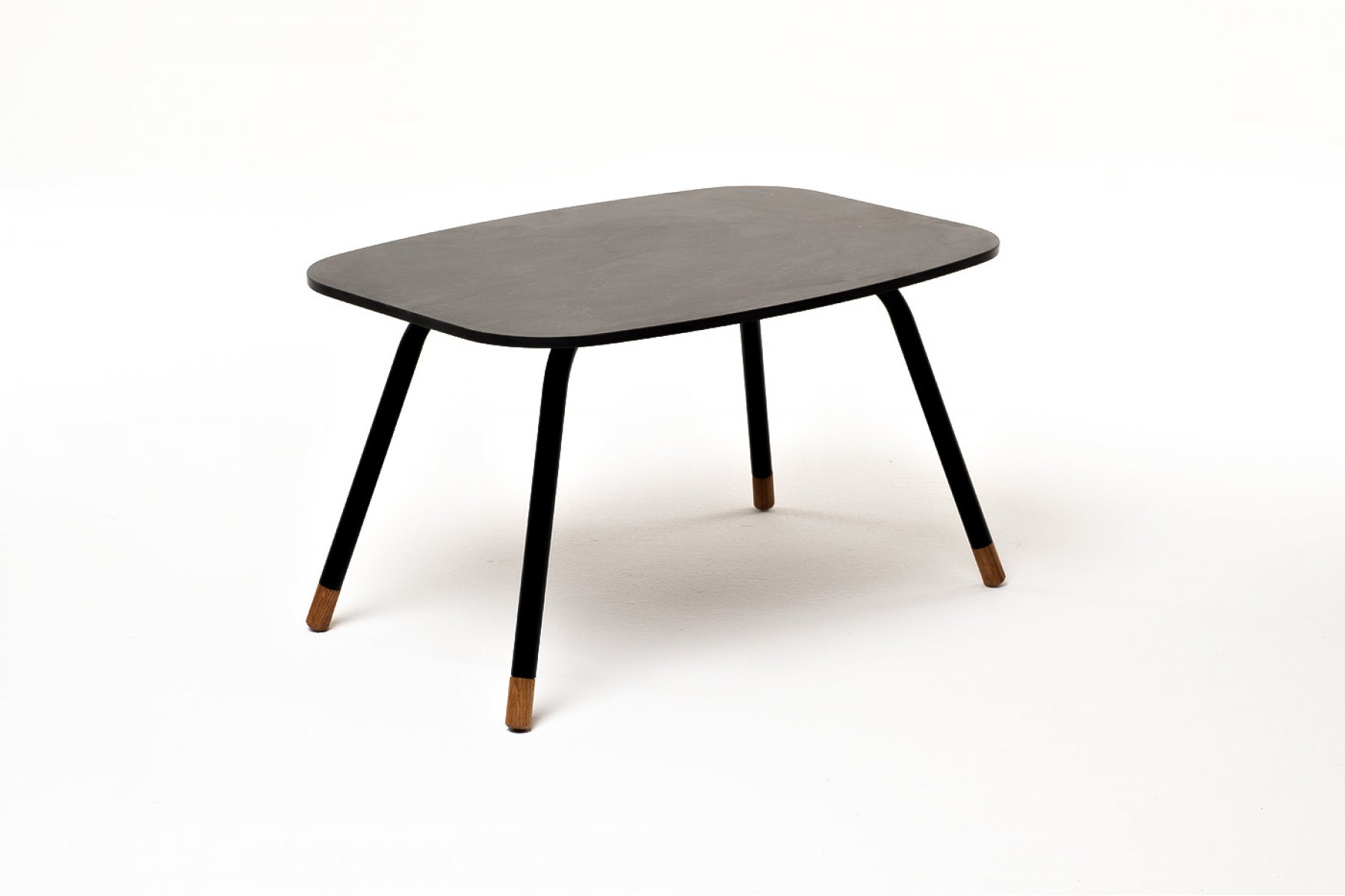 Каркас столика изготовлен из алюминия, окрашенного в черный цвет. Алюминий является легким и прочным материалом, что обеспечивает долговечность и надежность изделия. На ножках столика идут дубовые наконечники (заглушки).