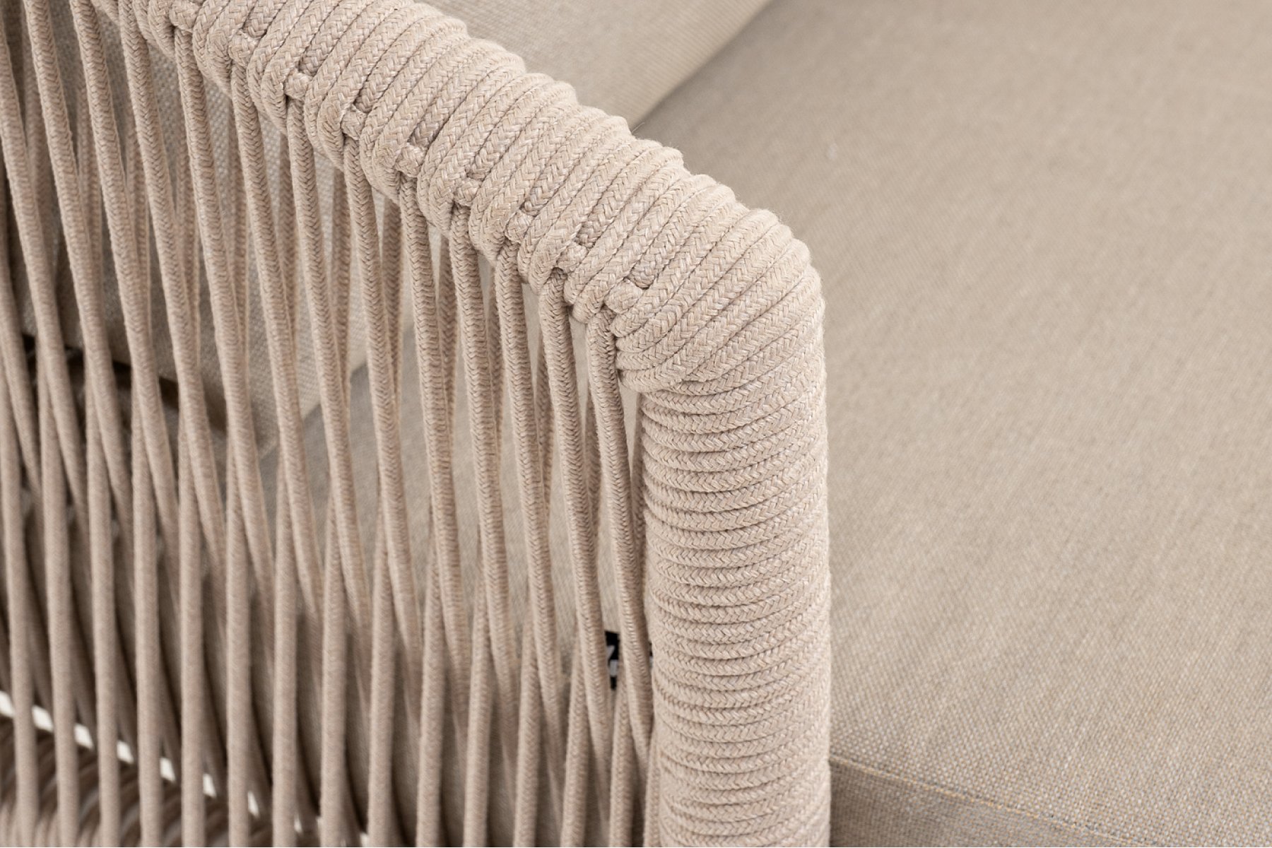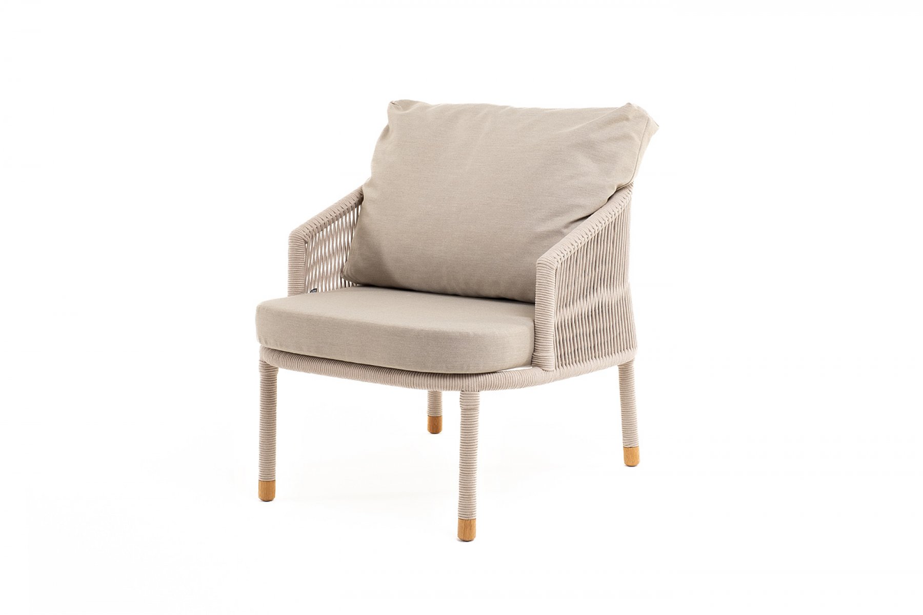 Кресло имеет алюминиевый каркас, окрашенный порошковой краской в белый цвет. Боковины каркаса вручную оплетены роупом - эластичными синтетическими лентами, изготовленными из высокопрочных полиэфирных волокон. Цвет оплетки - бежевый. На ножках кресла идут дубовые наконечники (заглушки).