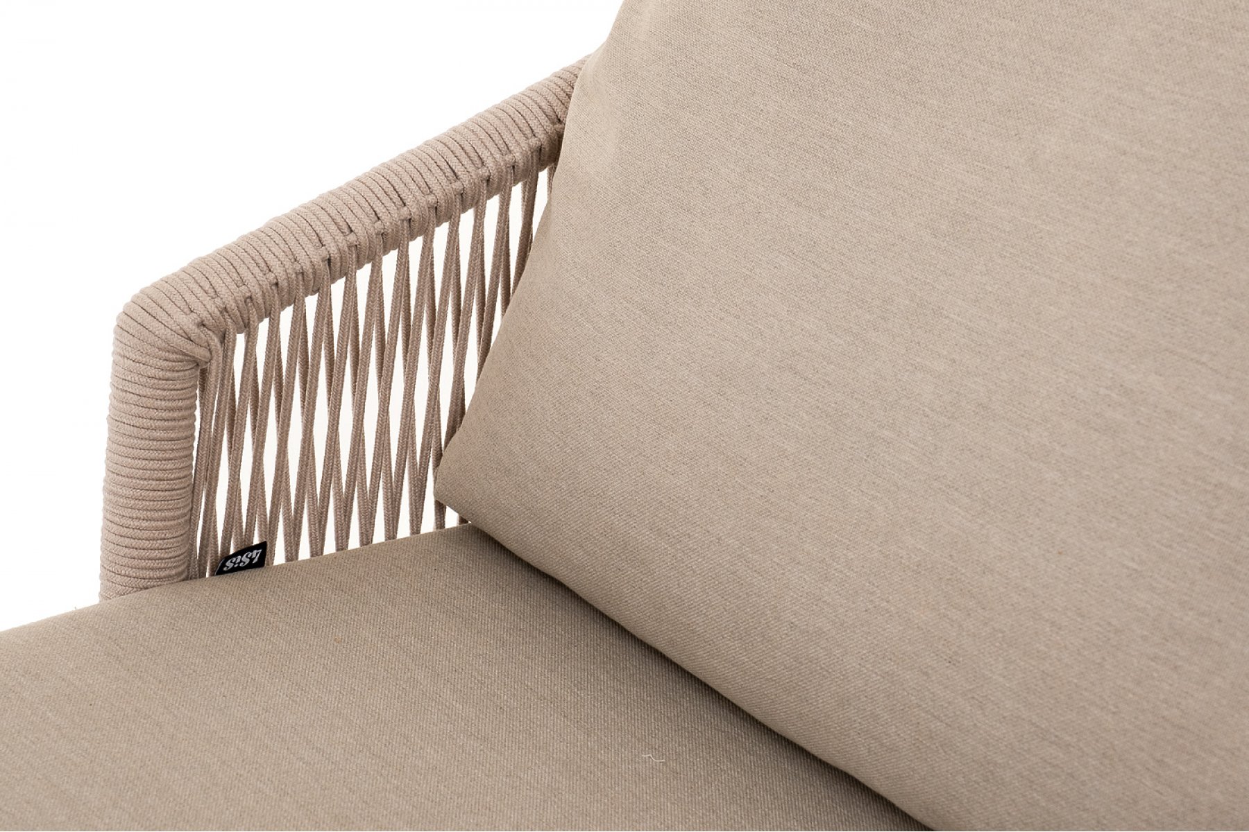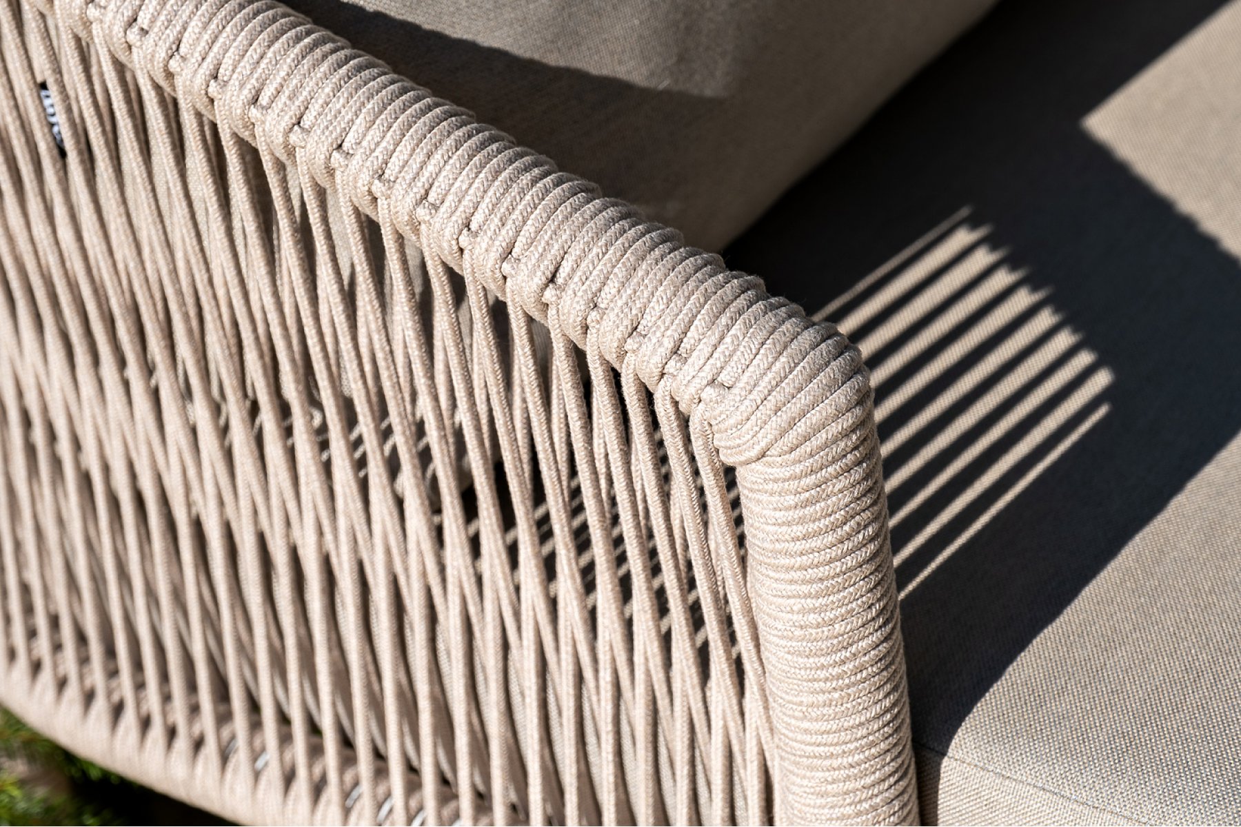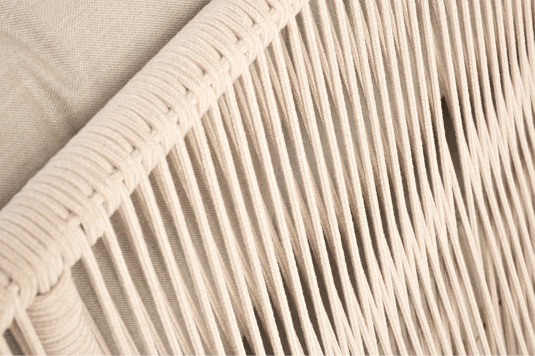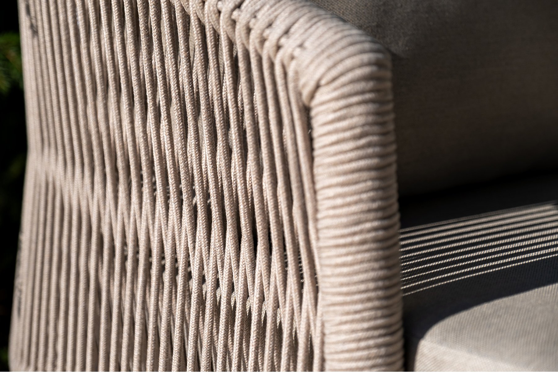 Каркас уличной мебели выполнен из износостойкого алюминия. Его дополняет бежевая ручная оплетка, изготовленная на основе эластичных синтетических лент из полиэфирных волокон высокой прочности (роупа).