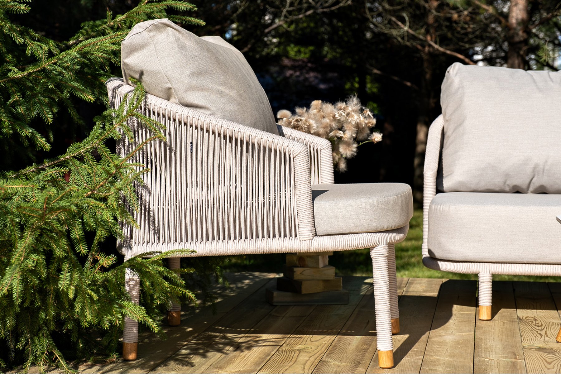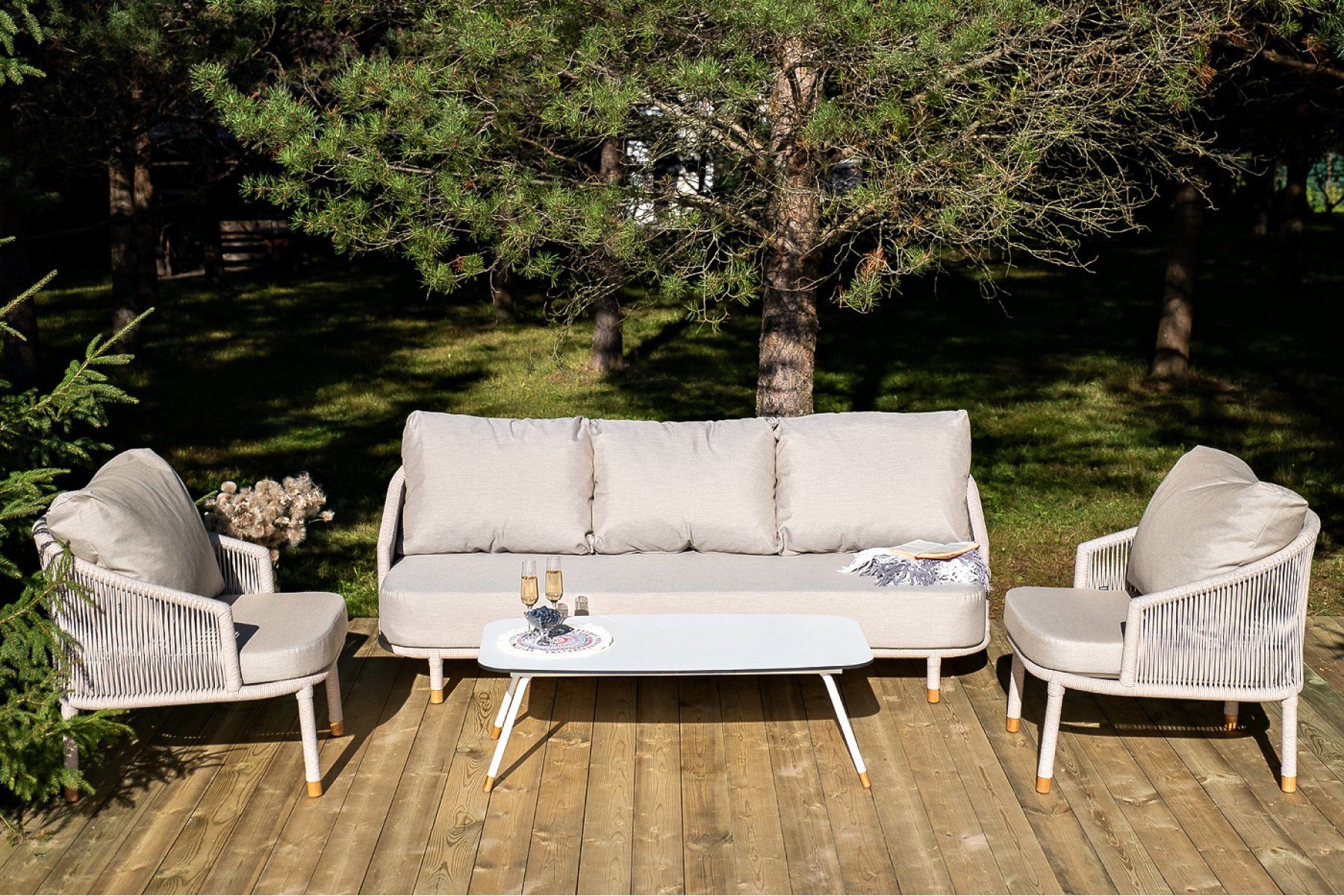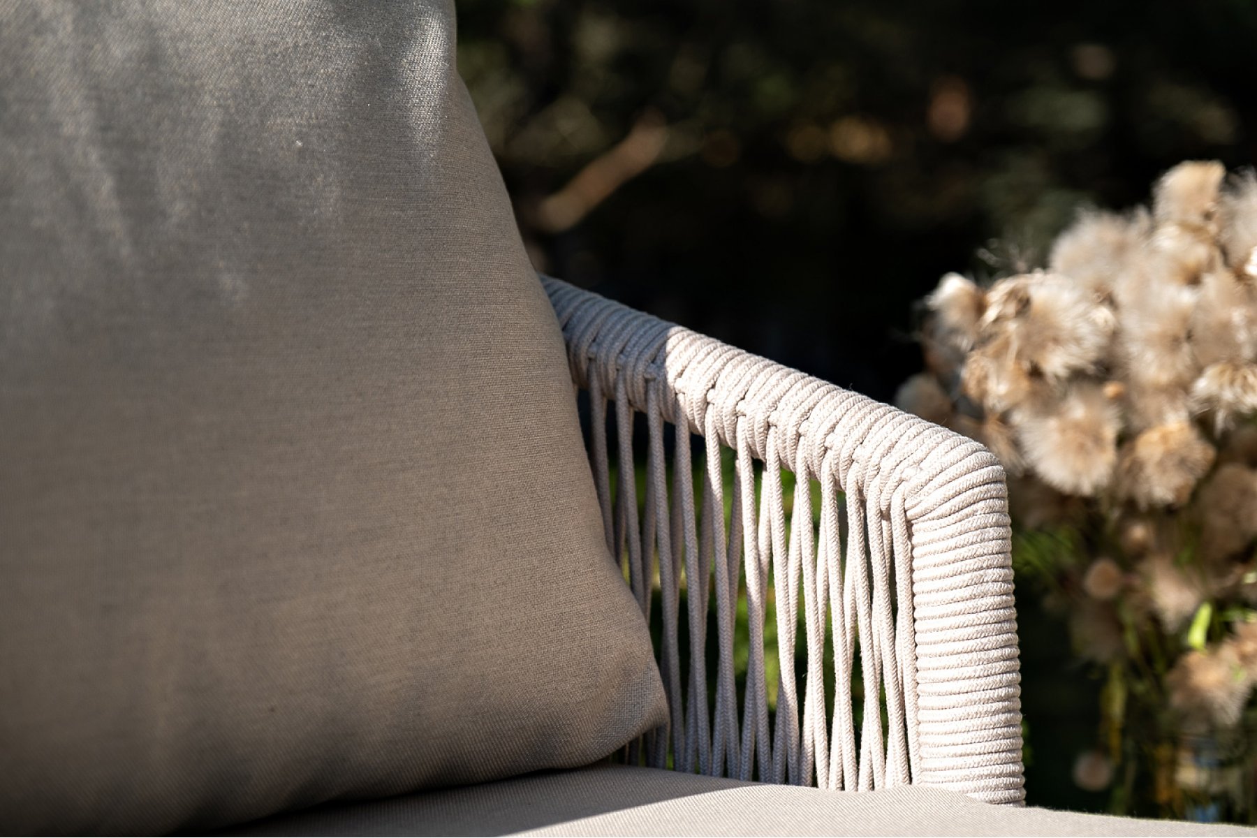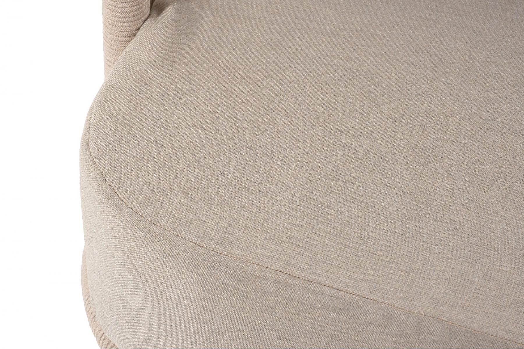 Каркас уличной мебели выполнен из износостойкого алюминия. Его дополняет бежевая ручная оплетка, изготовленная на основе эластичных синтетических лент из полиэфирных волокон высокой прочности (роупа).