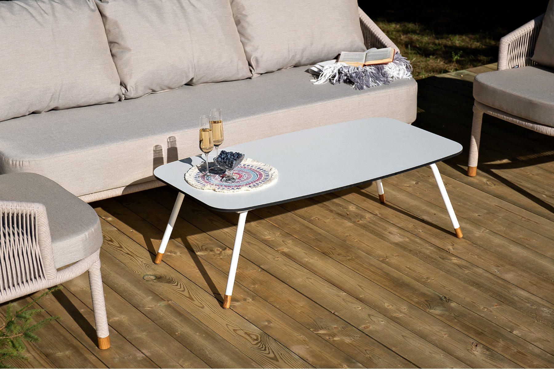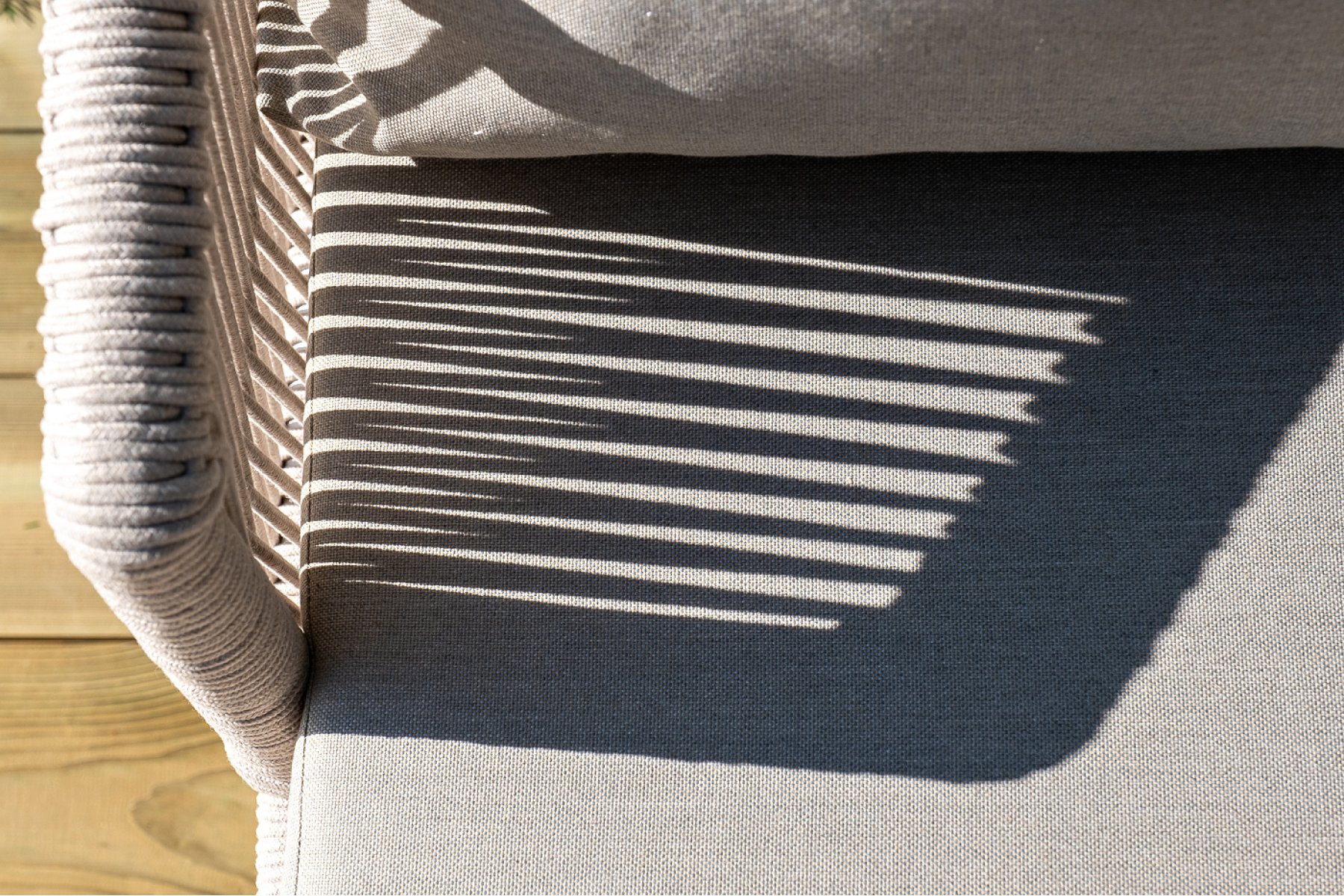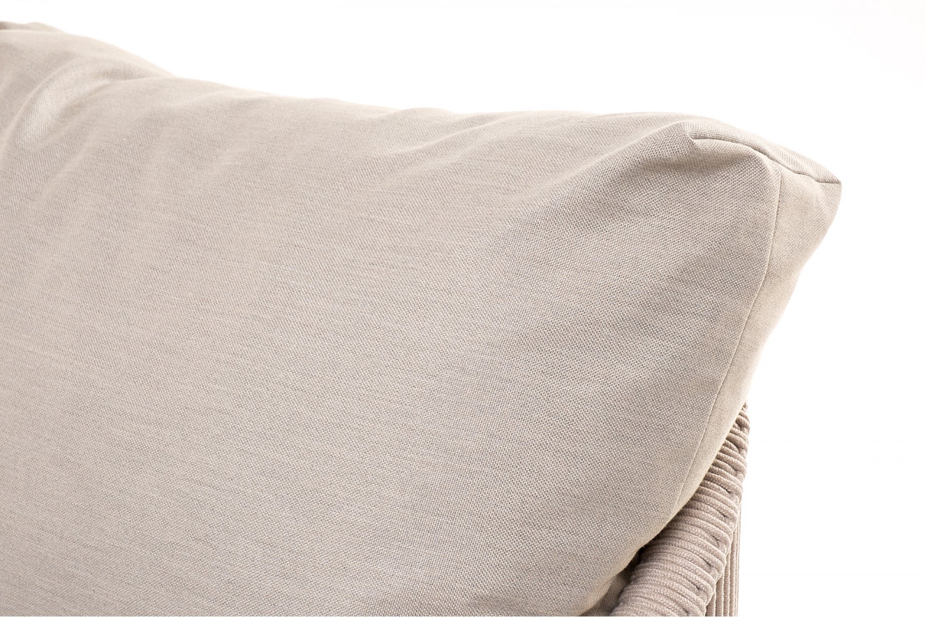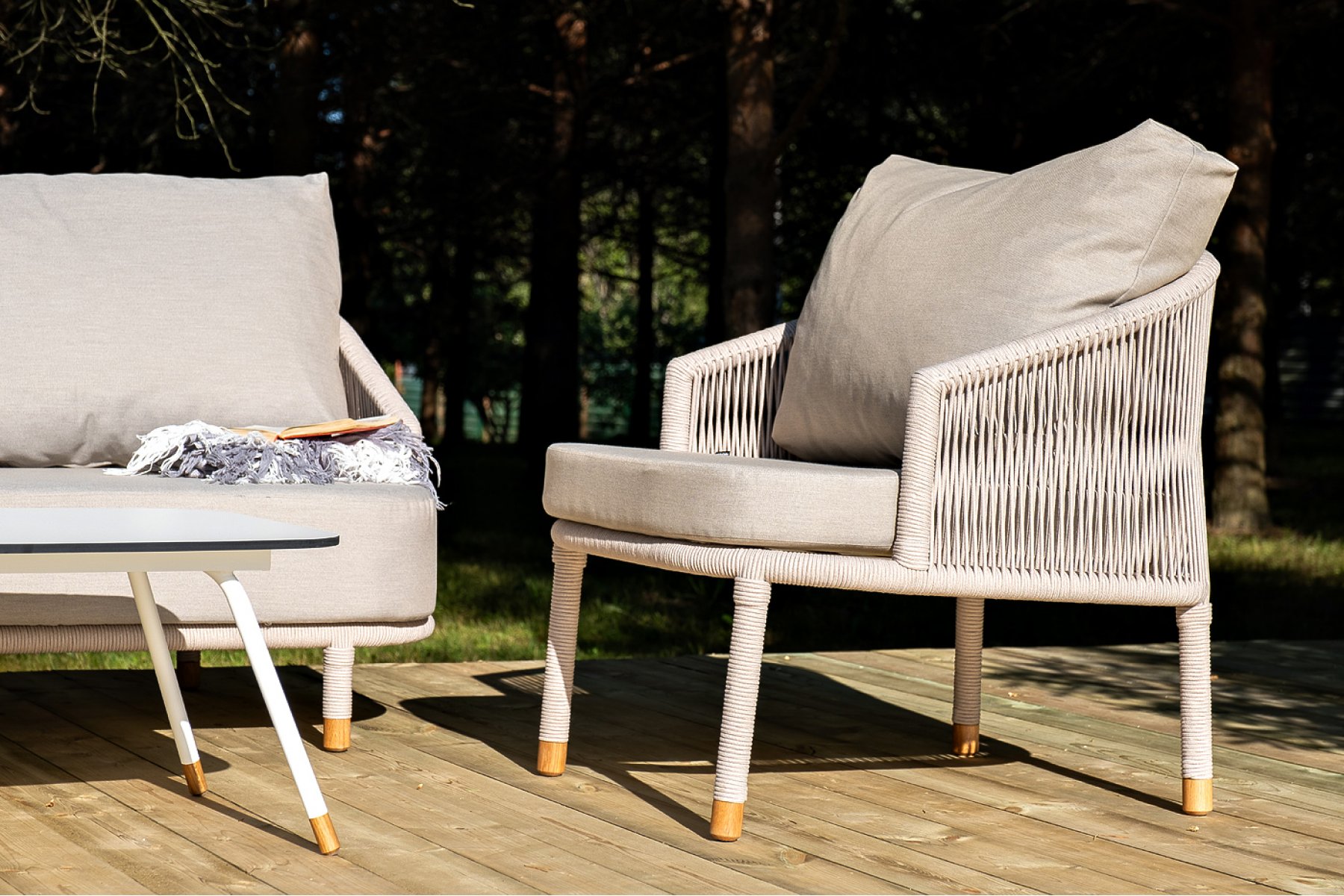 Каркас уличной мебели выполнен из износостойкого алюминия. Его дополняет бежевая ручная оплетка, изготовленная на основе эластичных синтетических лент из полиэфирных волокон высокой прочности (роупа).