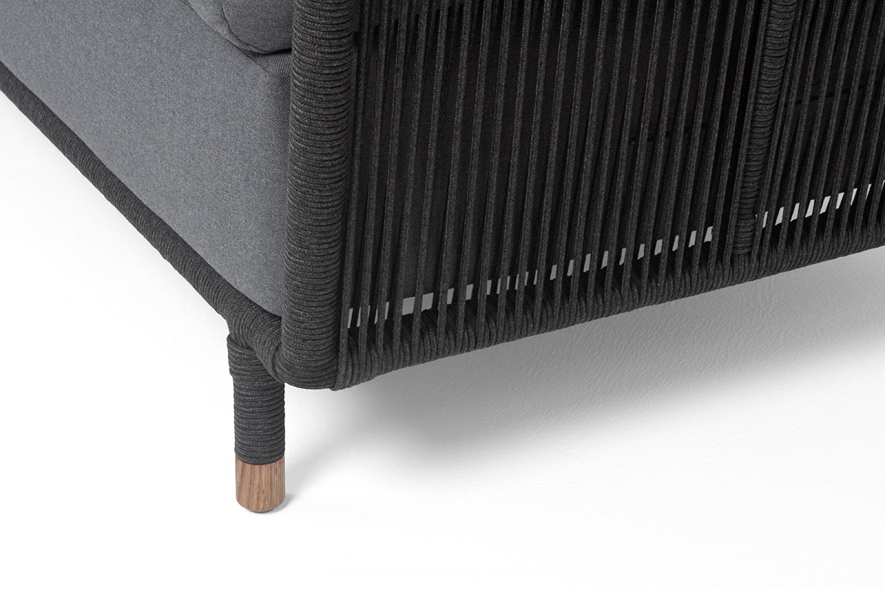 Модуль имеет алюминиевый каркас, окрашенный порошковой краской в темно-серый (RAL7024) цвет. Боковины каркаса вручную оплетены роупом - эластичными синтетическими лентами, изготовленными из высокопрочных полиэфирных волокон. Цвет оплетки - темно-серый.