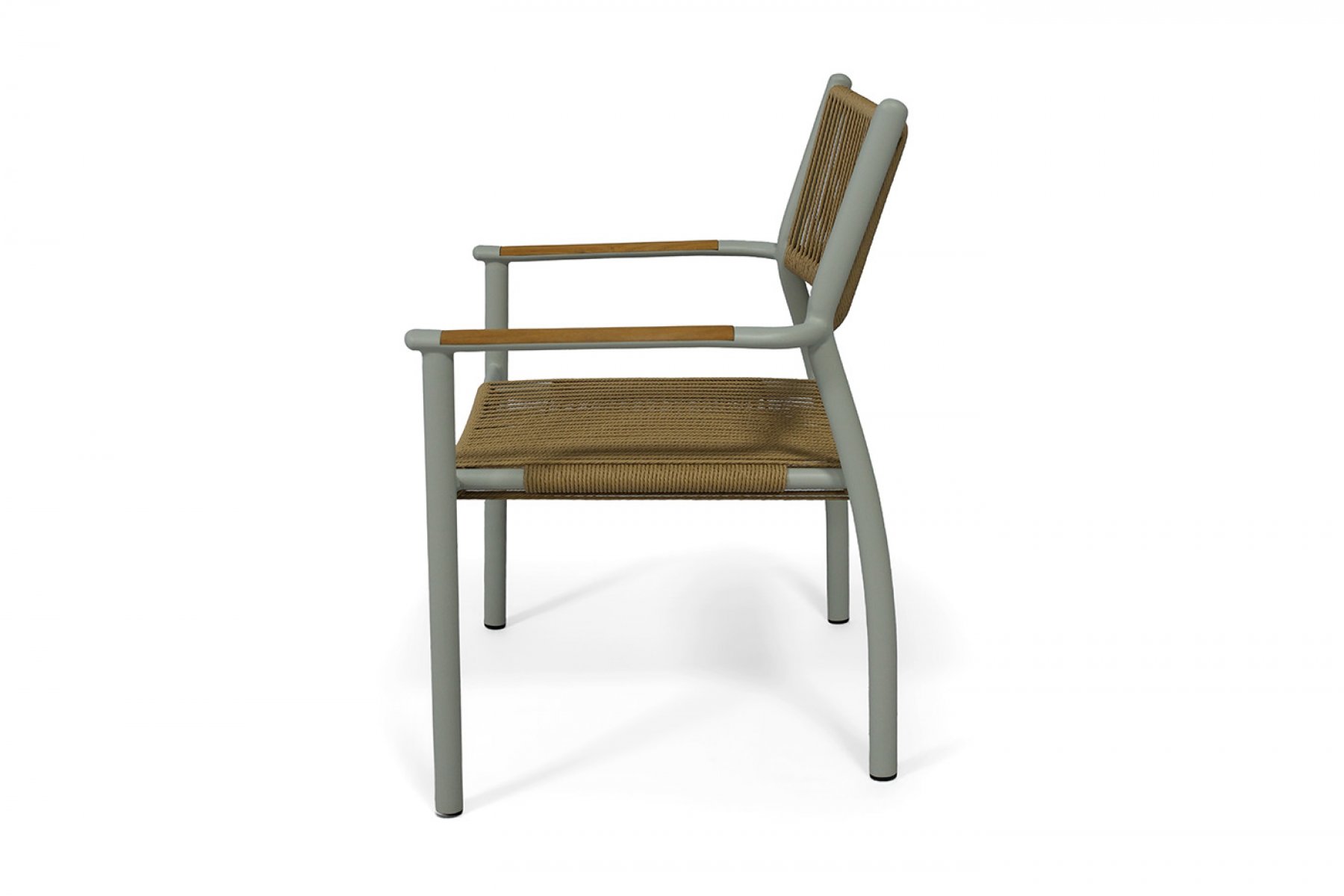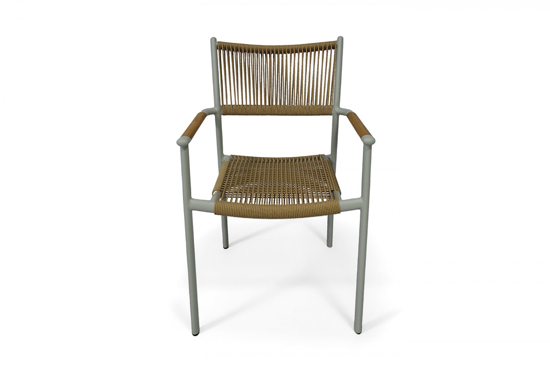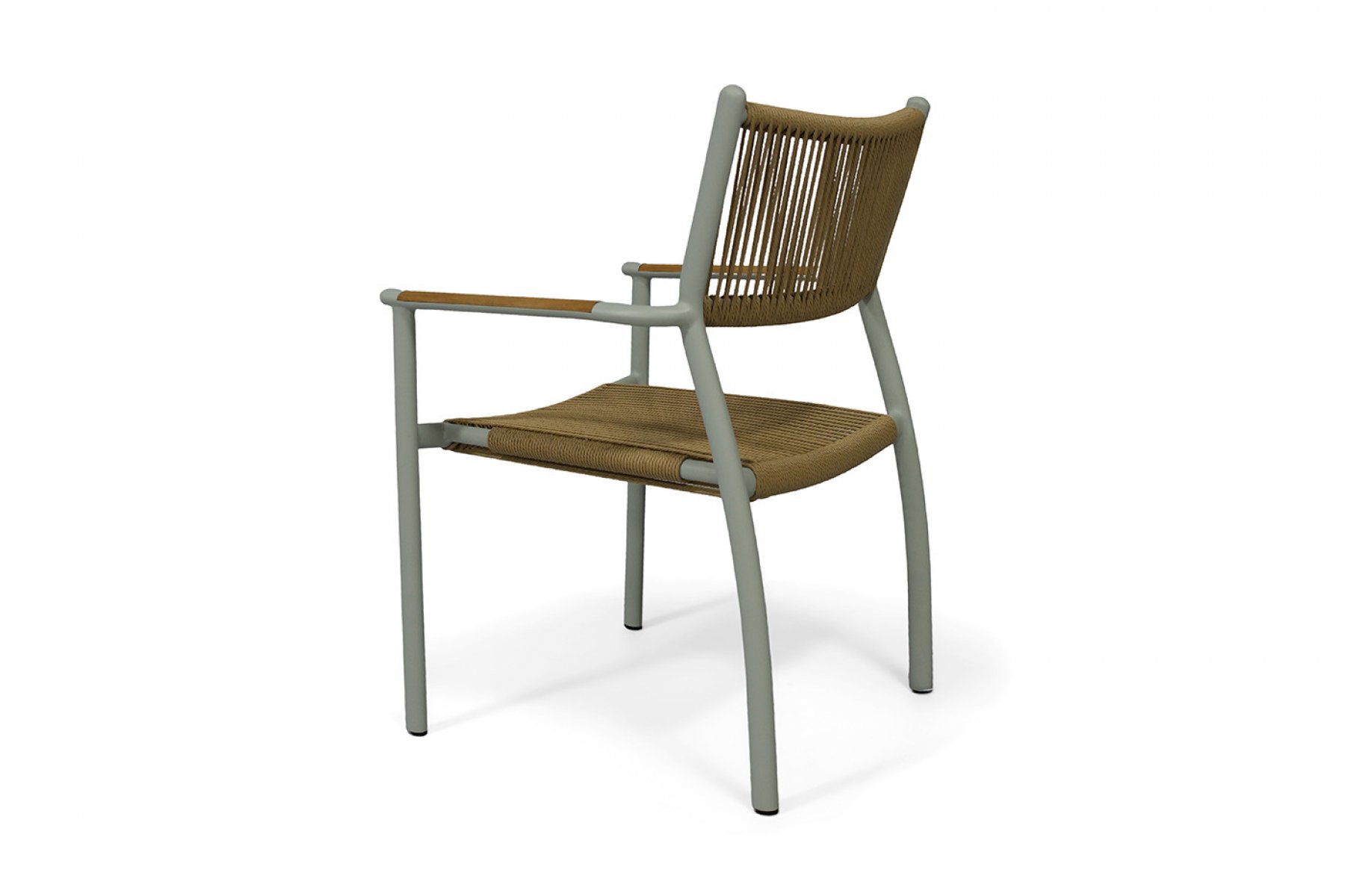 Каркас стула выполнен из легкого, но прочного алюминия, обработанного порошковым покрытием в нежном светло-сером оттенке. Это покрытие не только придает стулу элегантный вид, но и обеспечивает устойчивость к воздействию окружающей среды, делая его идеальным выбором для использования на открытом воздухе.