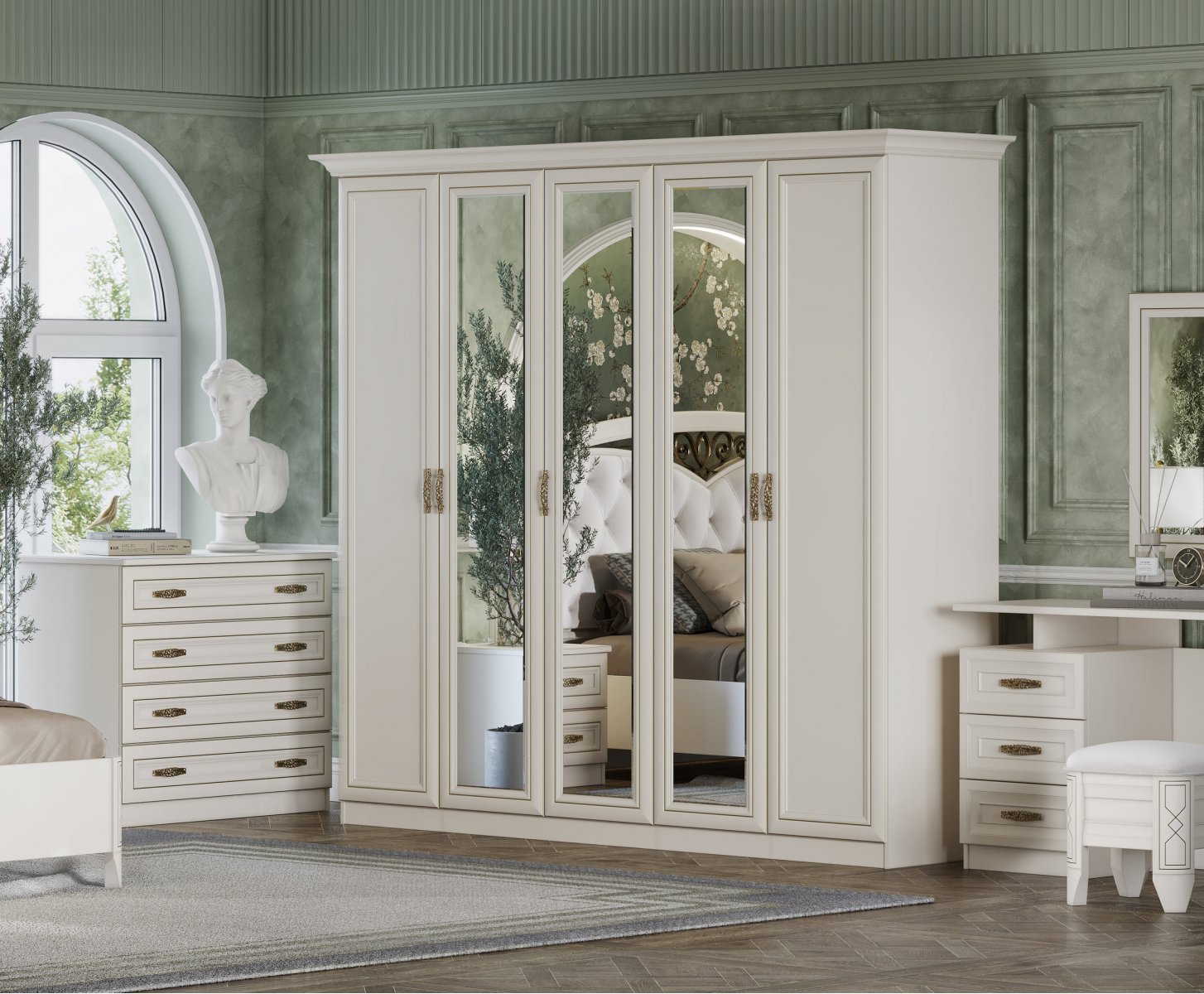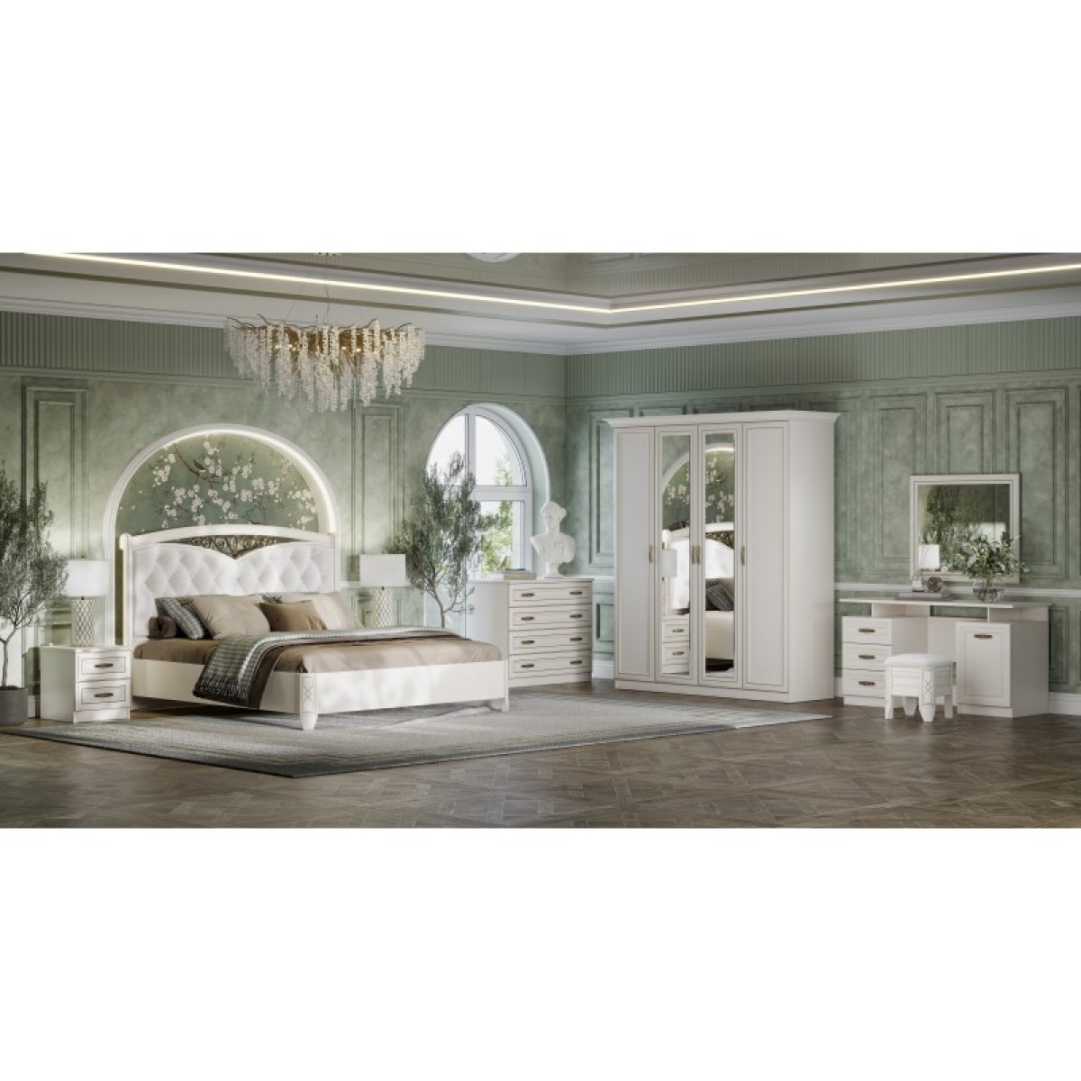 Спальный гарнитур «Оливия» – это элегантная, выверенная классика, которая поможет создать лёгкий и утончённый интерьер вашей спальни. Классические формы, нежный цвет и строгая элегантность никогда не утратят свою популярность. Патина на фасадах идеально гармонирует с изысканной ковкой на изголовье. А роскошные ручки завершают образ, делая спальный гарнитур уникальным.