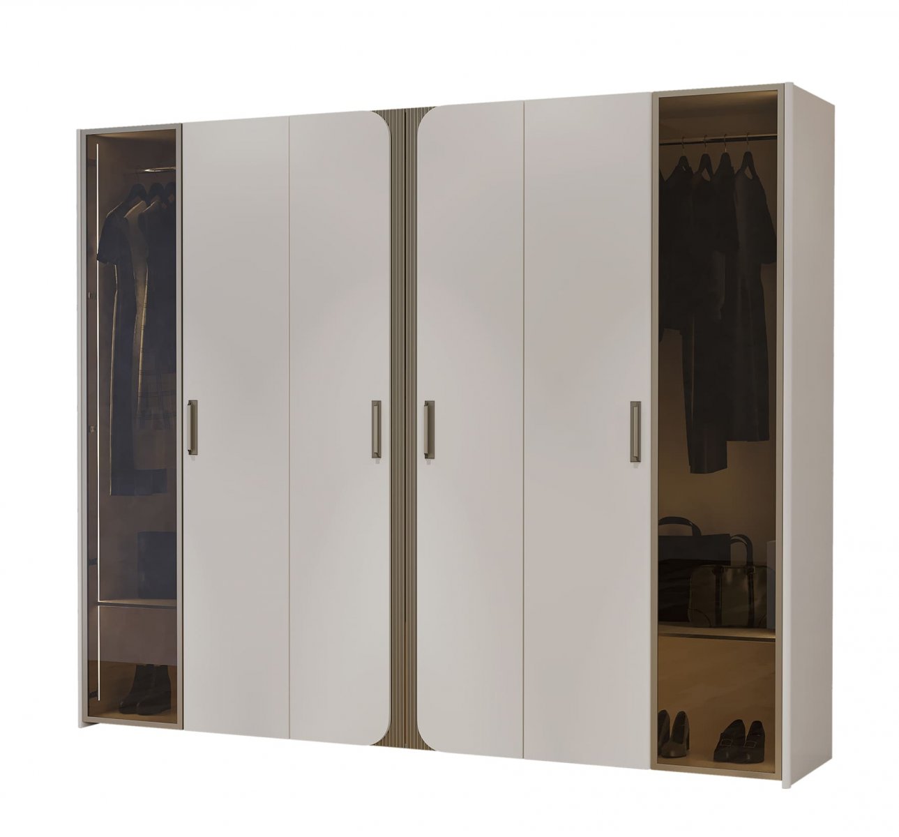 Фасад МДФ толщиной 25 мм (МДФ - древесноволокнистая плита среднего уровня плотности, класс E1 - безопасен для здоровья). Тонированное стекло в алюминиевой рамке золото. Цвет фасадов: крем.