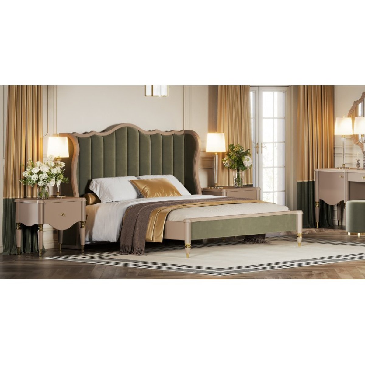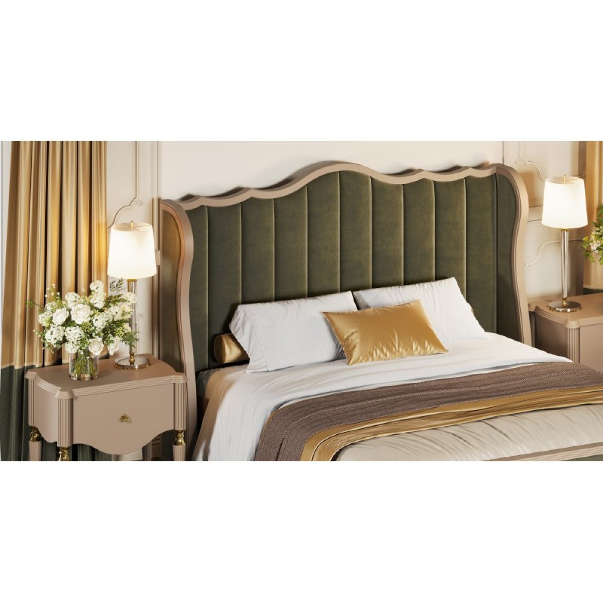 Спальный гарнитур «София» - это триумф утончённости и элегантности классического стиля. Глубокий зелёный оттенок обивки и нежные изгибы изголовья с мягкими бортами создают атмосферу размеренности и спокойствия.