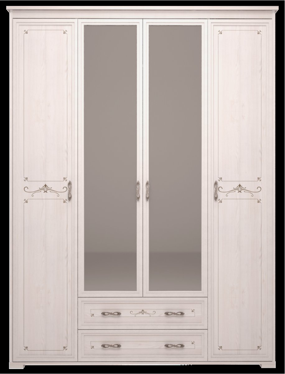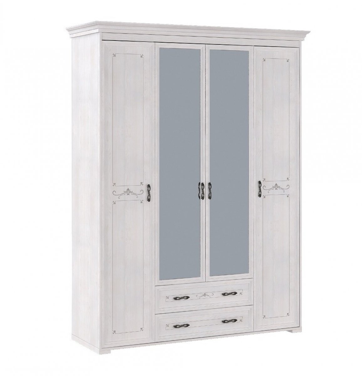Вместительный 4-х дверный шкаф из коллекции«Афродита»позволит разместить весь гардероб. Благодаря продуманному и функциональному наполнению шкафа Вы сможете грамотно организовать хранение в спальной комнате. Основная секция имеет длинную металлическую штангу для платьев, рубашек и другой одежды на плечиках. Две боковые секции имеют в общей сложности 12 глубоких полок для хранения и позволяют разместить не только оставшуюся одежду, а также постельное белье и другие спальные принадлежности. В нижней секции находятся два выдвижных ящика, которые послужат дополнительным местом для хранения Ваших вещей. Полезным дополнением являются зеркала на центральных дверцах — они визуально расширят пространство комнаты. Изюминкой в оформлении станут состаренные фигурные ручки на дверцах и утонченный дизайн фасадов. Для более изящного облика шкаф можно укомплектовать карнизами.
