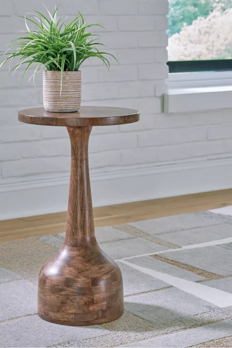 Этот акцентный столик — идеальный пьедестал для растения или изысканного декора. В нём подчёркнута простая и чистая красота дерева. Благодаря лёгкой точеной конструкции он легко встанет между креслами или у стены, предлагая элегантную поверхность для напитков и мелочей. Строгий и эффектный, он станет безупречным дополнением современного интерьера.