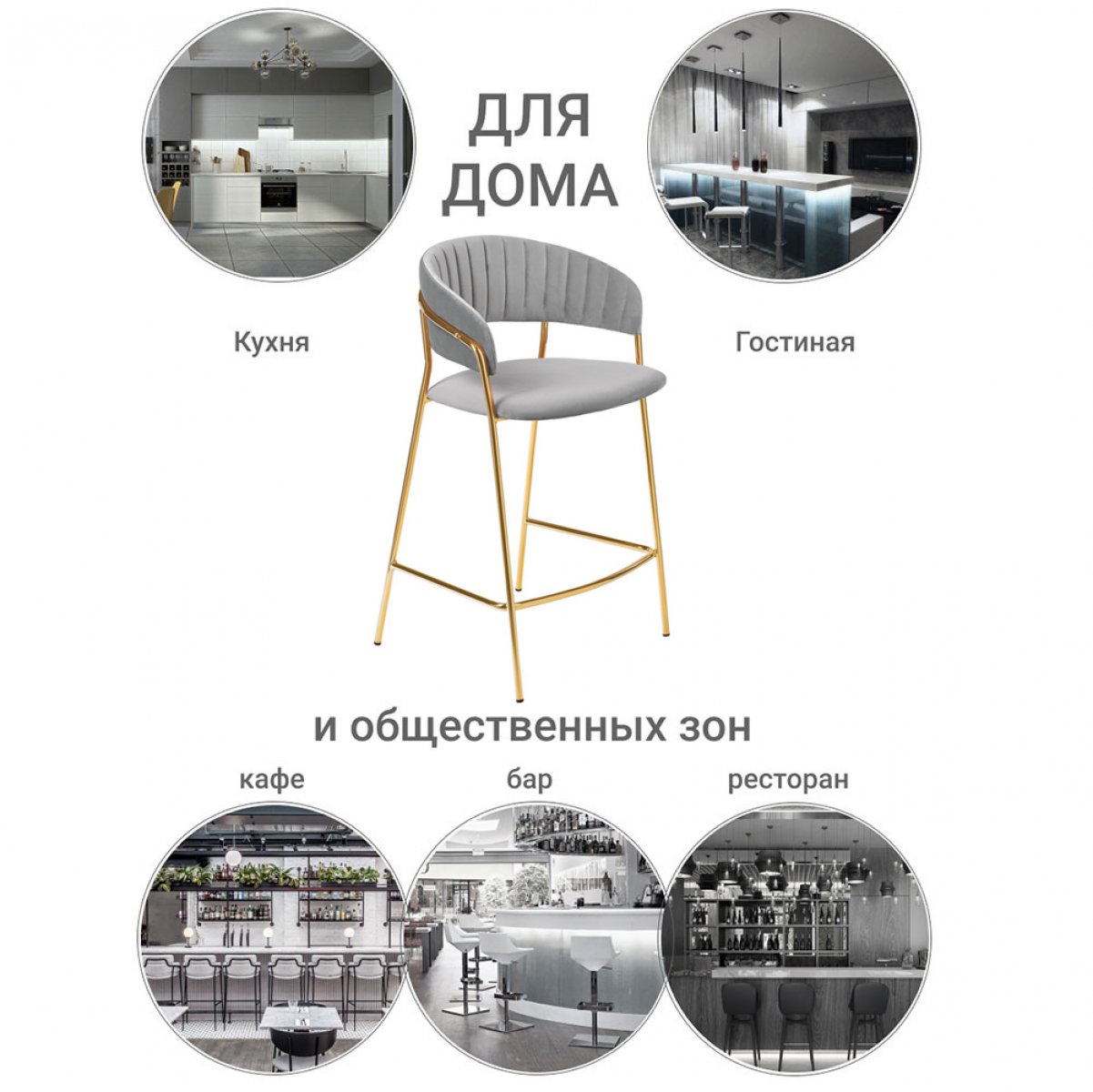 Полубарный стул Turin серый с золотыми ножками повторяет дизайн моделей стульев Turin и Avatar, что позволяет реализовать различные пространства помещения в едином стилевом решении.