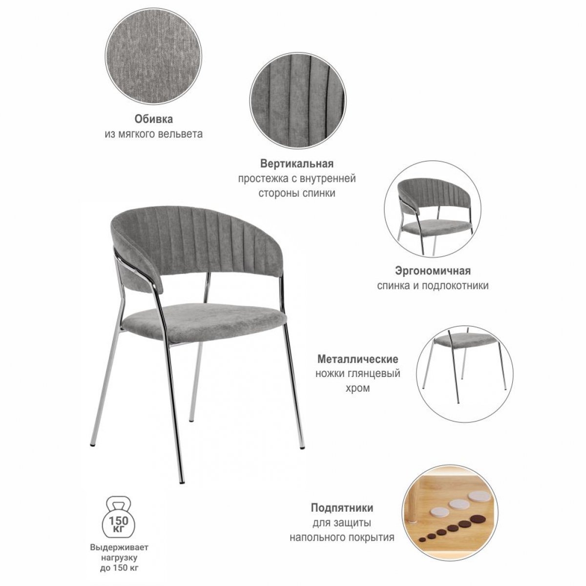 Практичный вельвет придает обивке мягкую текстуру и тактильную теплоту. Он не только комфортен в использовании, но и устойчив к ежедневным нагрузкам. Изящные хромированные ножки из металла добавляют композиции визуальную легкость и прочную устойчивость.