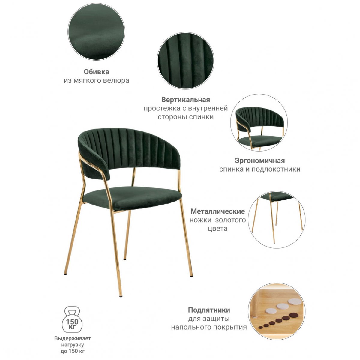 Мягкий велюр обивки дарит исключительный комфорт во время продолжительных трапез или дружеских встреч. Прочный металлический каркас гарантирует устойчивость и долговечность всей конструкции.
