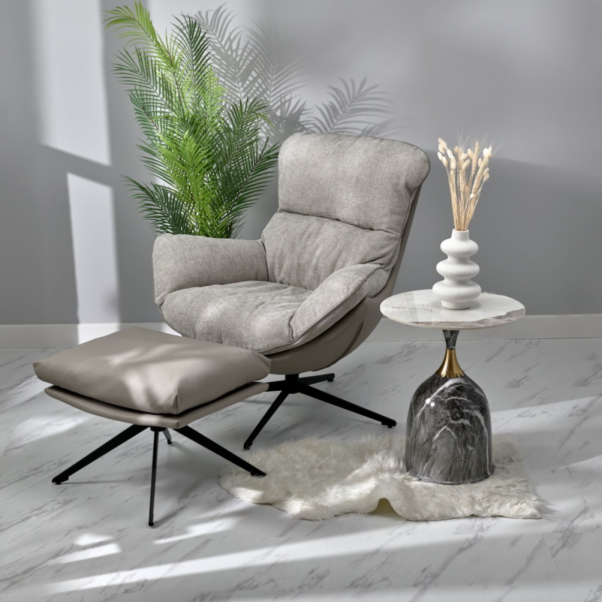 Лаундж-кресло вращается на 360 градусов, и для полного релакса советуем дополнить его удобной оттоманкой.