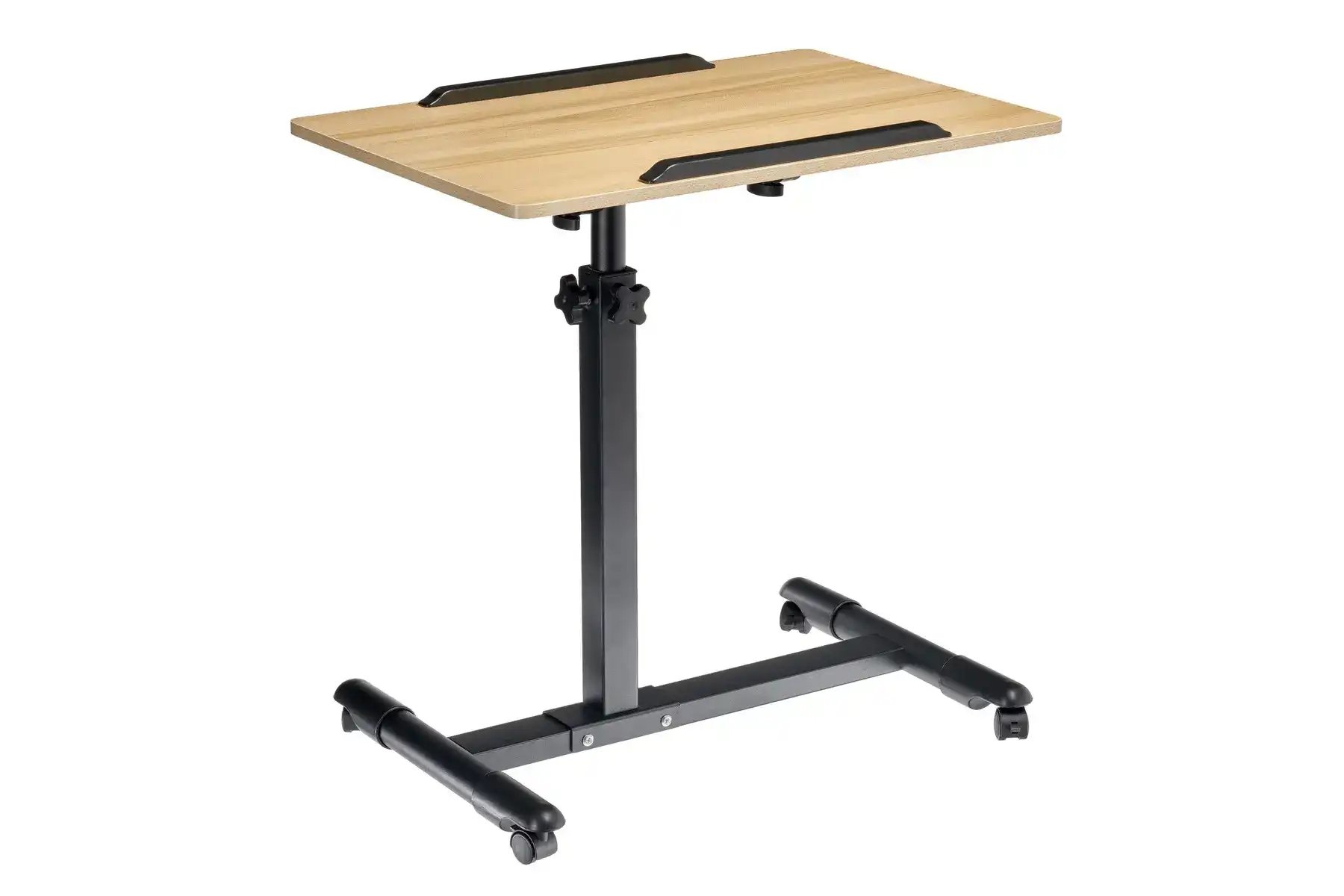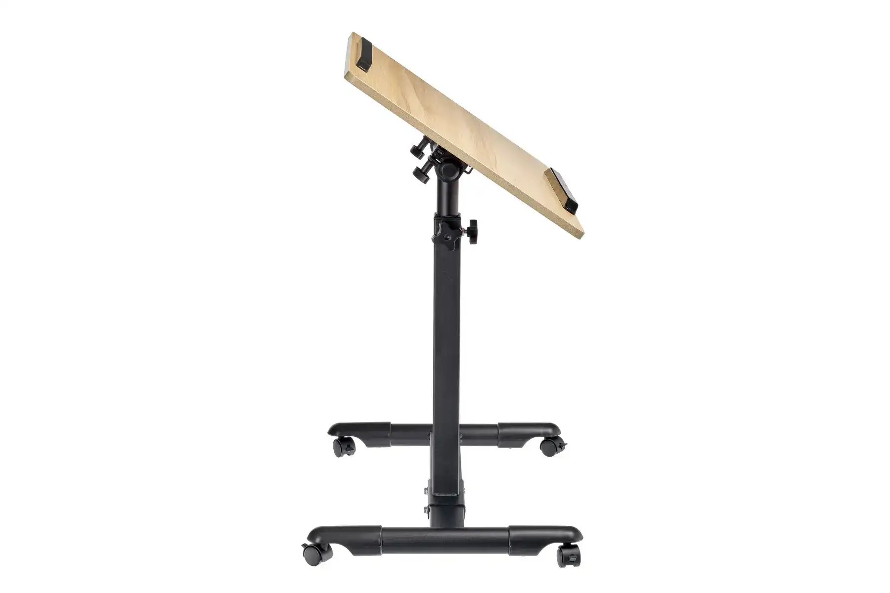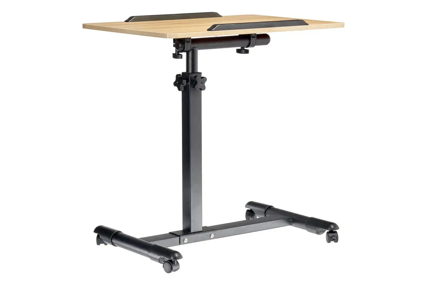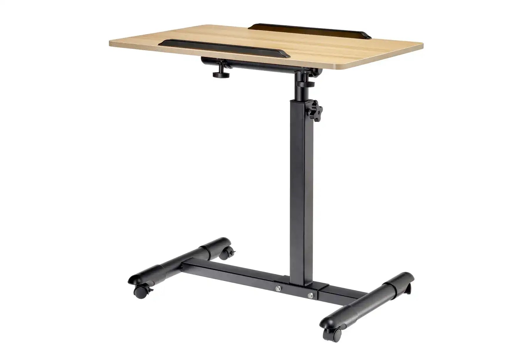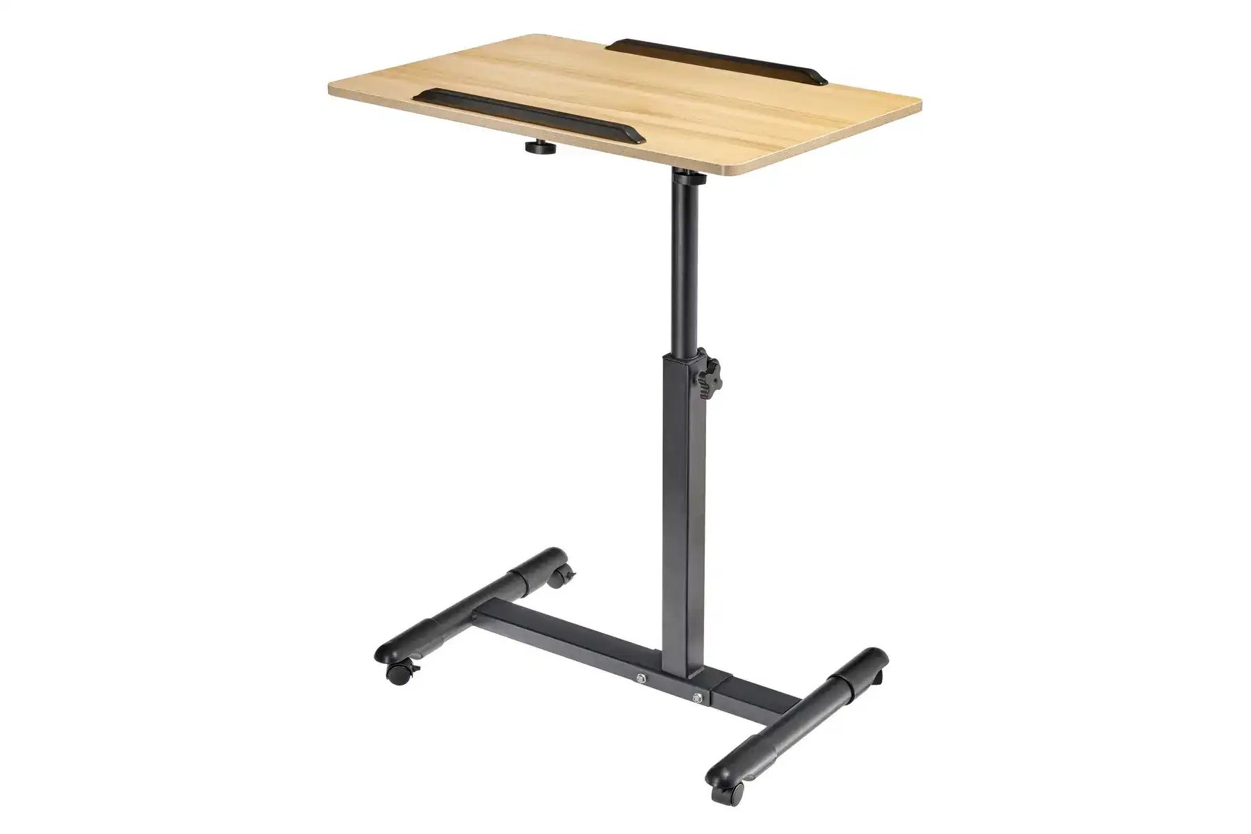 | Спецификация: | Материал: МДФ, металл, пластик. Цвет: столешница - светлое дерево, ножка - черный, ограничители - черный. Размер столешницы: 60 х 40 см. Регулировка по высоте: от 65 до 97 см. Размер основания с колесами: 58 х 44,3 см. Толщина металла: 0,7 мм. |