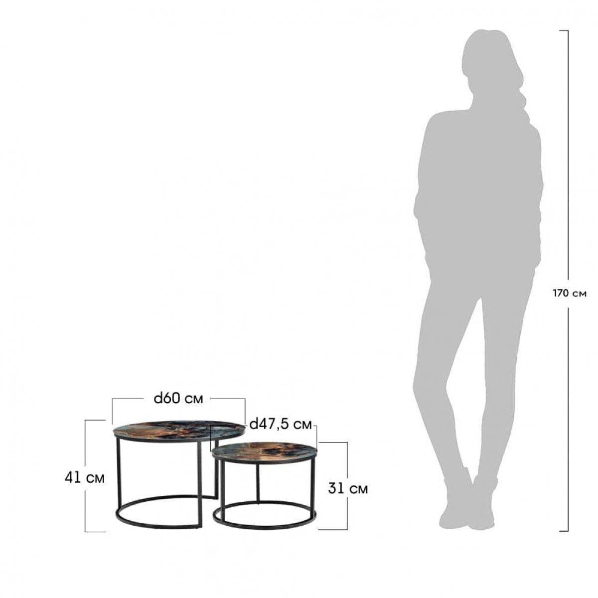 Элегантная пара кофейных столиков Tango станет изящным дополнением любой гостинной или даже спальни. Рисунок на столешнице, выполенной из закалённого стекла, завораживает и притягивает взгляд. Столики можно расположить парой или расставить по отдельности. Чёрные ножки позволят вписать этот набор в любой интерьер. Размер большого столика: диам.60х41см. Размер маленького столика: диам.47,5х31см