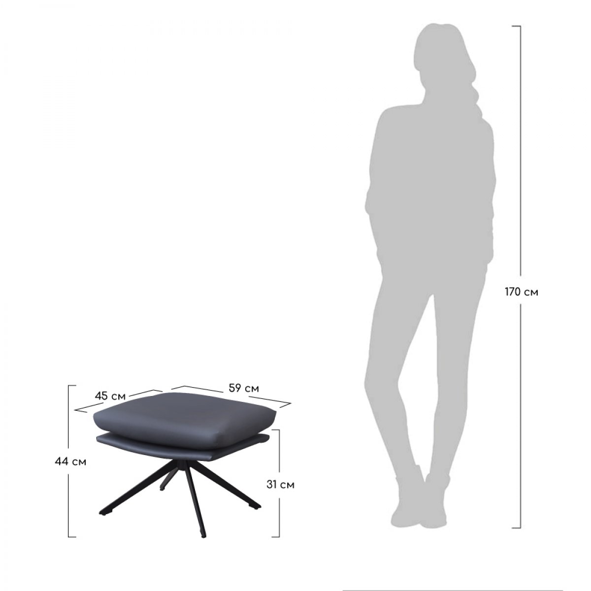 Ножки оттоманки изготовлены из прочного металла, что обеспечивает ее устойчивость и долговечность. Обивка оттоманки выполнена из мягкой и приятной на ощупь экокожи, которая выглядит стильно и современно.