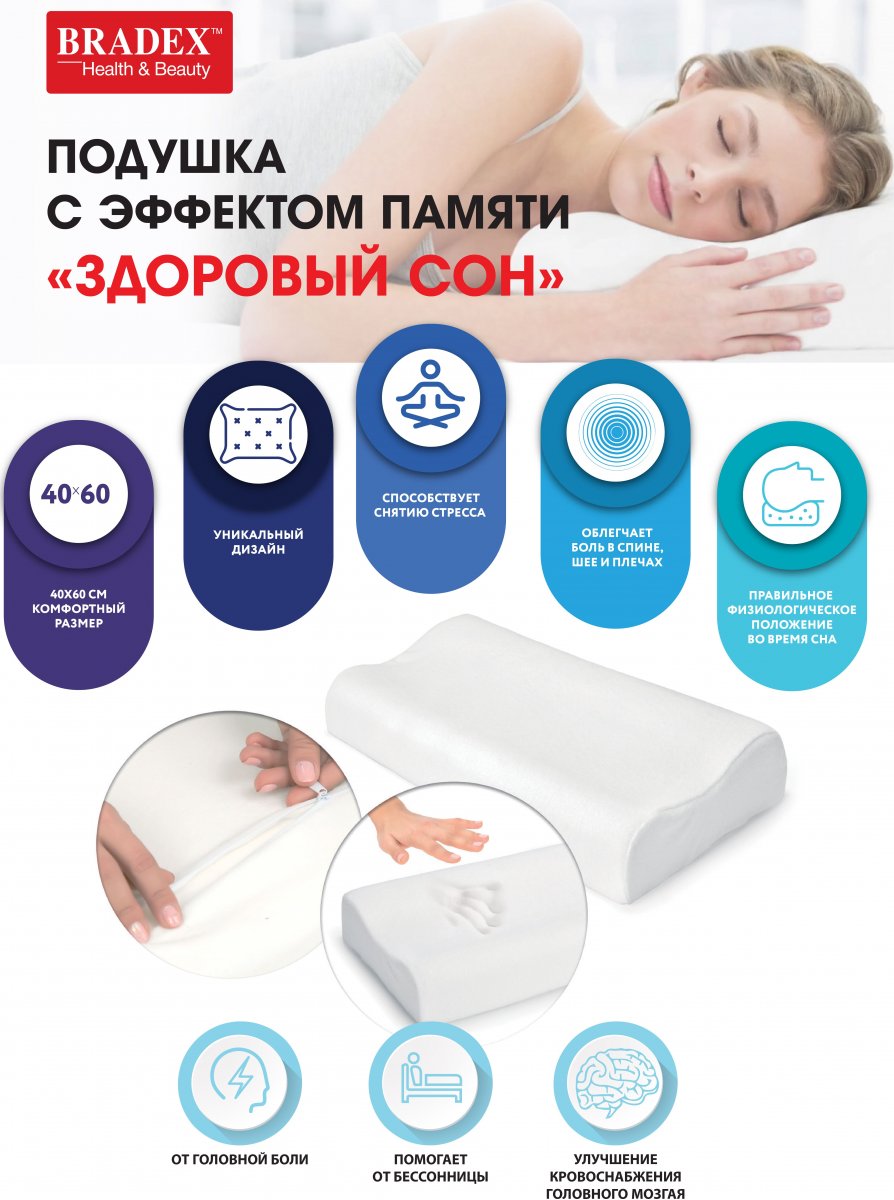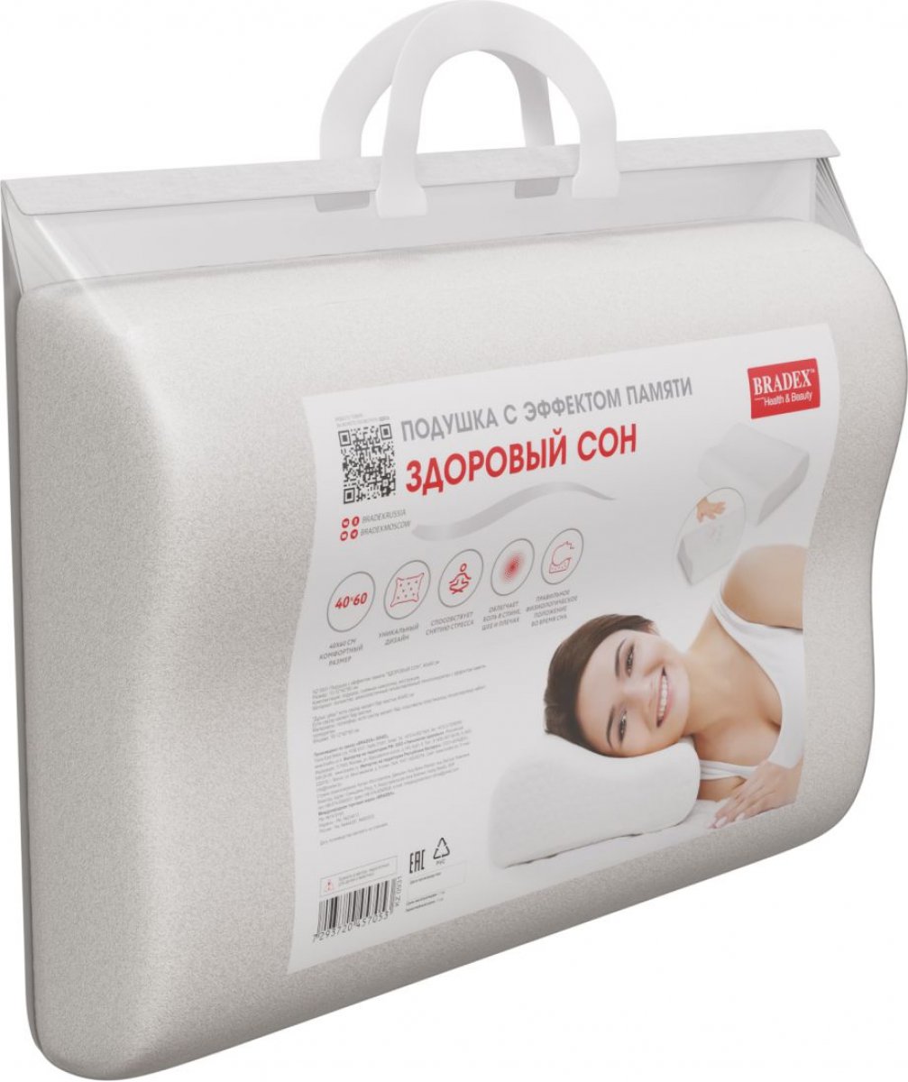 Подушка с эффектом памяти Здоровый сон оказывает физиологически правильную, ортопедическую поддержку головы и шеи во время сна и отдыха за счет уникального гипоаллергенного наполнителя – пенополиуретана с эффектом памяти. Съёмная наволочка из натурального хлопка, приятного на ощупь, легко застегивается на молнию и обеспечивает простой уход за изделием. Идеальная плотность пенополиуретана подушки Здоровый сон от BRADEXтм обеспечивает физиологически правильное положение головы и шеи во время сна, нормальное кровоснабжение мозга и, как следствие, отличный цвет лица, отсутствие синяков и мешков под глазами. Под воздействием тепла и веса ортопедическая подушка вдавливается, принимая форму головы и шеи, вследствие чего давление распределяется равномерно по всей контактной поверхности, сосуды не пережимаются и позвоночник находится в расслабленном положении. Комфортный размер подушки 40х60 см позволяет спать и свободно переворачиваться во сне. Эта подушка обеспечит здоровый и спокойный сон в любом положении. Подушка с эффектом памяти Здоровый сон рассчитана для обеспечения глубокого сна. Будьте здоровы вместе с BRADEX!