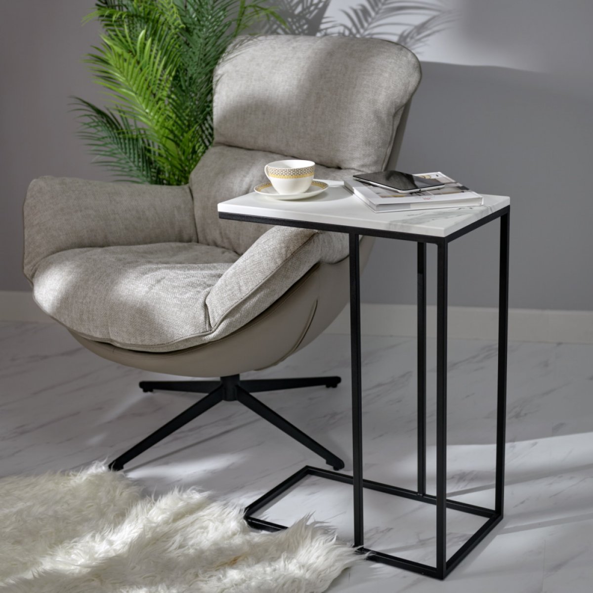 Придиванный столик Loft 50x30см, белый мрамор, чёрные ножки