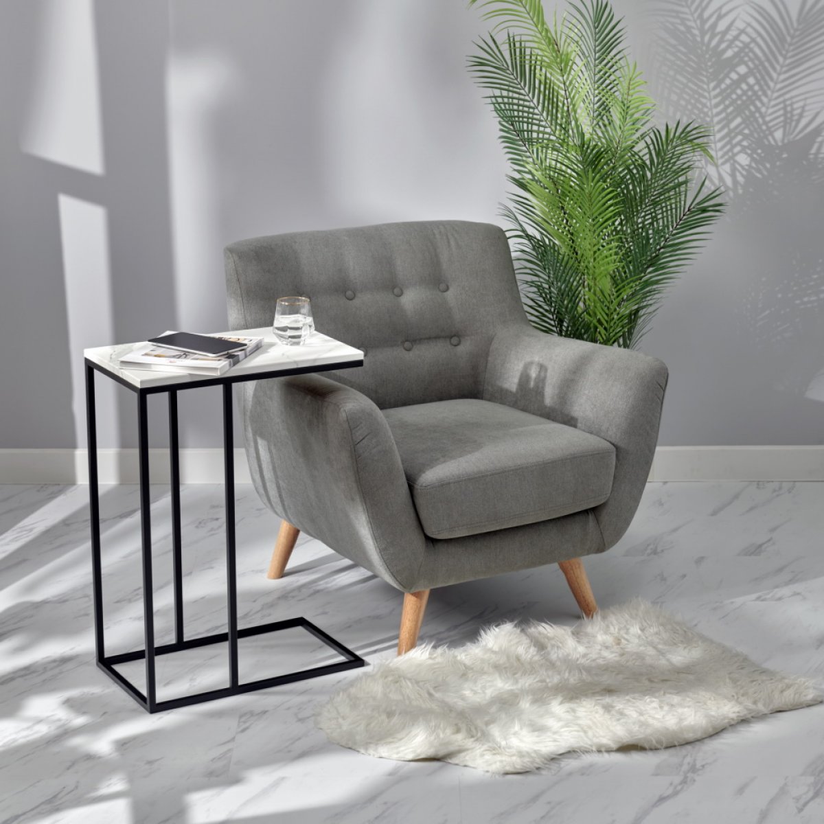 Придиванный столик Loft - это стильный и функциональный предмет мебели, который дополнит интерьер в современном стиле. Loft не займет много места и легко поместится рядом с диваном или креслом. Конструкция столика позволяет расположить столешницу прямо над диваном или боковиной дивана, что достаточно удобно и функционально. Столик выполнен из прочного ЛДСП оттенка белый мрамор, что придает ему изящный вид, а черные металлические ножки добавляют конструкции дополнительную воздушность и устойчивость. Будьте уверены, что столик Loft станет удачным приобретением для вашего уютного уголка.
