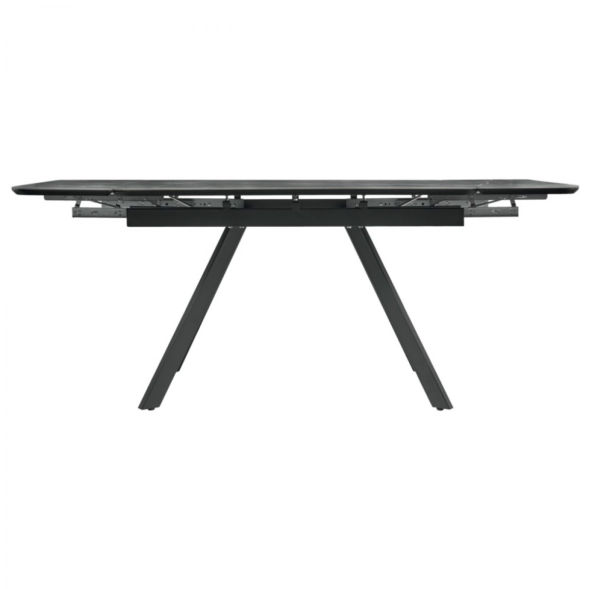 Обеденный стол с синхронно-подъемным механизмом раздвижения (центральная вставка). Столешница из тонкой керамики. Этот материал долговечный и устойчивый к механическим воздействиям, передает структуру и микрорельеф натурального камня. Опоры выполнены из стали, устойчивы и при этом визуально легкие, окрашены в благородный матовый черный цвет. Размер: 120-184x80x75см. Толщина столешницы 25 мм. Стол поставляется в разобранном виде (2 коробки).