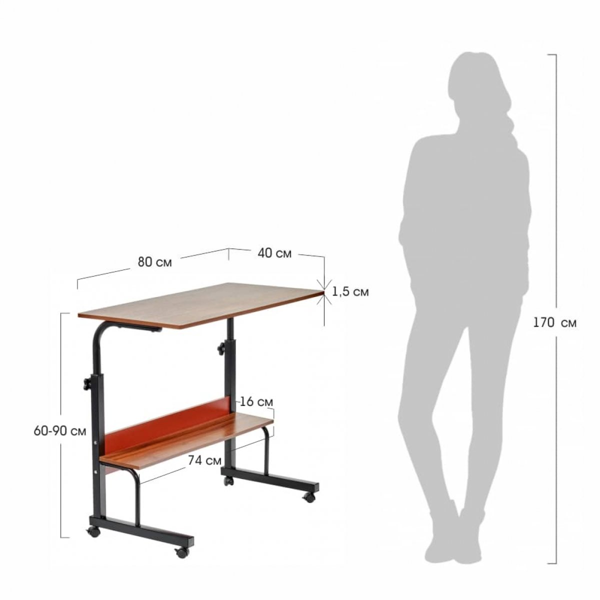 | Спецификация: | Материал: МДФ12 мм, металл 0.7мм Кромка ПВХ 0,6 мм Размер: 80x40x66-90см Толщина столешницы: 12мм Вес: 6,2кг Максимальная нагрузка: 45кг Полка размером 74x16см Регулировка высоты от 66 до 90 см 4 пластиковых колеса |