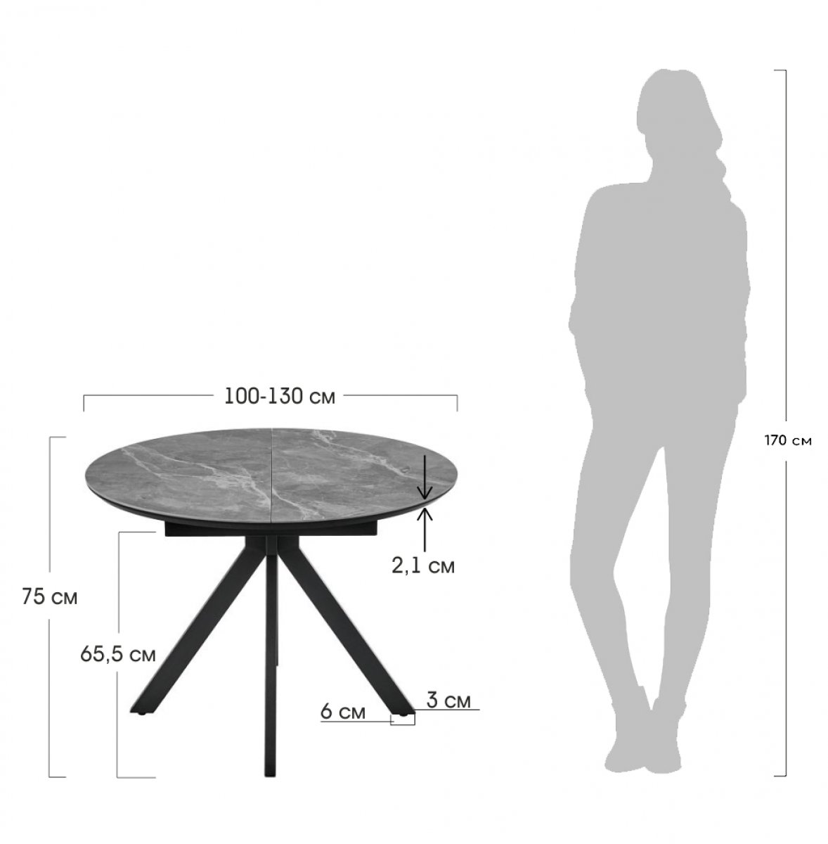 Стол Rudolf круглый раскладной 100-130x100x75см, серый керамогранит, черный
