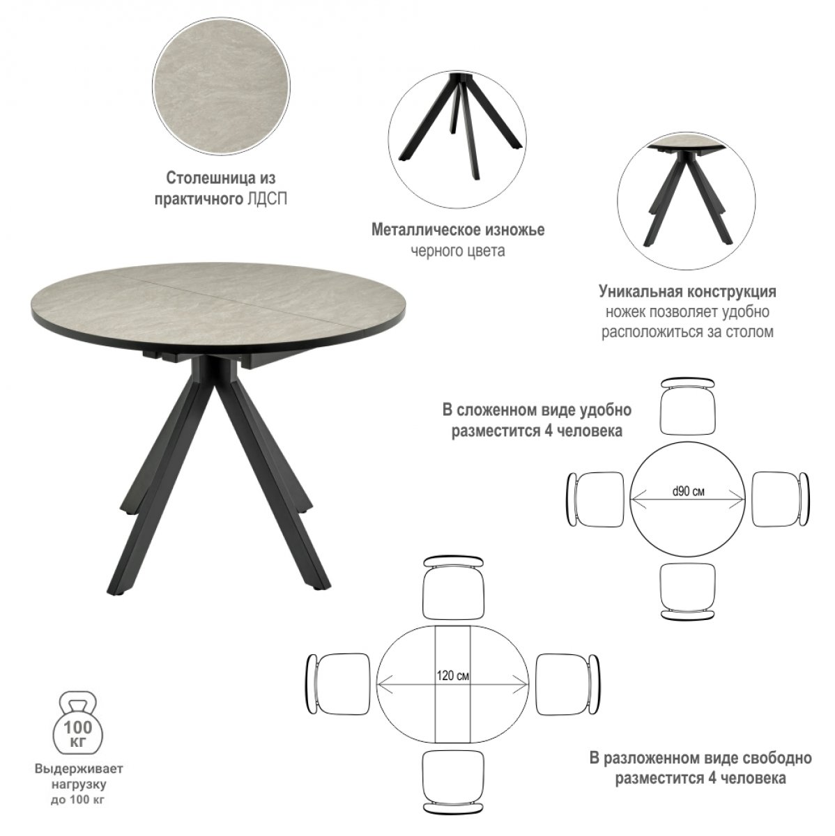 | Спецификация: | Размер: 90-120x90x75см. Материал столешницы: ЛДСП 22мм, пластик, кромка ПВХ. Механизм раскладывания: бабочка. Материал ножек: металл с порошковым покрытием. |