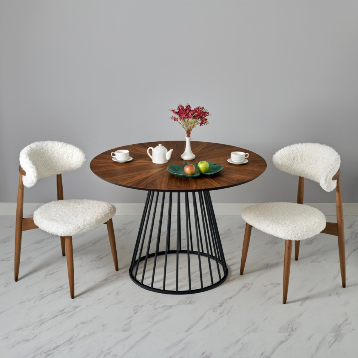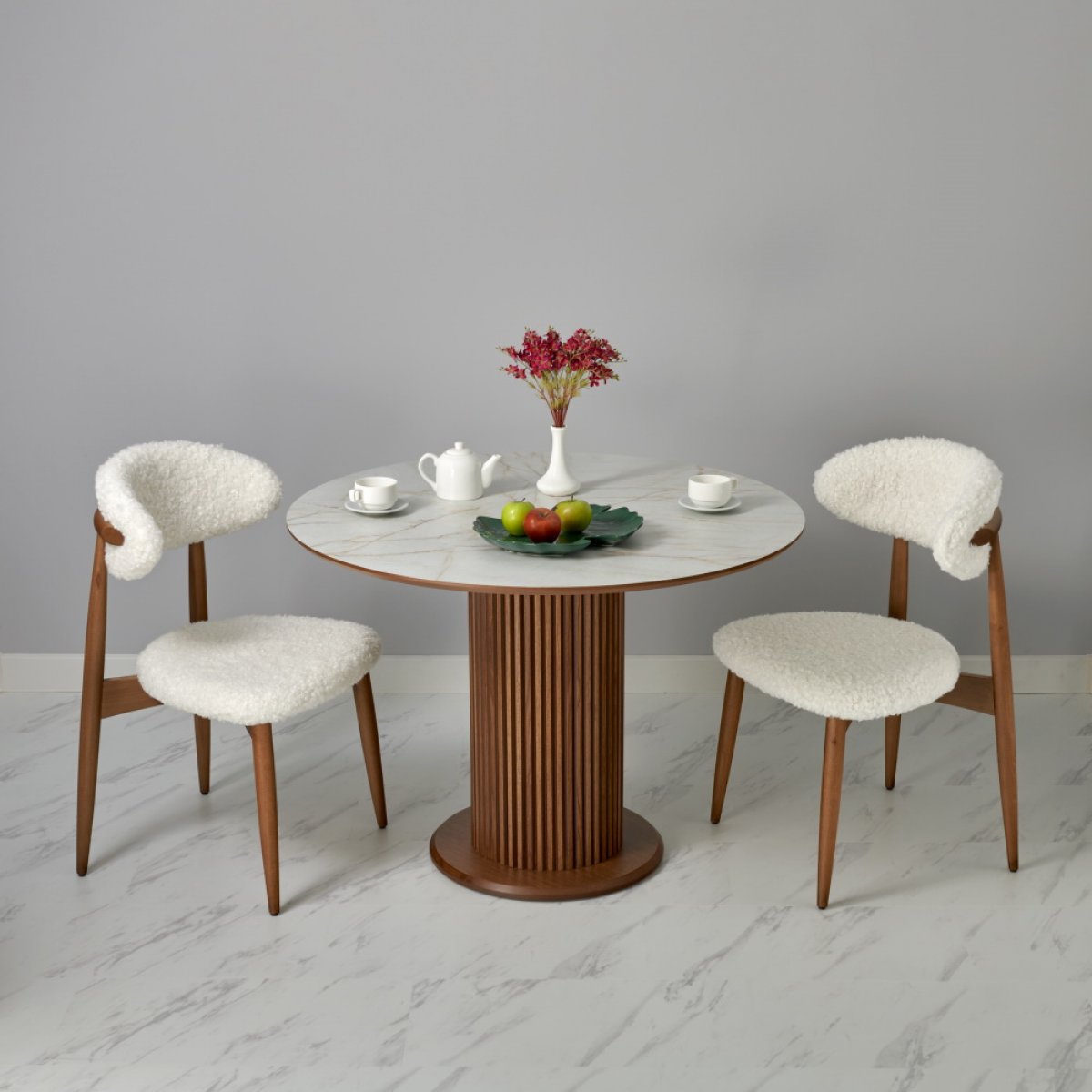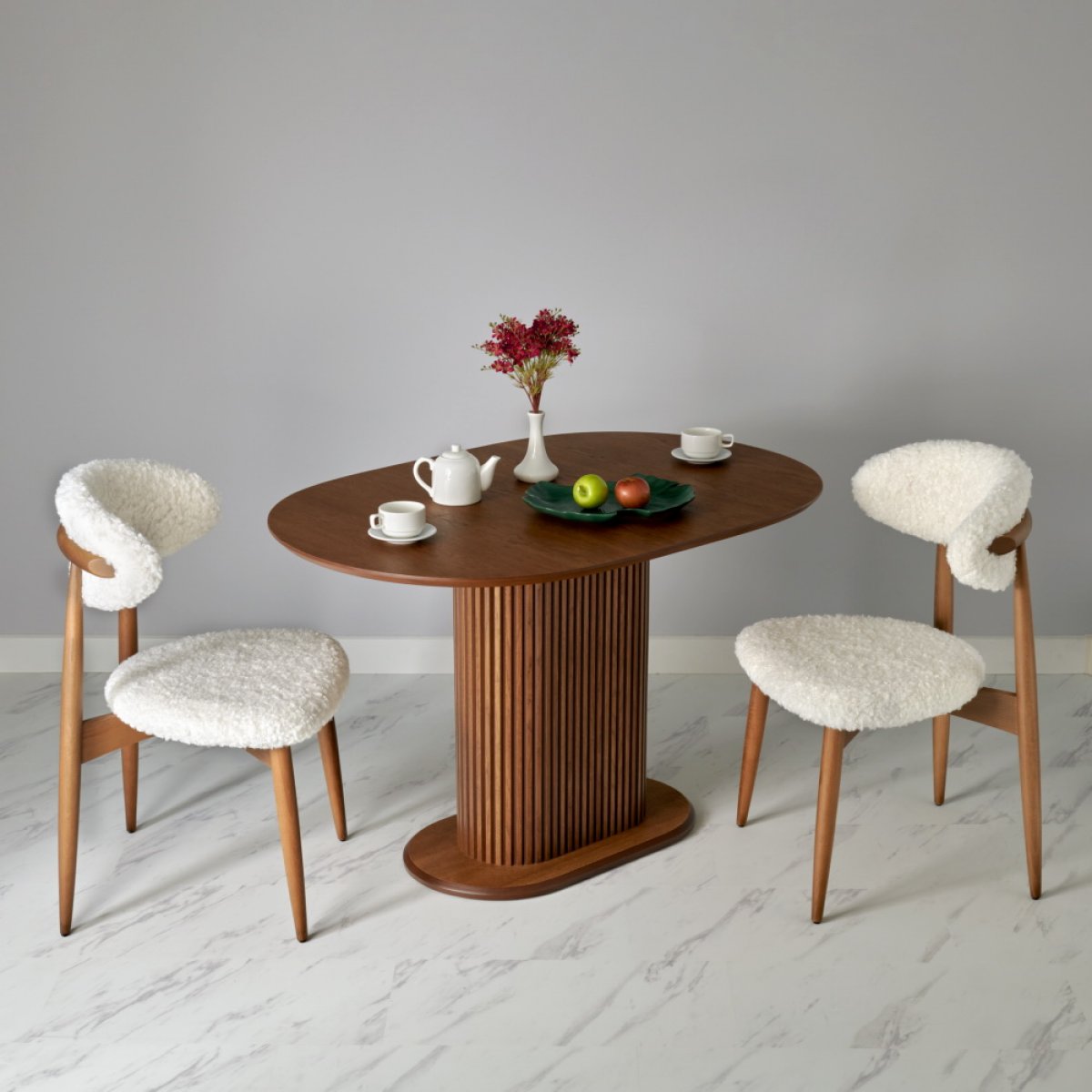 Сиденье и спинка изготовлены из искественного меха белого цвета. Мягкие спинка и сидение обеспечивают максимальный комфорт. Оригинальный каркас из массива натурального дерева в цвете орех добавляет стулу элегантность. Стулья из бука отличаются прочностью и надежностью.