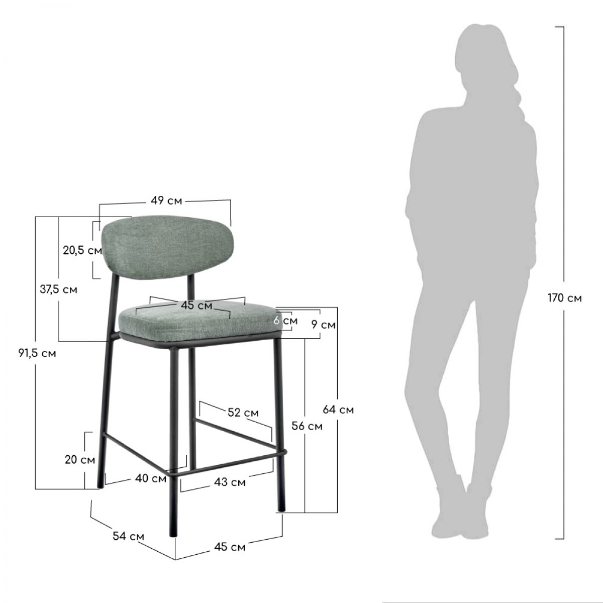 | Спецификация: | Материал: фанера, пенополиуретан, шенилл, металл Материал обивки: шенилл Материал ножек: металл Цвет ножек: чёрный Размер: 49х52х92,5 см Диаметр ножки 25,7 мм Высота сиденья: 65см Вес: 6,2кг Максимальная нагрузка 150кг Поставляется в разобранном виде. |